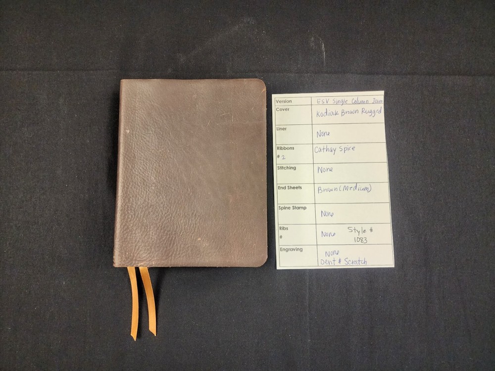 Leather Journaling Bible - ESV Single Column Journaling Bible - Rugged Leather Bible WHY THE RUGGED LEATHER JOURNALING BIBLE? This Bible style tells a story about the one carrying it; they may have a few rough edges, but they are strong, resilient, durable, and carry inside the most valuable possession one could own: God's very words. Carry around your own rugged leather copy of God's Word—full of notes, highlights, markings, and all—in this beautiful binding style. This rugged leather Bible is a single-column journaling Bible, ESV translation. The leather used is Kodiak Brown, a durable cowhide designed to last! OUR PROCESS Each Bible is hand-crafted from start to finish. We only source full-grain leather from the best of the best. You can trust that each Bible is cared for individually and given the utmost attention to every detail, from the measurements of each cut to the page quality on the inside. Also, each Bible is backed with our Lifetime Guarantee, so you can rest assured that your Bible will stay in tact for a lifetime! Features of the ESV Journaling Bible text block include: - Complete text of the ESV Bible - 2-Inch margins to write in - Single-column paragraph format - Cream-colored Bible paper - 7.5-point text size OUR MISSION It is our mission to help preserve God's Word in quality binding that will last for generations to come. Part of our heart is to help further the mission of spreading the Gospel to all nations. The way we've chosen to do this is to donate a portion of every sale to Wycliffe Bible Translators. More info on Wycliffe can be found here: https://www.wycliffe.org/about.