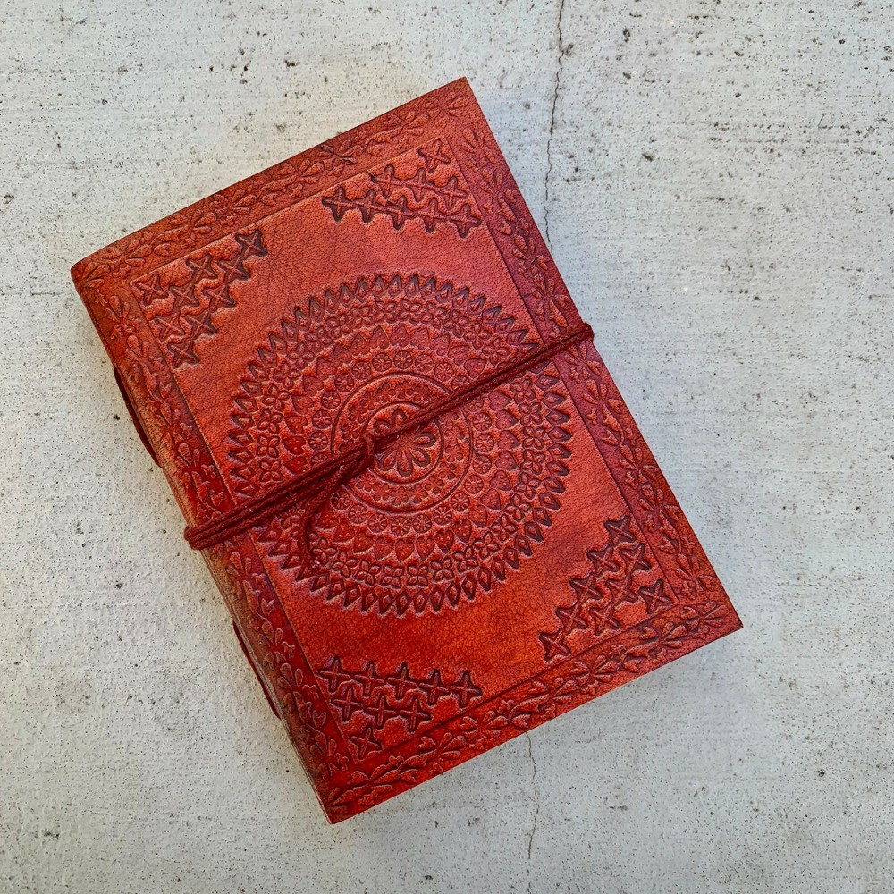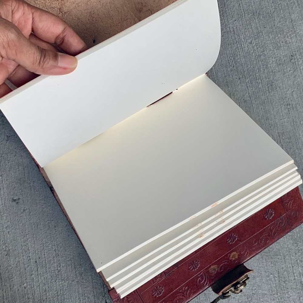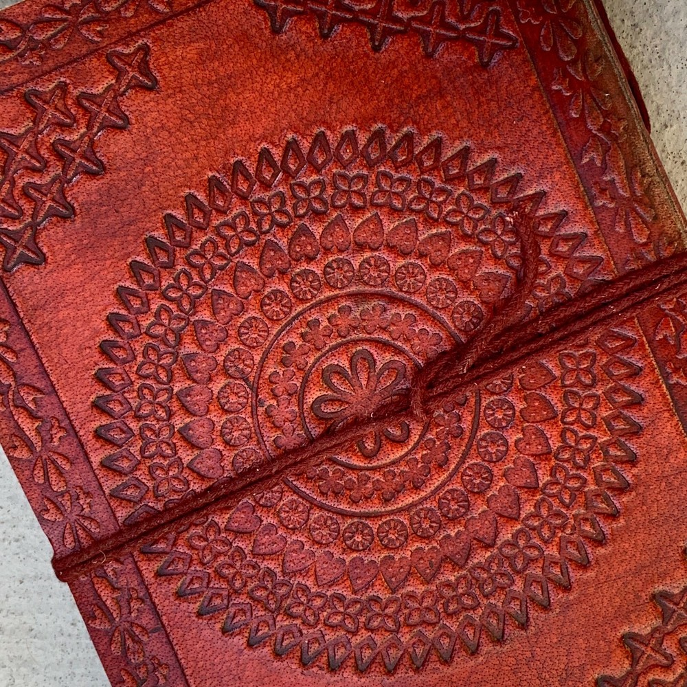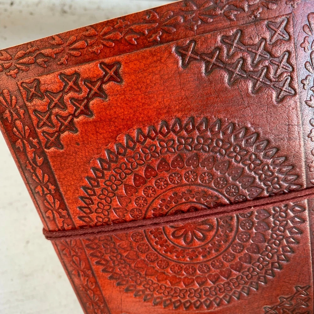 These journals are hand made from leather and hand embossed. The paper is naturally treated cotton paper which are best suited for writing, noting, jotting, sketching, doodling etc. Product Dimensions: Length - 7 in * Width - 5 in - 200 pages approximately Leather used: Bull hide or goat leather Paper Used: SAVE TREES with us - we use eco friendly recycled cotton paper (recycled 100% cotton rag) Since these journals are fully handmade, there could be slight variations in the embossing or sewing or color in every batch *****A little about these journals:******** We were lucky to once find a collection of vintage journals from the 1990's which was handmade and we immediately fell in love with them. Hence we have started to make our own line of journals with our own designs and the latest trendy designs. Each journals is designed and prototyped by me and then the rest of the process is handled by a production partner with help of necessary hand tools Each Journals is fully hand made! We create embossing plates for the designs and those designs are hand embossed on the leather and then they are hand sewn into books. The paper used in these journals are also handmade with cotton. ( Save trees with us as the papers are 100% recycled and handmade) My clients usage: Gifts for him , valentines gift, anniversary or wedding or housewarming gifts, home decor, modern home decor and many more these are ready to ship items and will ship within 1-2 business days. If you are an international customer, then I suggest to upgrade to Priority mail so that you can get the tracking number to track the shipment. PLEASE NOTE: If you wish to purchase more than one item at the same time, please send me a message to request if I could do a combined shipping cost.