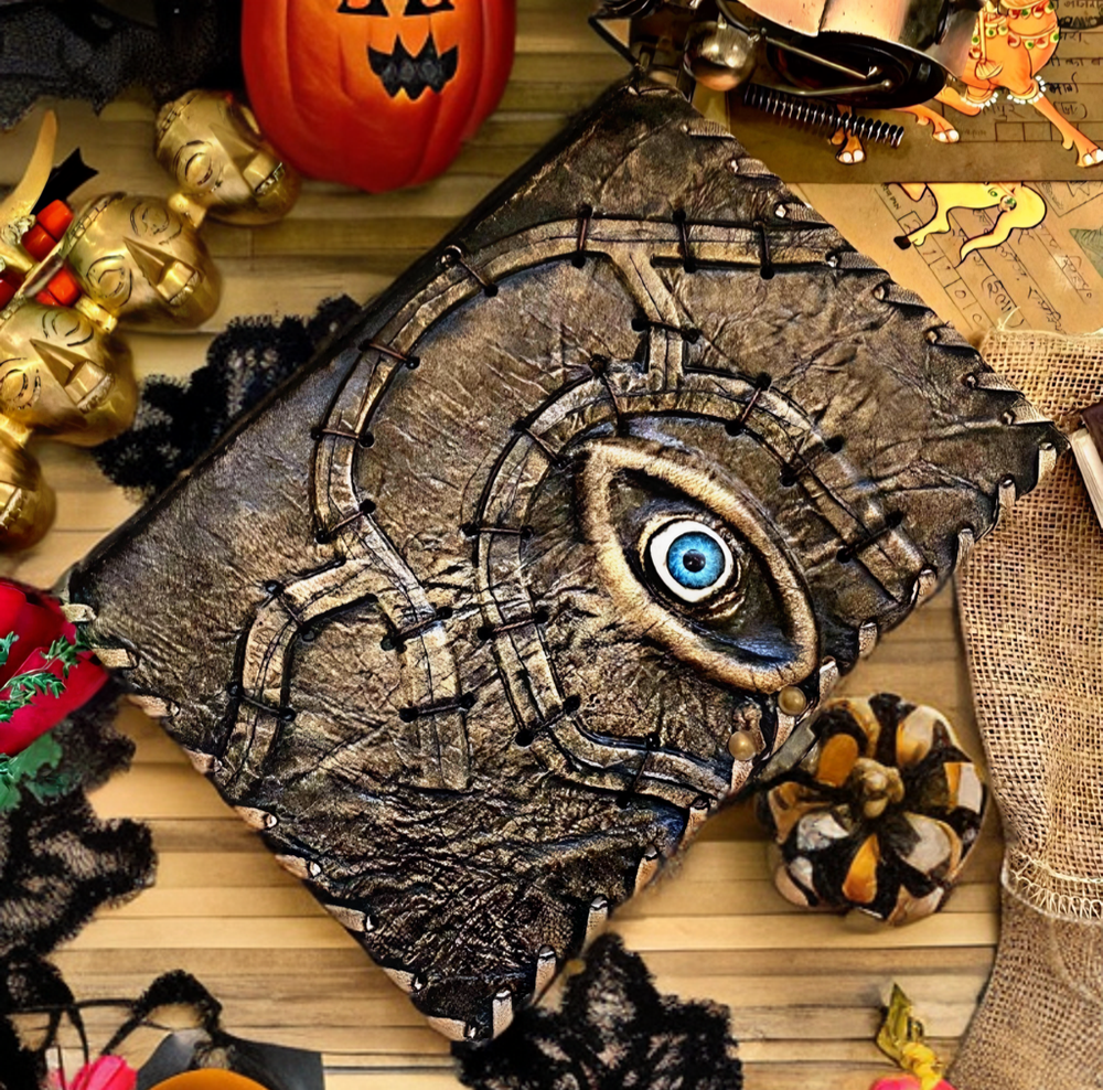 Hocus Pocus Book Antique Book of shadows Blank journal hocus pocus Eye Journal - leather notebook is made with 200 pages of Antique Deckle Edged Paper which looks like it was pulled from history. You will fall in love with the the antique handmade vintage paper which is unique to our spell book EXQUISITE & UNIQUE EYE STONE - Leather Bound Journal is antique made with a special stone called “Eye” which helps to reveal inner truth within yourself and encourage self-awareness and self expression. We have taken extra to make sure that the emboss is perfect in every piece. USE ANY KIND OF PEN - Sketch, Doodle, Write on your Leather Blank Spell Journal with a Calligraphy Pen Fountain Pen, Brush Pen, Ball Pen, Acrylic Colours, Watercolor and many more. We guarantee no bleed through. VINTAGE LOCK AND STURDY BINDING - The vintage clasp lock will keep all your valuable writing locked inside.Sturdy hand stitched binding to make sure that no paper comes out loose from your vintage notebook. Many Uses - Can be used as a notepad, journal, writing notebook, sketch book. 1.25 inch thickness, easy for handwriting, drawing or sketching and compact for carrying in your bag. Ideal for alternative Artist Sketchbooks, Photo Album, Traveling Notes, Business Executive, Logbook, Poetry Work, Journalists, Food Planner, Instagram Scrapbook and Bible Journaling. Unique Clasp Lock Easy To Open - Stylishly Medieval - Ancient looking rustic cotton unlined paper combined with the beauty of distressed leather, hand stitched by Artisans, creates a keepsake you will cherish forever. Makes a great gift for the men, women, and wiccans in your life!
