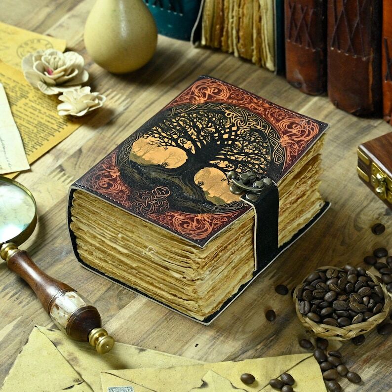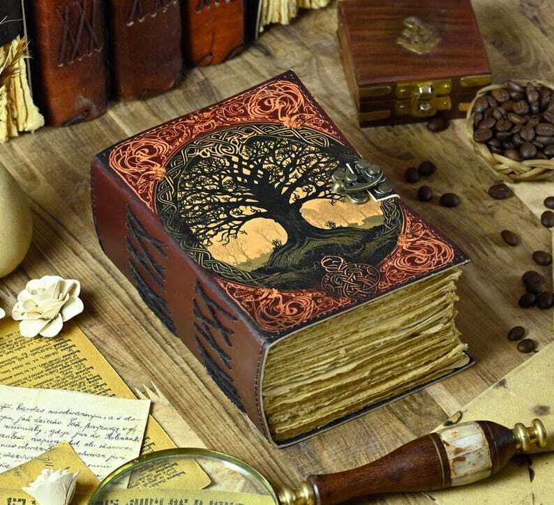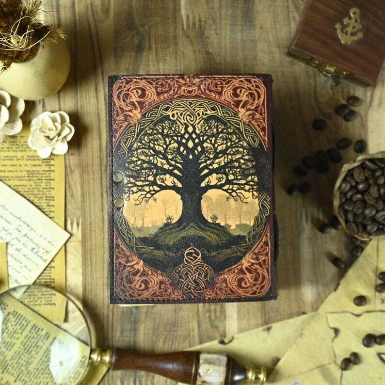 Printed Tree of Life Leather Journal - Notebook! A5 Notebook! Leather Grimoire! Book Of Shadows! Recipe Notebook! Birthday Gift for Him 🔹 Key Features: • C-Lock brass • Genuine Leather • Vintage Look deckle paper. Size - 7x5 Inches, 8x6 Inches, 10x7 Inches ● Leather journal witchcraft book of shadows notebook is made with Antique Paper which looks like it was pulled from history. You will fall in love with the antique handmade cotton paper which is unique to our Vintage Journal Notebook. ● The vintage clasp lock will keep all your valuable writing locked inside. Sturdy hand stitched binding to make sure that no paper comes out loose from your spell notebook. ● Sketch, Doodle, Write on your Leather Blank Spell Journal with a Calligraphy Pen Fountain Pen, Brush Pen, Ball Pen, Acrylic Colors, Watercolor and many more. We guarantee no bleed through. Tree of Life Journal Leather Tree Notebook Handmade Journal Vintage Style Diary Nature Inspired Notebook Tree Print Journal Leather Bound Notebook Mystical Journal Forest Journal Witchy Journal