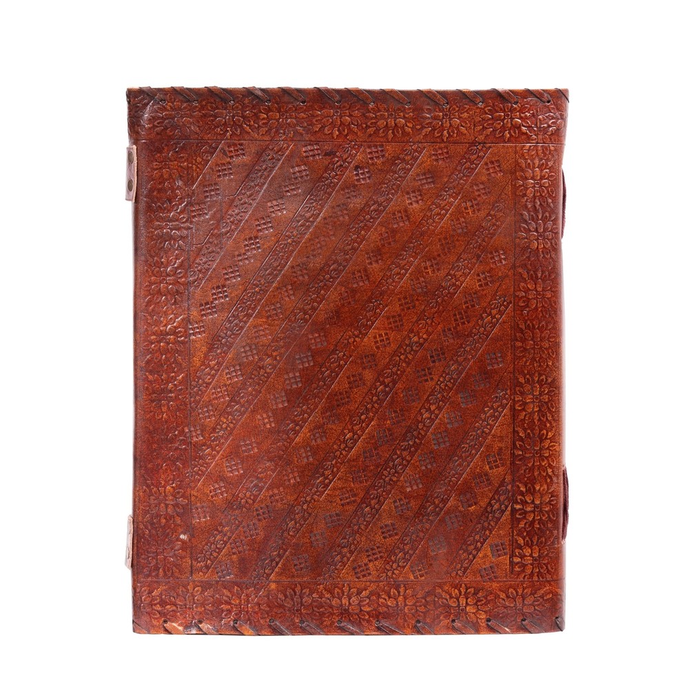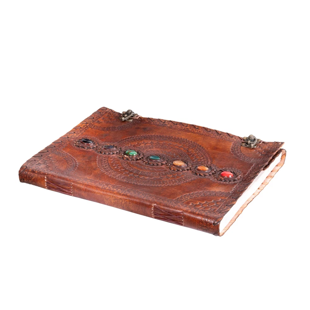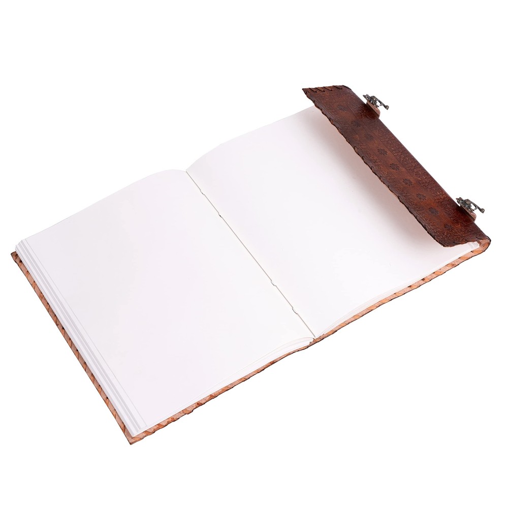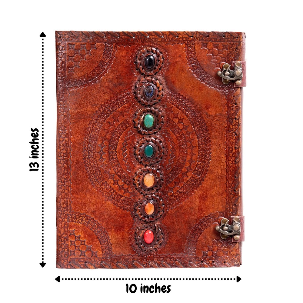 Description Features: Size - 13 X 10 inches |200 Recycled Thick Pages |Pure Leather High quality | Acid-free paper | Made of recycled biomass | Hand embossed 7 Semi-precious stones (Stones may vary) | Papers perfectly suited for accepting charcoal, pen, pencil, or even paint. Double Brass C-Lock to keep your thoughts safe and organised |Very Fine Hand embossing done on the Leather flaps | Lay flat for easy writing Leather strap stitching at the boundary adds up to the leather strength at the same time giving this journal a significant appearance Product Details: Brand: Hell Blues Color: Brown Theme: Book Sheet Size: 14 x 10 inches Pages: 200 Pages Cover Material: Leather Style: Antique Ruling Type: Plain Special Feature: Lock Product Dimensions: 13"L x 13"W x 1.5"Th Manufacturer: Hell Blues Brand: Hell Blues Item Weight: 2.6 pounds Product Dimensions: 10 x 14 x 2.5 inches Is Discontinued By Manufacturer: No Color: Brown Cover Material: Leather Material Type: leather Number of Items: 1 Size: 13" X 10" Ruling: Plain Sheet Size: 14 x 10 inches Date First Available: September 7, 2017 Handling We will ship all orders within 3 business day of payment. Delivery We Do Not Ship Outside of the Continental US. Return Policy All items qualify for returns within 30 days of receipt. Buyer is responsible for return shipping on any item that is not damaged. Feedback We take our reputation seriously, we buy and sell online, so we understand the value of trust. If you are unsatisfied with your order, please contact us and we will work with you to resolve it to your satisfaction.