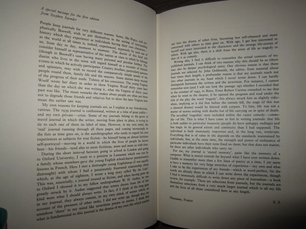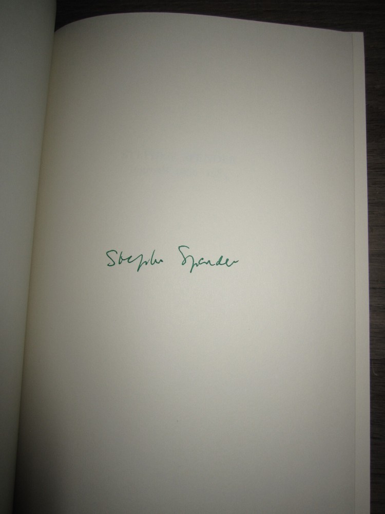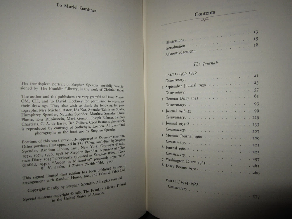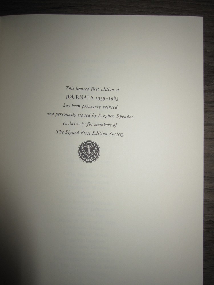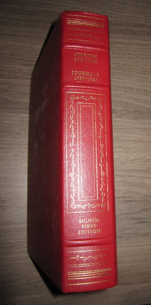Leatherbound book, Stephen Spender, Journals 1939-1983, edited by John Goldsmith, 1985. Published by The Franklin Library. Limited first edition, signed by Spender. Measures 6 1/2" x 9 1/2". Minor wear as shown in photos. Sent to you from my smoke and pet free household in the US. No returns except in cases of incorrect info (I do my best to list all defects clearly, but I do occasionally miss things). Please see my other listings - now with FREE domestic shipping on all items! ***If you would like to pay for expedited shipping, I typically use USPS Priority by default. If you prefer FedEx / UPS, just let me know. Please wait to pay until you receive an updated invoice with the shipping charge.***