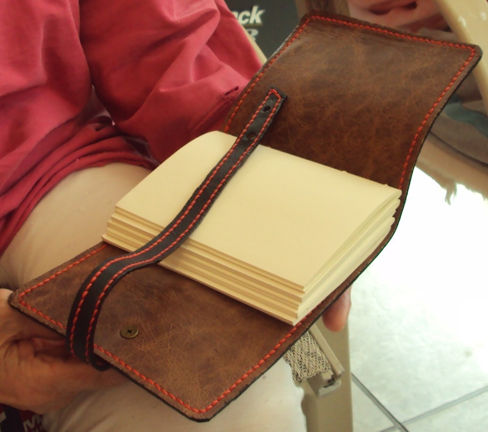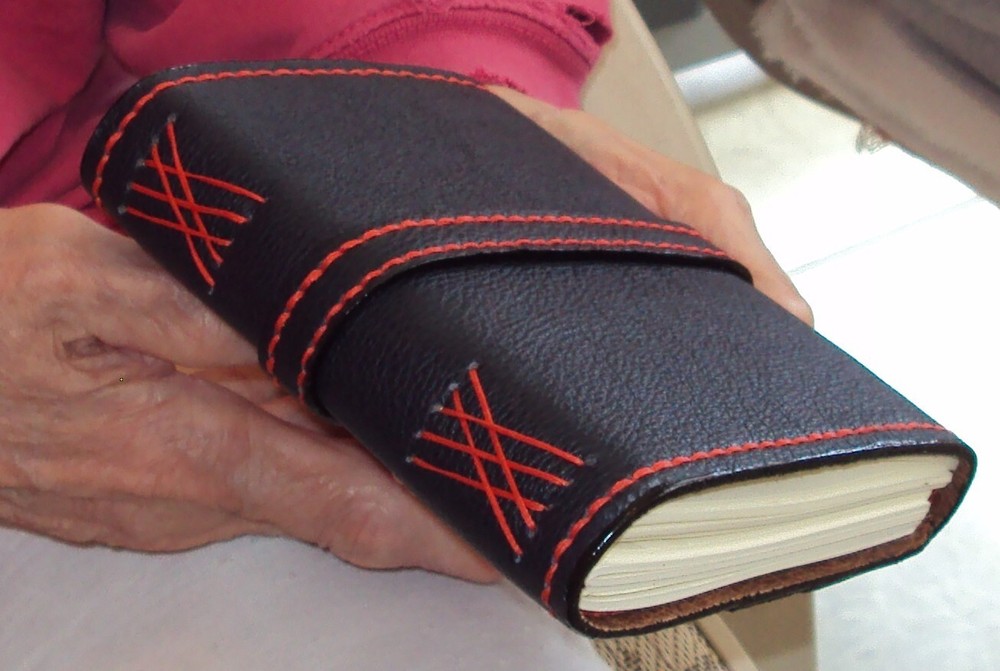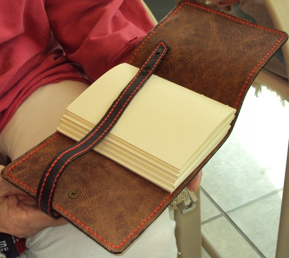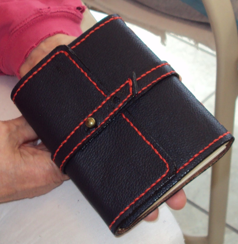 Leather journal handmade. Black exterior, Brown interior, Red thread. Size is approx. 4"x5", with 75 pages of soft white paper. Would make a wonderful Christmas gift....