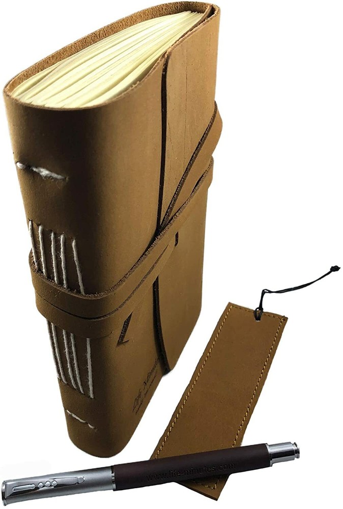 WHILE OTHER JOURNALS are mass produced using cheaper, thinner leather or chemically treated wood-based paper; our Life Minutes journal is HANDMADE BY ARTISANS utilizing a thicker, PREMIUM QUALITY LEATHER which makes your journal more SOFT, DURABLE & SUPPLE. This is combined with handmade THICK, RECYCLED COTTON PAPER which is free of acid and does NOT BLEED THROUGH, giving you an exceptional writing experience in a journal designed to LAST A LIFETIME. Having trouble finding the PERFECT GIFT for that important person in your life? Someone thoughtful, and intelligent, but HARD TO SHOP FOR? Our Life Minutes notebook is GUARANTEED TO IMPRESS. This is a gift that will satisfy the recipient. A UNIQUE and SUSTAINABLE gift that will be cherished. Offered by a BOUTIQUE American brand that emodies the CLASSIC elements of TIMELESS DESIGN. Embark on a new adventure! It may be TRAVEL, a new RELATIONSHIP, or a LIFE TRANSFORMATION. You need a journal that is WORTHY of your ideas and thoughts, that will make you FEEL SPECTACULAR every time you open it. Our Life Minutes journal offers the most BEAUTIFUL WRITING EXPERIENCE, satisfying to your senses with its LUXURIOUS feel, top notch CRAFTSMANSHIP and its bold GENUINE LEATHER scent. BUY WITH COMPLETE CONFIDENCE - We pride ourselves on having exceptional customer service and provide a 100% MONEY BACK GUARANTEE. Our customers are at the heart of everything we do. We know the quality of our products and we want you to have the best possible. This is the perfect leather bound journal for a travel diary, for recipes, as a writing notebook, time management, bible journaling, poetry or a daily planner. If you are not satisfied then we will MAKE IT RIGHT or REFUND you. Enjoy this luxurious and ECO-FRIENDLY hand crafted journal. There is NO LEAD OR ARSENIC used during the leather tanning process. We ensure to use 100% NATURAL materials in the most sustainable way possible. Our excellent paper is made from RECYCLED cotton - this not only adds a nice feel to the paper, it also uses wasted materials from the fashion industry to create something usefull and beautiful. Every day many of us take things for granted. Take a look around you, think about how you spend your time; as we call them, your LIFE MINUTES! Often times we get caught up in things that seem important, only to ignore what actually is important. Have your priorities become out of place? We want to help people remember how to focus on what truly counts!