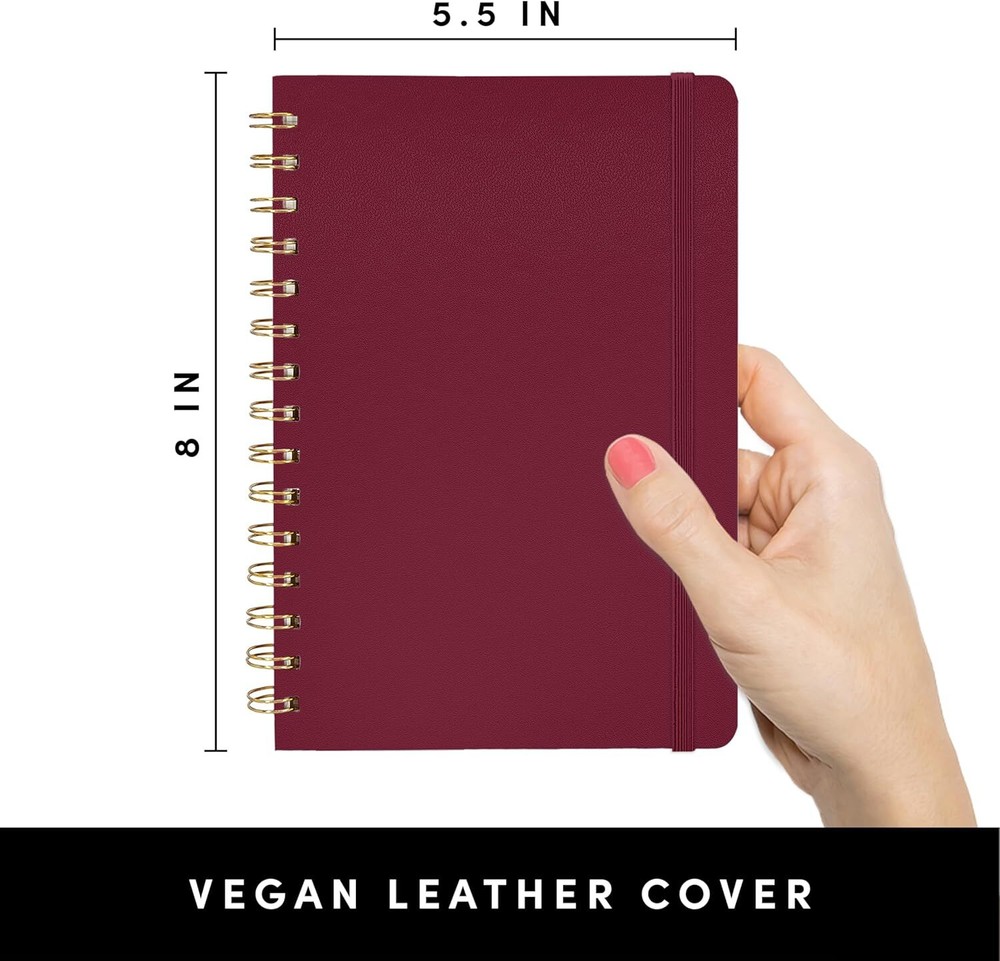 5.5 in by 8 in Faux Leather Spiral Journal Core Parameters Material: Faux Leather Size: Lined - Pack of 3 Color: Burgundy, Navy, Olive Green Weight: 2.07 Pounds (0.94 kg) Technical Specifications • HARDCOVER SPIRAL JOURNAL: This medium 5.5 in by 8 in lined spiral journal notebook features durable and water-resistant vegan leather cover, rounded corners, 160 pages, inner expandable pocket, sticker labels, ribbon bookmark & elastic closure band. • PREMIUM PAPER: Made with high-quality, 100 gsm acid-free paper in light ivory color, our journal paper is thicker than average notebooks & writing pads, so you can confidently use most pens, pencils, and markers without ghosting and bleed-through. • STURDY SPIRAL WIRE BINDING: Our wire-bound spiral journal notebook has a sturdy gold-color double wire spiral with easy-to-turn pages. It’s the perfect notebook for journaling, note taking, and planning. Multipack includes 3 notebooks. • VIBRANT & BOLD COLORS: Our 3 pack of journals are designed in a variety of beautiful and fun colors making them a perfect school, college or work notebook. Also available in 1 pack. • INNER POCKET & STICKER LABELS: Includes an expandable inner storage pocket to keep track of appointment cards, notes, receipts, and more. Personalize your journal cover & spine with the sheet of sticker labels included. Package Information Package Dimensions: 5.5 x 8 x 0.63 inches (13.97 x 20.32 x 1.6 cm) Package Weight: 2.07 Pounds (0.94 kg)