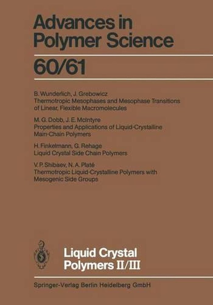 The Nile on eBay Liquid Crystal Polymers II/III by M. Gordon, N.A. Plate, M.G. Dobb, H. Finkelmann, J. Grebowicz, J.E. McIntyre, G. Rehage, V.P. Shibaev, B. Wunderlich FORMAT Paperback LANGUAGE English CONDITION Brand New Table of Contents Thermotropic mesophases and mesophase transitions of linear, flexible macromolecules.- Properties and applications of liquid-crystalline main-chain polymers.- Liquid crystal side chain polymers.- Thermotropic liquid-crystalline polymers with mesogenic side groups. Promotional Springer Book Archives Details ISBN 3662159708 Short Title LIQUID CRYSTAL POLYMERS II/III Pages 266 Series Advances in Polymer Science Language English ISBN-10 3662159708 ISBN-13 9783662159705 Media Book Format Paperback Year 2013 Imprint Springer-Verlag Berlin and Heidelberg GmbH & Co. K Place of Publication Berlin Country of Publication Germany Edited by M. Gordon DOI 10.1007/3-540-12994-4 UK Release Date 2013-10-03 Publication Date 2013-10-03 Illustrations 50 Illustrations, black and white; IX, 266 p. 50 illus. Author B. Wunderlich Publisher Springer-Verlag Berlin and Heidelberg GmbH & Co. KG Edition Description Softcover reprint of the original 1st ed. 1984 Alternative 9783540129943 DEWEY 530.429 Series Number 60/61 Audience Postgraduate, Research & Scholarly We've got this At The Nile, if you're looking for it, we've got it. With fast shipping, low prices, friendly service and well over a million items - you're bound to find what you want, at a price you'll love! TheNile_Item_ID:96355895;