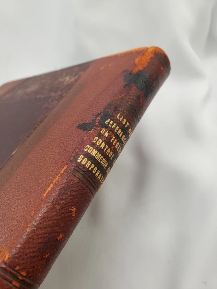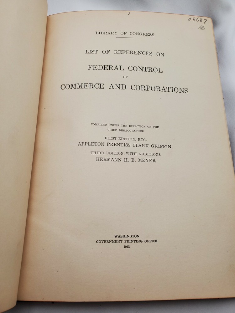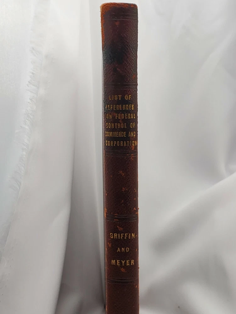 List Of References On Federal Control Of Commerce An Corporation 1913 Book. It's in OK condition, some fraying to the corners, and wear and discoloration. This is the third printing of the book being revised in 1913. 7.25 inches wide, 10inches long Always happy to answer any questions or add additional photos. Flat $4 media mail shipping in the US. We don't normally ship overseas but you can contact us if you would like. Also if you are waiting for something else to close to combine the shipping just let me know. Thanks for looking