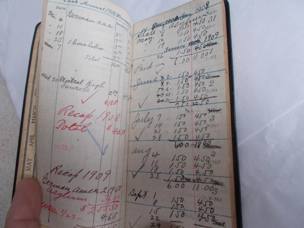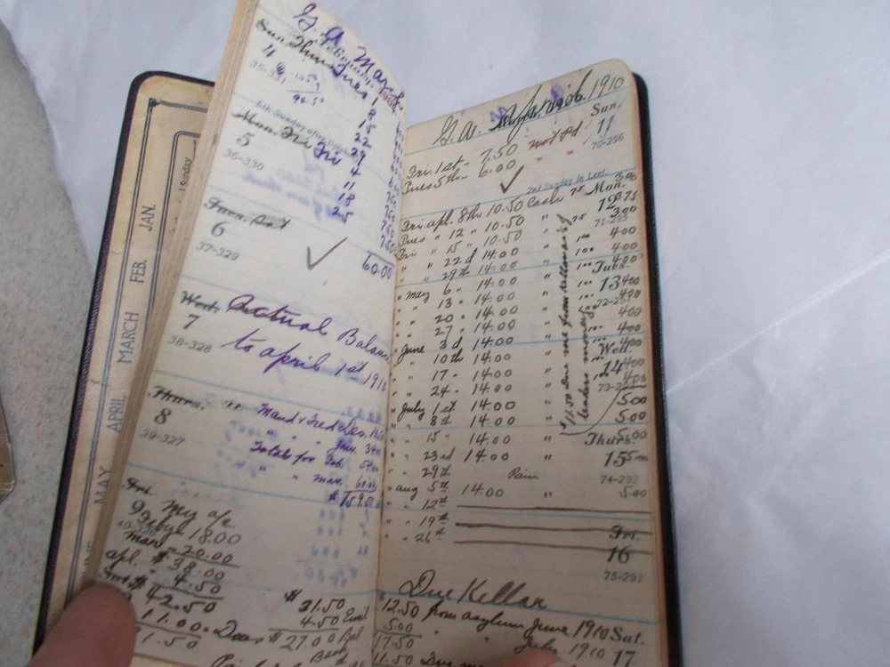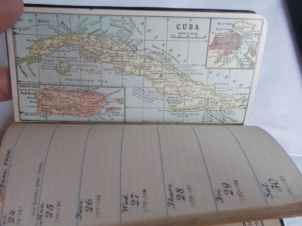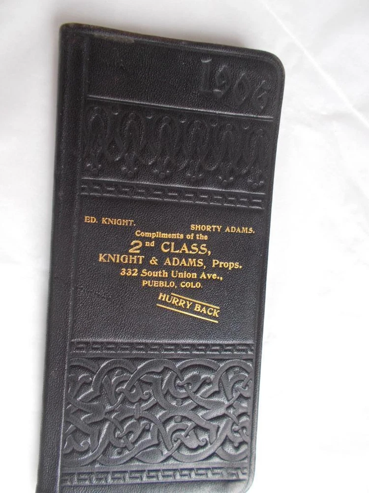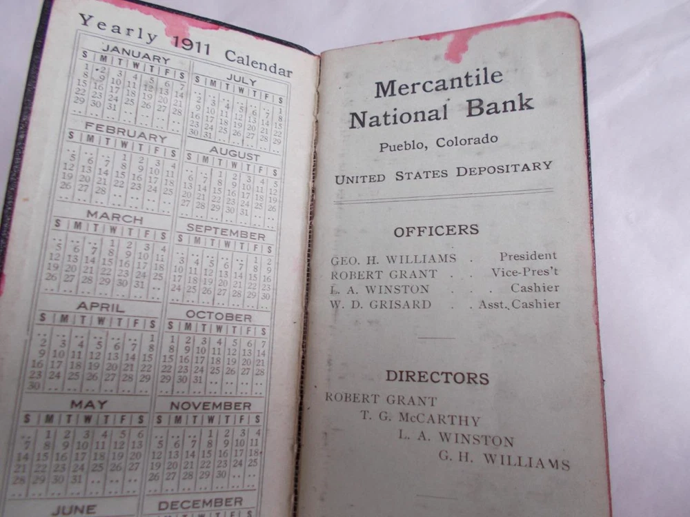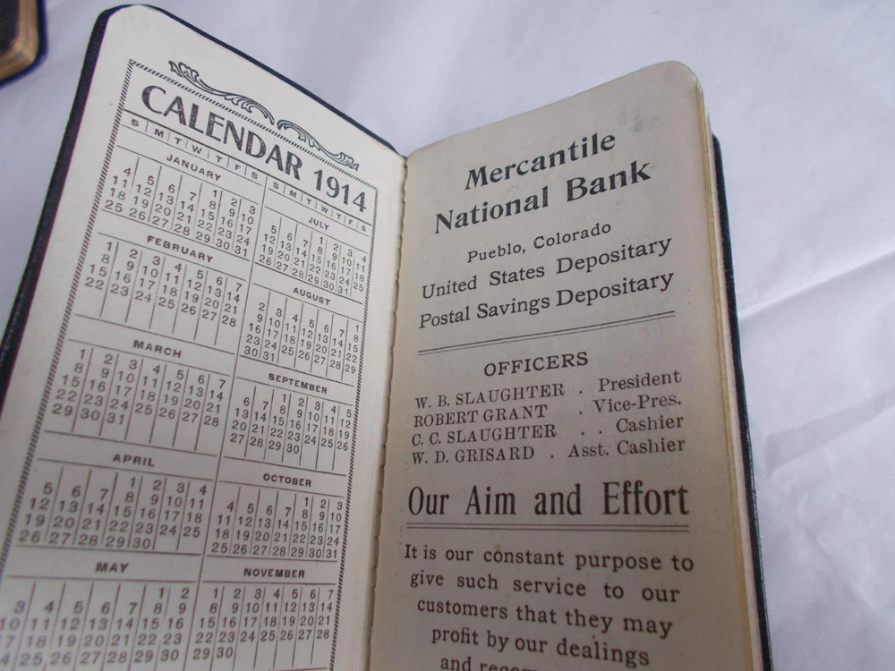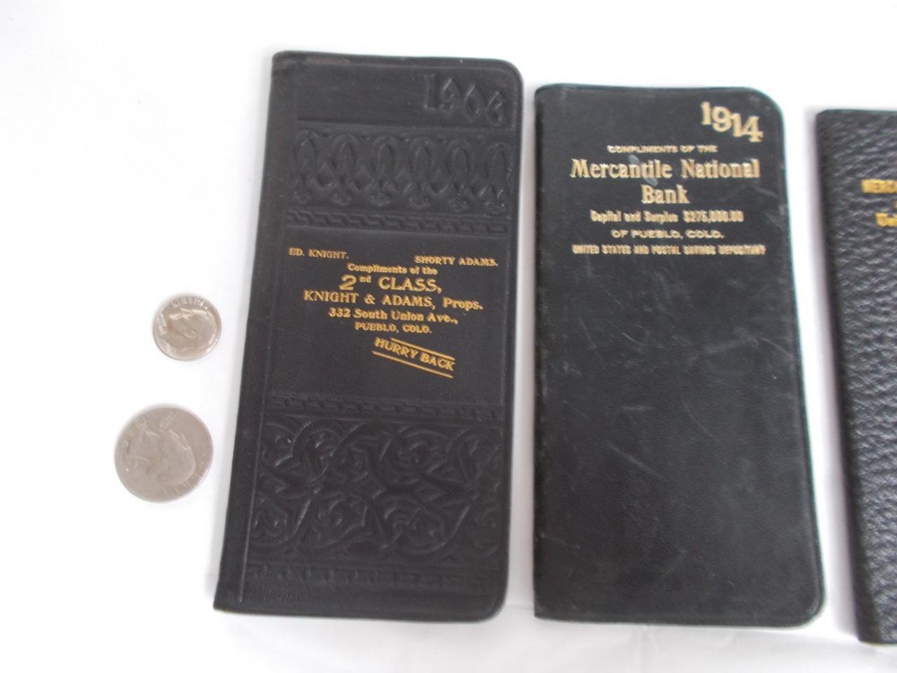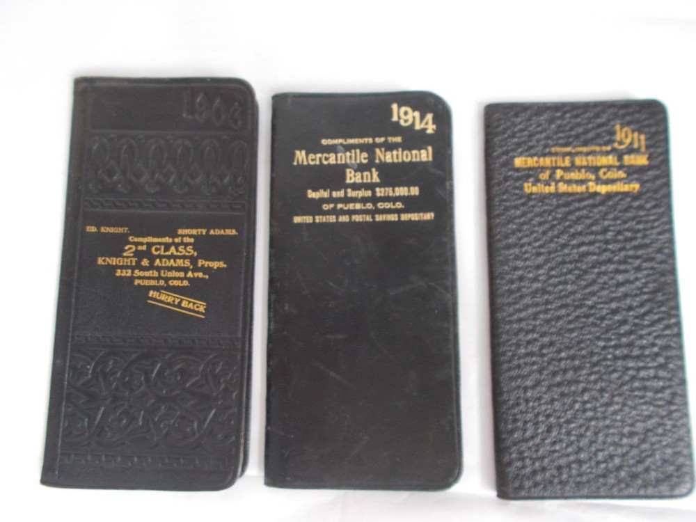 3 daily journals from the early 1900's. 1 with 8 pages of maps is 1906 embossed leather with very strong gold paper edges and gold printing on the cover, 2nd class Knight & Adams, Pueblo, Co. has lots of notations and expenditures. 1911 with a textured leather bound cover is a give a way from Mercantile National bank of Pueblo, Co. with lots of notations and expenditures also. Red edge on pages. 1914 smooth leather cover is also from Mercantile National in Pueblo. It has less writing in it and the gold on the edges is more worn. All 3 are 2 1/2" x 5 1/2" Lot 3 DAILY JOURNALS 1906-1914 BANK Give aways PUEBLO CO LEATHER small antique Lot 3 DAILY JOURNALS 1906-1914 BANK Give aways PUEBLO CO LEATHER small antique Click images to enlarge Description 3 daily journals from the early 1900's. 1 with 8 pages of maps is 1906 embossed leather with very strong gold paper edges and gold printing on the cover, 2nd class Knight & Adams, Pueblo, Co. has lots of notations and expenditures. 1911 with a textured leather bound cover is a give a way from Mercantile National bank of Pueblo, Co. with lots of notations and expenditures also. Red edge on pages. 1914 smooth leather cover is also from Mercantile National in Pueblo. It has less writing in it and the gold on the edges is more worn. All 3 are 2 1/2" x 5 1/2" View My Other Items For Sale Add me to your Favorite Sellers cmptrRmShlf2C Images sell! Get Supersized Images & Free Image Hosting Create your brand with Auctiva's Customizable Templates. Attention Sellers - Get Templates Image Hosting, Scheduling at Auctiva.com. Track Page Views With Auctiva's FREE Counter