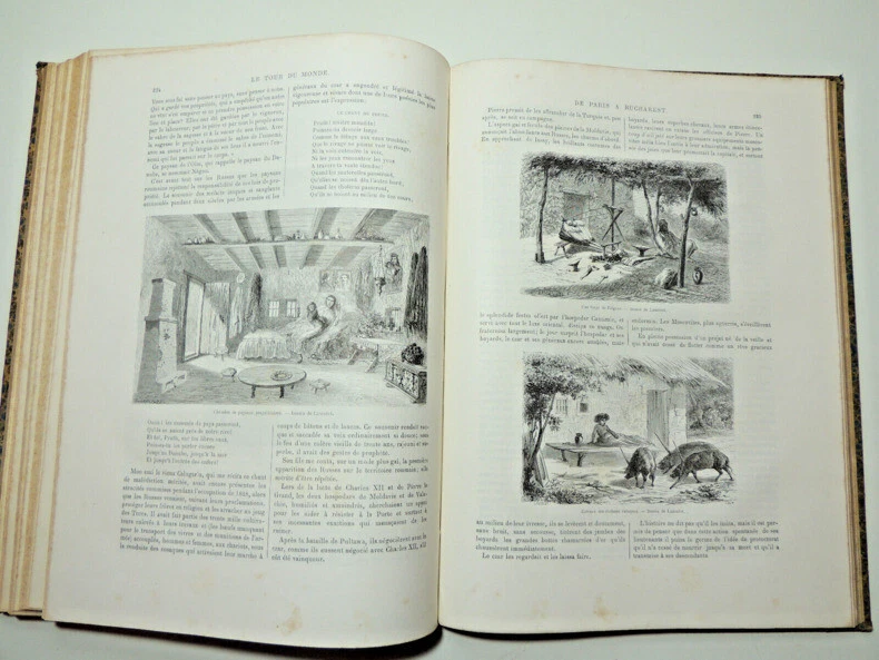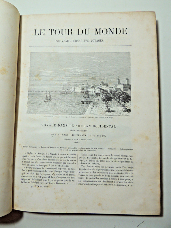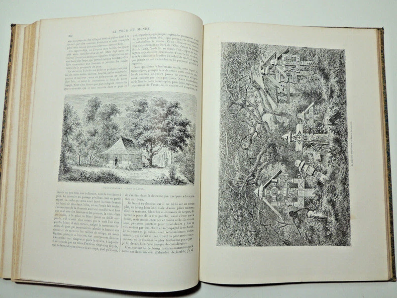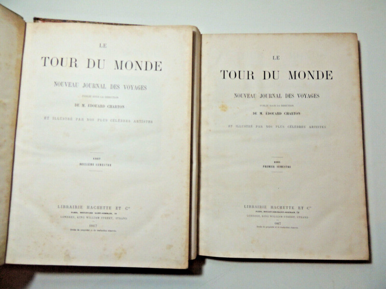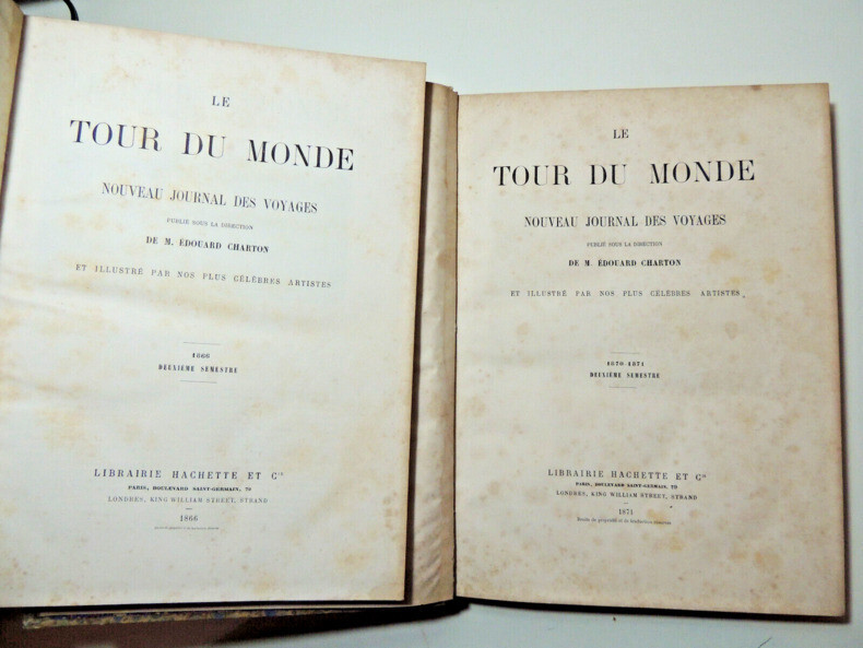 Lot de 4 LE TOUR DU MONDE , Nouveau Journal des voyages publié sous la direction de M.Edouard Charton et illustré par nos plus célèbres artistes 1870/1871 (2e semestre) 1867 ( 2e semestre) 1866 ( 2e semestre) 1868 ( 1e semestre) volumes in-4, relié 32x25cm, demi veau glacé, légers frottements, texte sur 2 colonnes, qq rousseurs, beaux exemplaires, environ 400pp par volume. d'autres tomes en vente, groupez les achats ! .