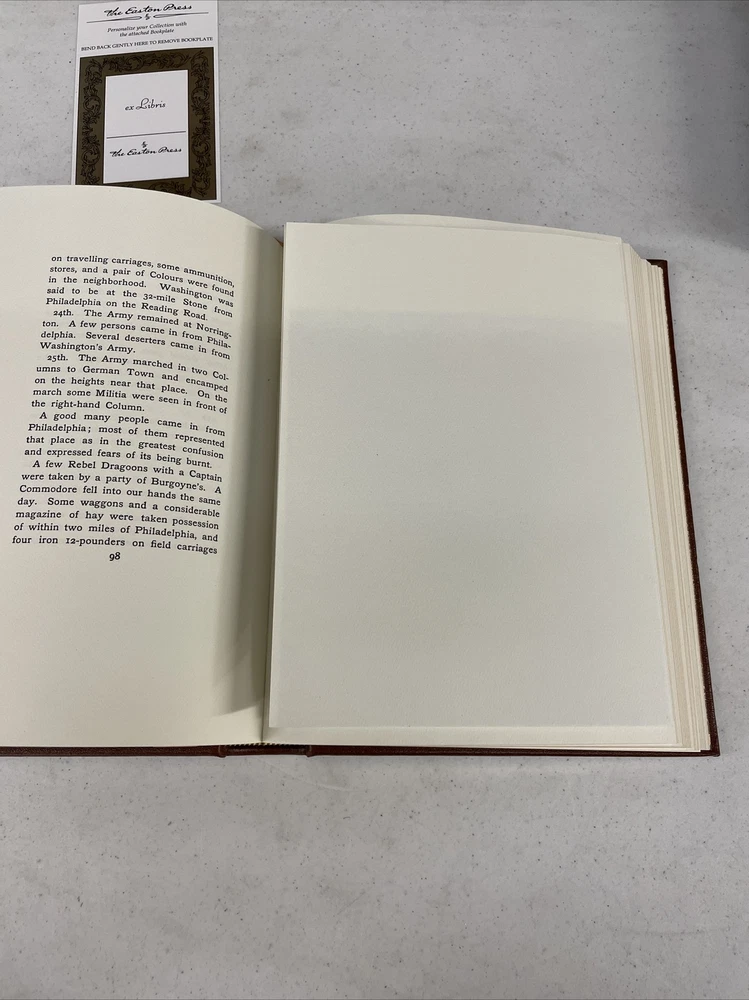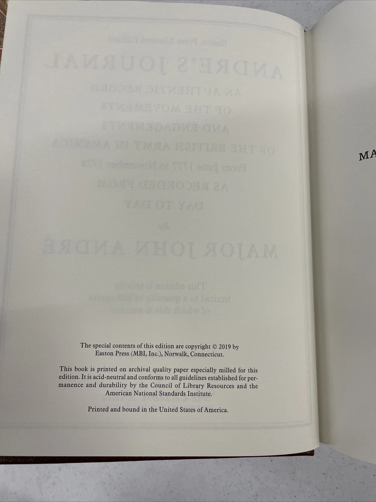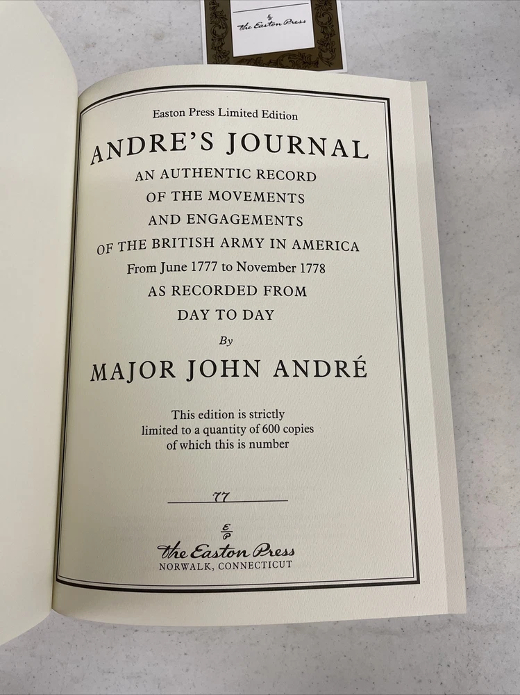 MAJOR ANDRE'S JOURNAL DELUXE LTD ED - Easton Press - AMERICAN REVOLUTION. This book is truly a masterpiece. It’s Easton press and has maps inside of it. You can tell how intricate this book is even just from the pictures. The book is like new, I don’t believe it’s even been opened besides me. However the book box has signs of wear, this is shown in the pictures. Message if you have any questions.