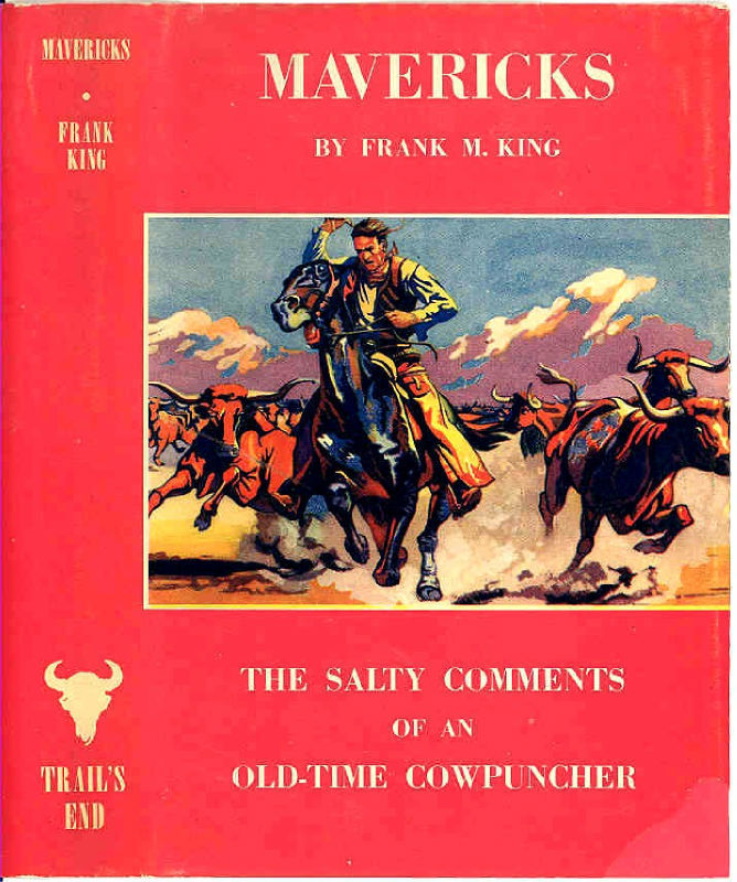 MAVERICKS- DELUXE, SIGNED, LTD. ED. BY FRANK KING 1947 Click to Enlarge Click to Enlarge Click to Enlarge MAVERICKS - The Salty Comments of an Old-Time Cowpuncher by Frank M. King. Pasadena 1947, First Edition, Signed, Numbered, Limited Edition of 350 Copies. Deluxe Edition with red leather covers, book is in excellent condition. Chip in lower left corner of d.j. (mended). Illustrations by Charles M. Russell, Index, 275 pages. SCARCE. The author's salty comments as a writer for the Western Livestock Journal, his Maverick column was well read. King wrote about cowboys and the cattle industry, his personal knowledge of the men of the old west, good & bad, with the likes of Charles Goodnight, Buffalo Bill Cody, John P. Clum, Pete Kitchen, Jeff Milton, Will James, Wyatt Earp, Joe Le Fors, etc. and the bad men with the likes of John Wesley Hardin, Doc Holliday, Billy The Kid, Tom Horn, Buckskin Frank Leslie, Pancho Villa, etc. We can combine shipping on multiple orders. I will notify you when item has been shipped. . Payment is due within 3 days. California residents please add 9.75% Sales tax. Dealers must supply a signed resale card. Once you receive your order, please leave feedback and I will do the same for you. DO NOT DUPLICATE OR COPY! Template Made By: © InkFrog.com Auction Templates, Logos, Store fronts and more! inkfrog terapeak i000000