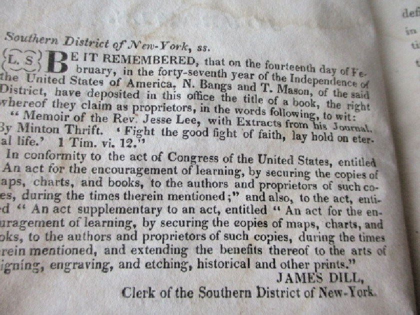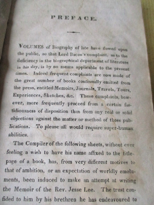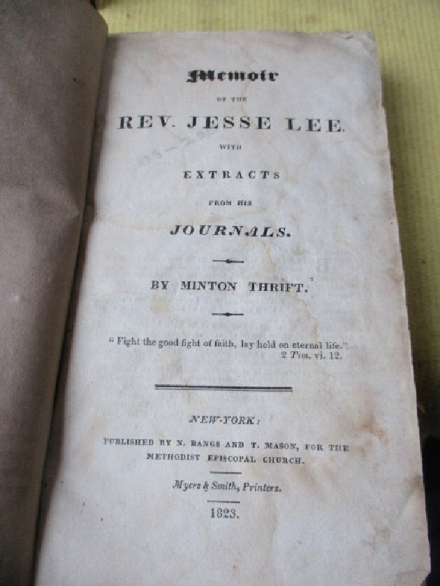 cr115. Jesse Lee's Memoir and extracts from his journals. Pub'd. N.Bangs and T.Mason for Methodist Episcopal Church, NY., 1823. First Edition. 7" tall, 300 pages, full calf covers, replaced front cover. Owner's nameand 1829 on rear end paper. Text is tight and clean. Acceptable condition. PLEASE NOTE: This book has rudimentary repairs......not professional, but with enough skill to make it serviceable. Do not hesitate to e-mail with any questions. As Always, Satisfaction Guaranteed! I expect to receive payment within 10 days, unless we have made other arrangements. Shipping will be USPS Media mail or Priority, if requested. I'm glad to combine multiple purchases in order to minimize shipping costs. I WILL SHIP INTERNATIONALLY, and I try to be as economical as possible with the shipping costs. RETURN POLICY: Satisfaction Guaranteed! Track Page Views With Auctiva's FREE Counter