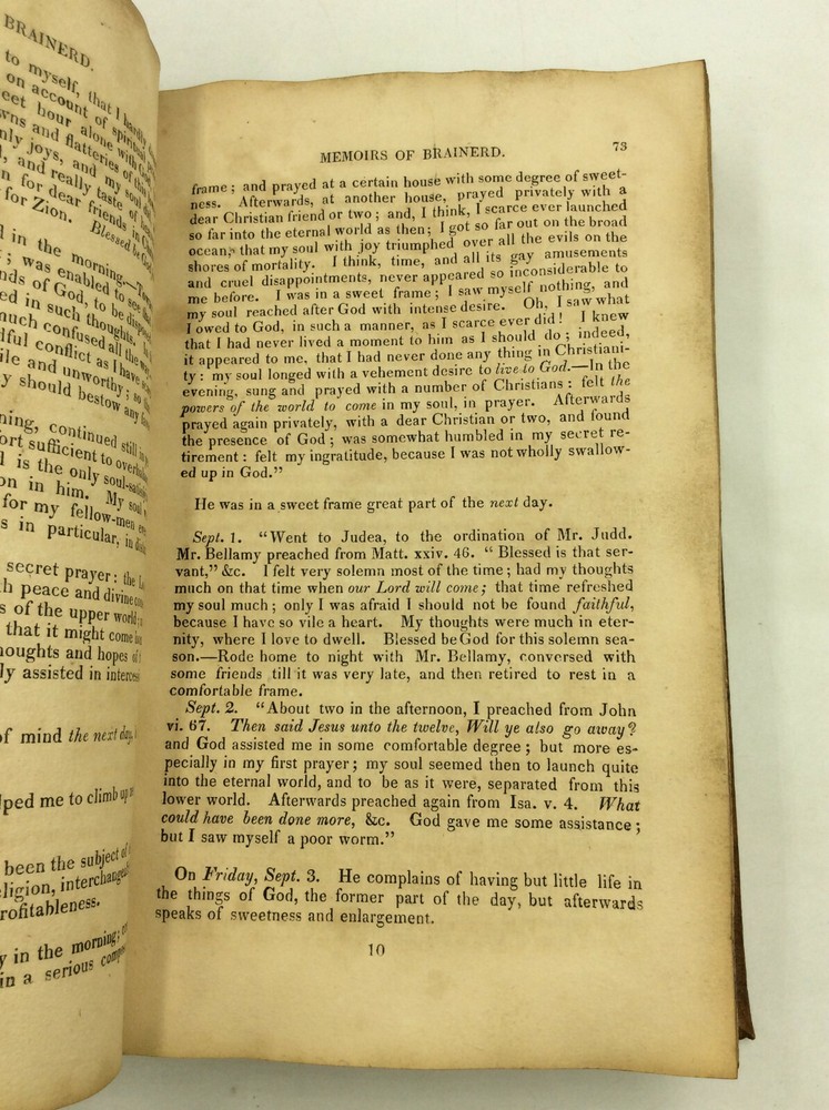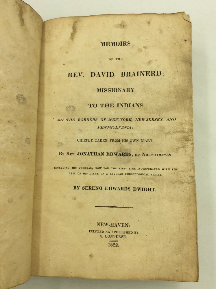 Sereno Edwards Dwight MEMOIRS OF THE REV. DAVID BRAINERD; Missionary to the Indians on the Borders of New-York, New-Jersey, and Pennsylvania: Chiefly Taken from His Own Diary. By Rev. Jonathan Edwards, of Northampton. Including His Journal, Now for the First Time Incorporated with the Rest of His Diary, in a Regular Chronological Series. New Haven: S. Converse, 1822. Leather. 507p. REBOUND. A hardcover book that has been rebound in modern brown leather with new endpapers. Pages wrinkled and browned, and most have some grayish soiling along the edges. Neat signature of an early owner on one of the original front endpapers. Occasional marginalia, apparently also by an early owner. Text is easily legible and binding is tight. A sturdy copy in good reading condition and externally attractive. Item #175122 A combination of Brainerd's journal (first published in 1746) and Edwards' biography (first published in 1749).