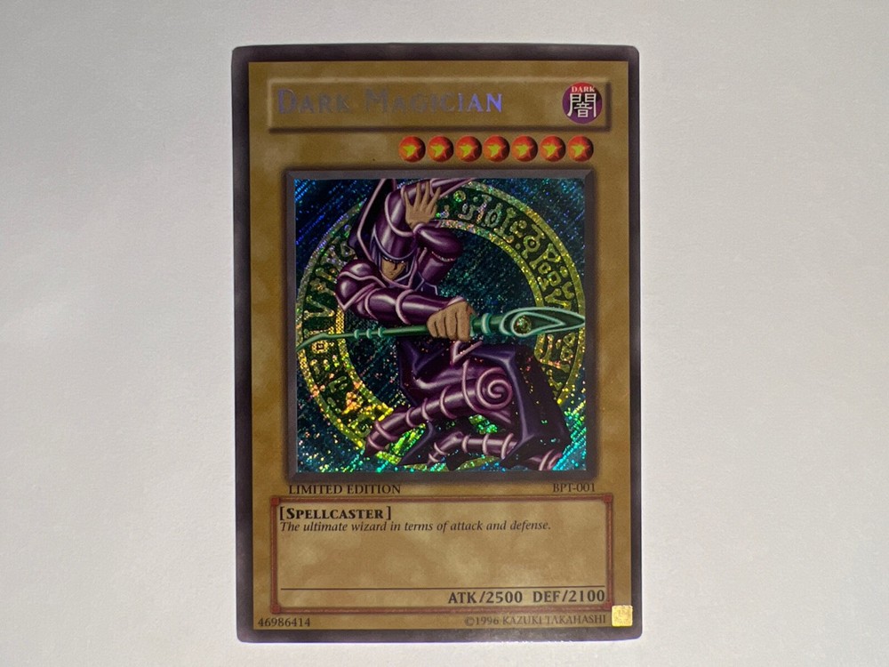 MISPRINT YUGIOH DARK MAGICIAN BPT-001 Secret Rare, Holo Bleed & Miscut M/NM/NP . See pictures for details and grading card pictured is the one you receive, I Purchased new and card went from collector's tin to collector's sleeve never played , It has been in my private collection since new and in a climet controlled safe, THIS IS A VERY RARE CARD IN THIS CONDITION AND WITH A HOLO BLEED & MISCUT WOW !!! , ( I still have the tin the card came in i will include the tin with this purchase ), Free shipping with tracking signature required , this item will be authenticated through ebay. Thanks