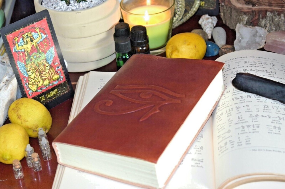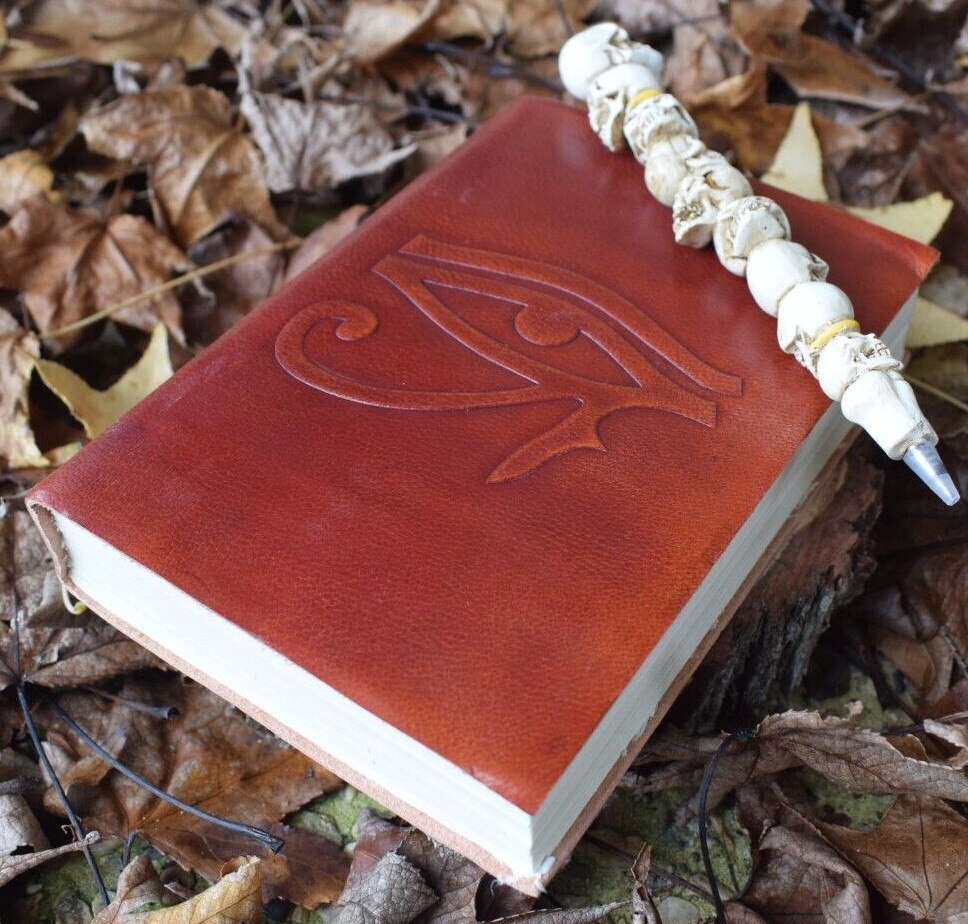 Medium Leather Bound Book of Shadows EYE OF HORUS Journal Grimoire Diary Notebook What Michael said about this Eye of Horus Book of Shadows: ★★ ★ ★★ " Excellent service. Fast postage and great service " ~ Michael Unlock the power of the ancient Egyptian god Horus with our small leather-bound notebook. The Eye of Horus, symbol of protection and power, is beautifully embossed on the front cover. Inside, you'll find recycled handmade unlined paper pages, perfect for recording your thoughts, spells, and rituals. Each notebook is crafted with care and attention to detail, making it a perfect tool for the spiritual seeker on their journey. This notebook is not only a tool of organisation, but a talisman for manifestation. Elevate your practice to the next level. Why have your Grimoire Blessed? Introducing the Sacerdos’s Blessing, a powerful addition to our line of spiritual products. A sacerdos is a Latin non-gendered term that refers to a priest or priestess in the ancient Roman, Celtic and Gaul religions. At Beckoning Broom, the priests/priestesses prefer the ancient non-binary term sacerdos to describe themselves. This Blessing is optional. Blessing includes the infusion of our mantra "Always to help. Never to harm", anointed with moon water and sacred essential oils charged by the elements. This blessing means your item is no longer ordinary. The sacerdos’s magic breathes life into the item transforming it into a powerful tool. With our blessing, the item will be significantly more potent for its use in magick. Our blessing gives it power and divinity, making it an official magickal tool. Experience the power of Sacerdos’s Blessing for yourself and see the difference it can make in your life. Feel the energy of the blessing in every use. Your Grimoire Details Size of Grimoire Height: 17cm ( 6 ¾") Width: 12cm (5 ¾") Depth: 3cm (1 ¼") Contains: 1 Leather-bound Grimoire