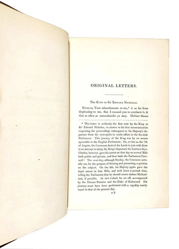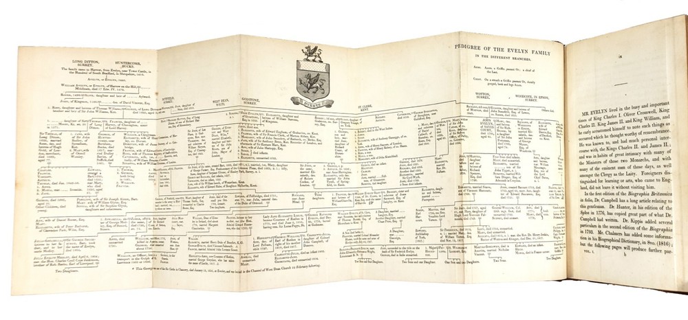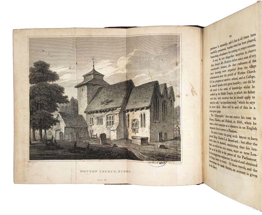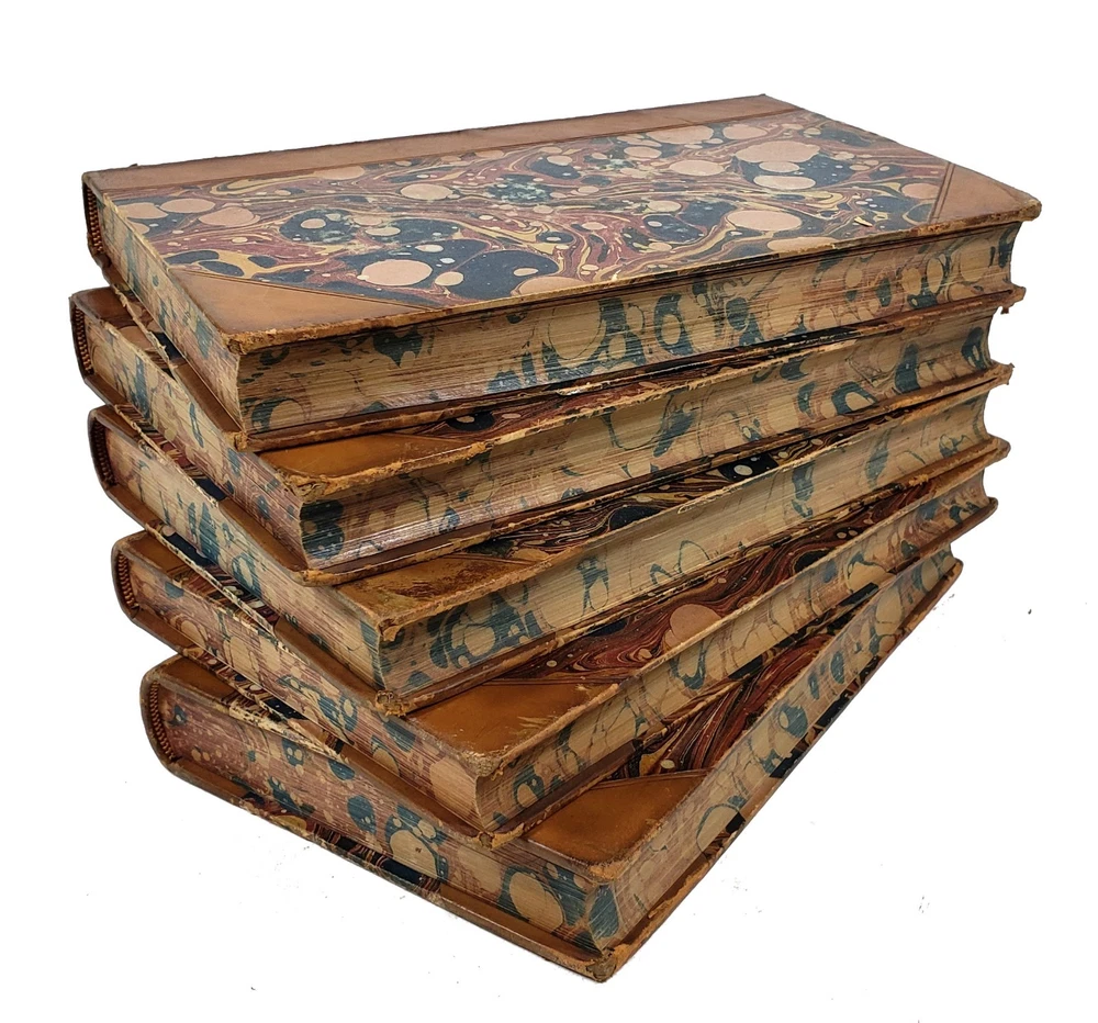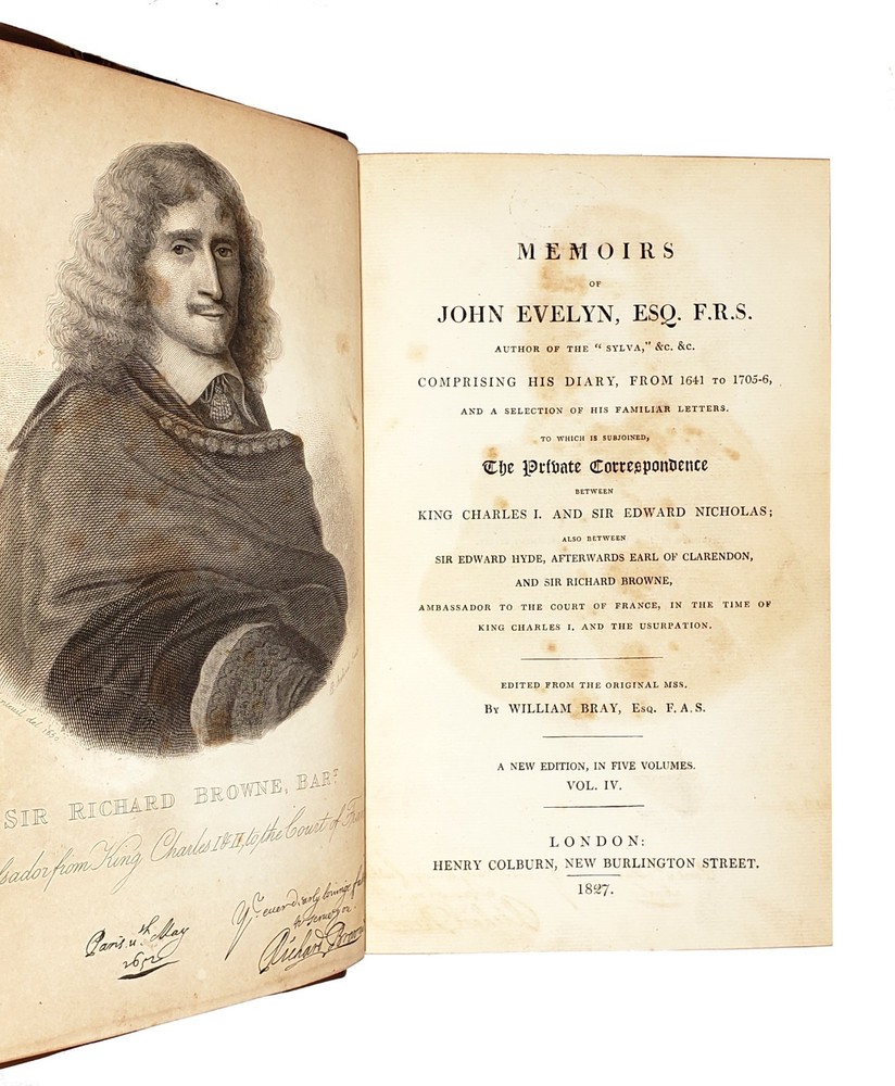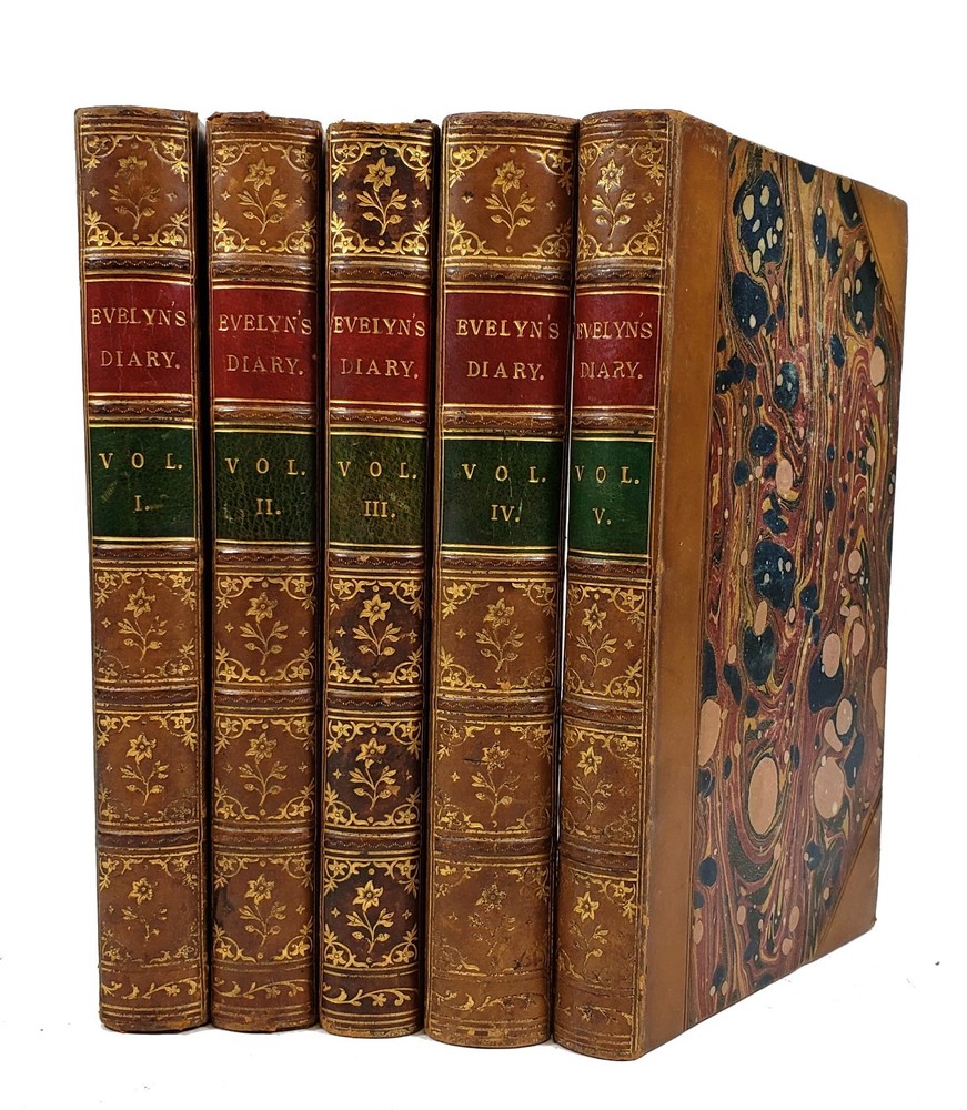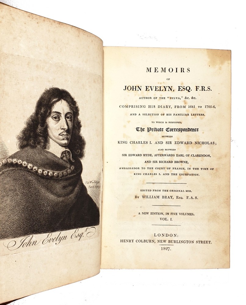 EVELYN, John. Memoirs of John Evelyn, Esq. F.R.S., Author of the "Sylva," &c. &c.; Comprising Hist Diary, From 1641 to 1705-6, And a Selection of His Familiar Letters. To Which is Subjoined, the Private Correspondence Between King Charles I and Sir Edward Nicholas; Also Between Sir Edward Hyde, Afterwards Earl of Clarendon, and Sir Richard Browne, Ambassador to the Court of France, in the Time of King Charlies I and the Usurpation. William Bray, ed. London: Henry Colburn, 1827. New Edition in Five Volumes. Three quarter leather over marbled paper-covered boards, with red and green title bands and gilt tooling to spines. Marbled endpapers with marbled page edges. Engraved frontis in each volume, with scattered illustrations throughout, some folding. Boards all show some bumping at corners and spine ends, along with general shelfwear and scuffing to marbled covers, but all are sturdy and square. Small, clean 1" slit along edge of frontis in first volume, not involving image. Title page separated in third volume but laid in, with a bit of a crack showing between pages where it was previously bound. Moderate to occasionally-heavy foxing on some plates with offsetting to opposite pages. Bookstore pencil notes on flyleaves, else pages are clean and unmarked with just occasional foxing and toning. Bindings are sound. Not an ex-library set. [AB-481]