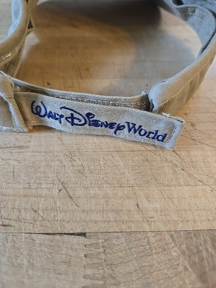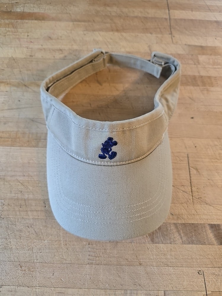 Show off your love for Mickey Mouse with this khaki embroidered golf sun visor hat. The adjustable strap ensures a comfortable fit for all head sizes. Perfect for any Disney fan, this hat is suitable for both men and women. Represent your favorite character with pride while staying stylish and protected from the sun's harmful rays. This hat is a must-have for any Disneyana collector or fan of contemporary apparel. Get yours today! Michey is a beautiful shade if dark blue.