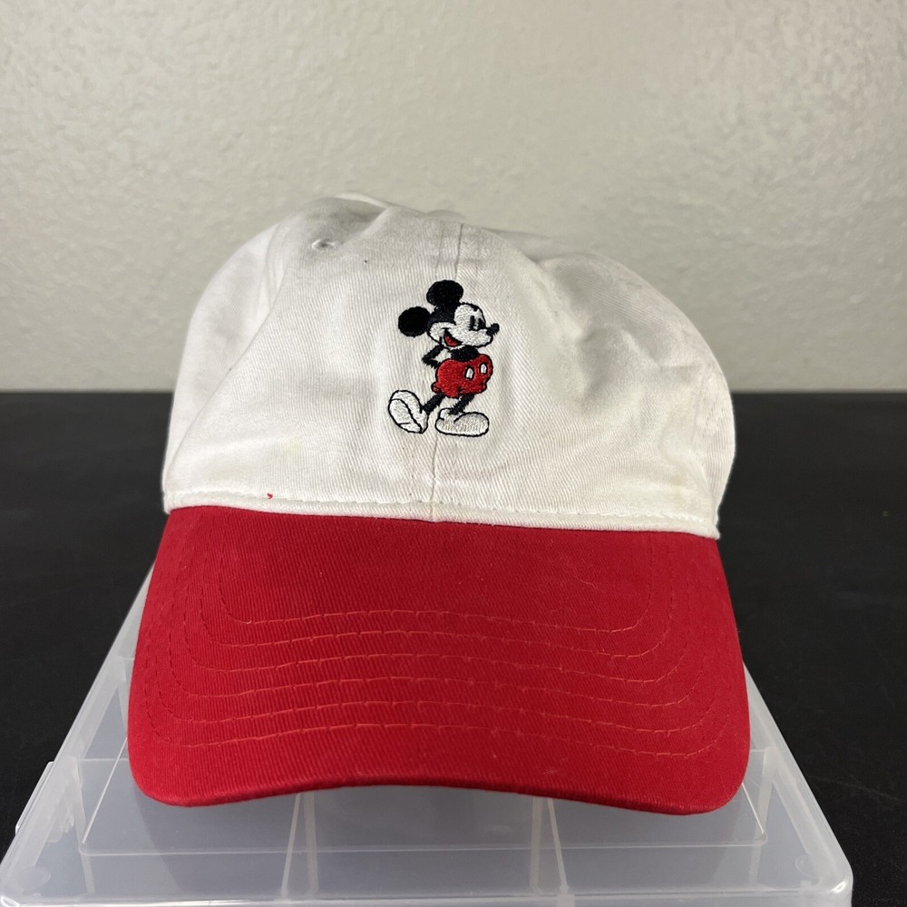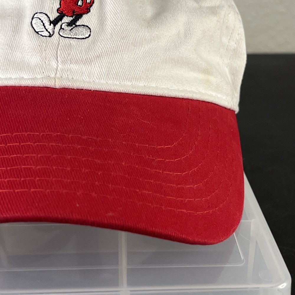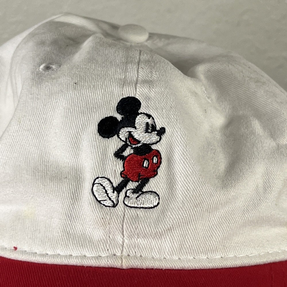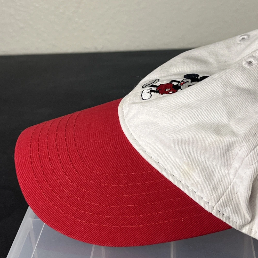 Mickey Mouse Hat Adjustable Adult Embroidered Unisex White/Red Disney Disneyland. Loose threads and minor wear on hat see photos minor discoloration!...