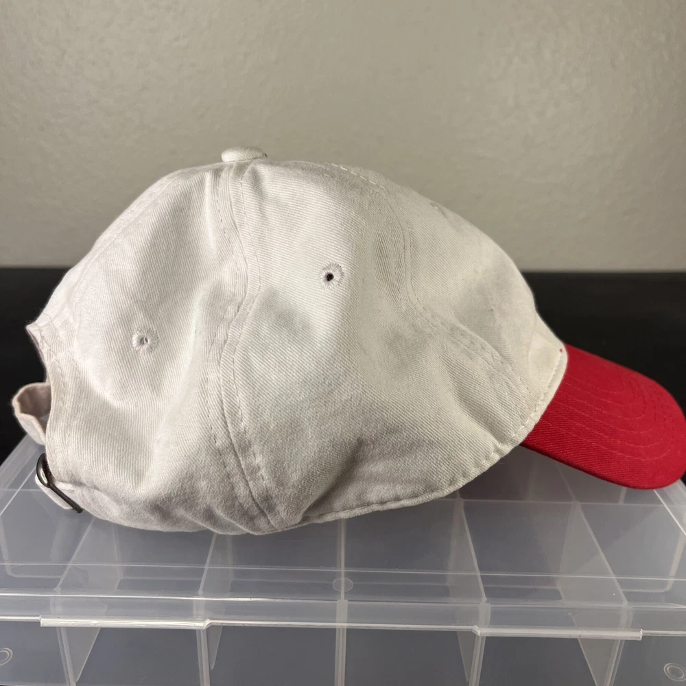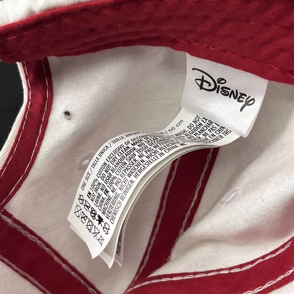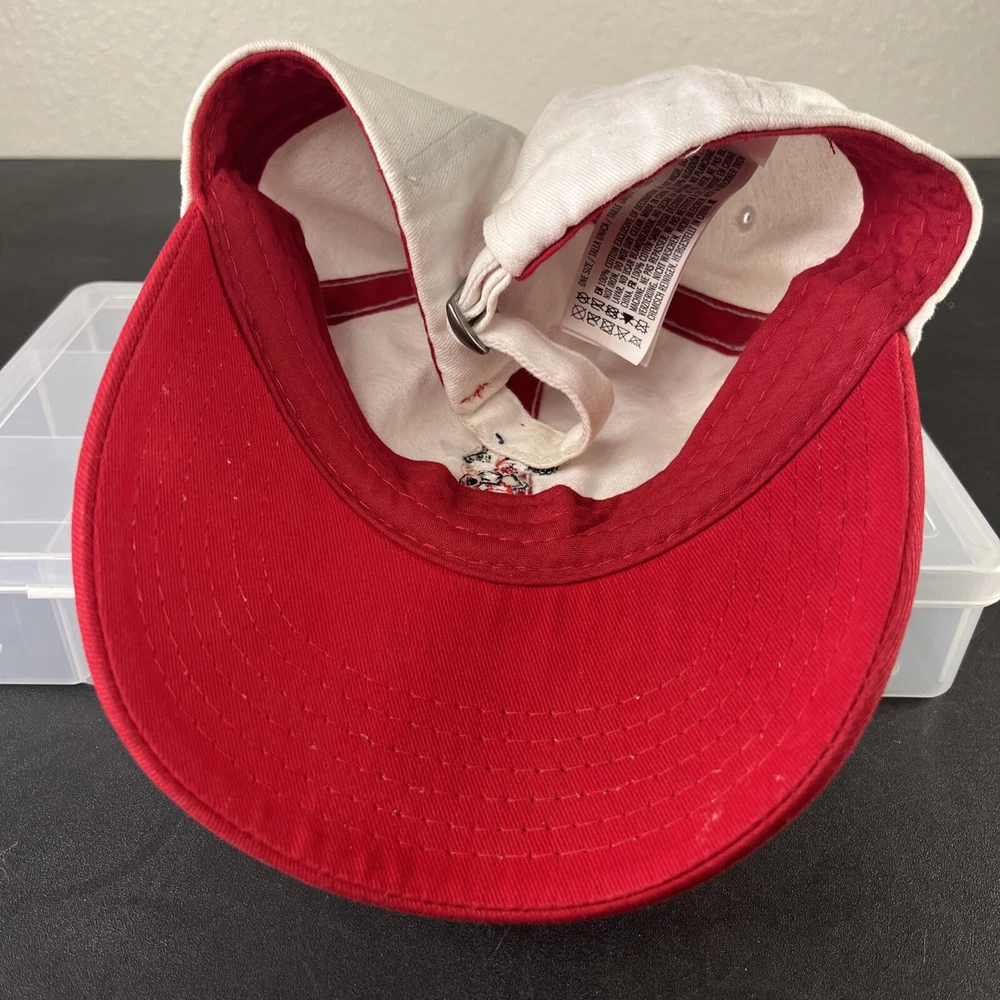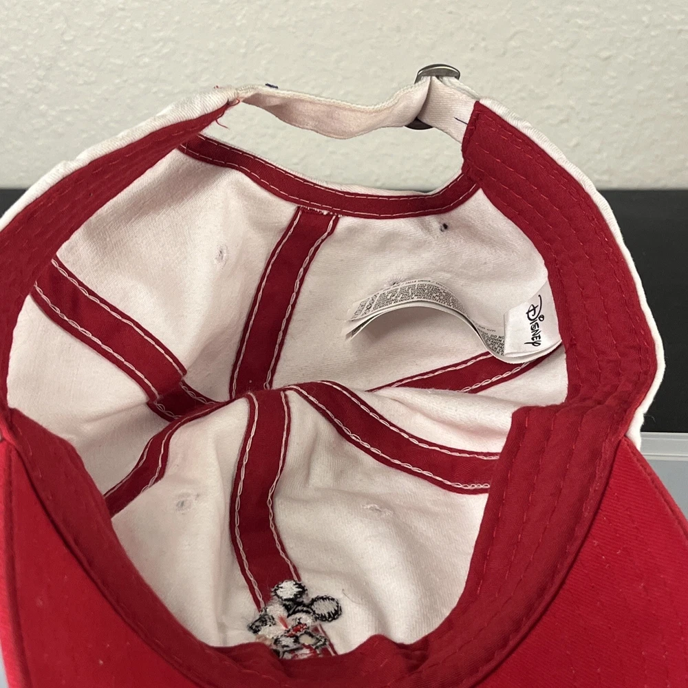 Mickey Mouse Hat Adjustable Adult Embroidered Unisex White/Red Disney Disneyland. Loose threads and minor wear on hat see photos minor discoloration!...