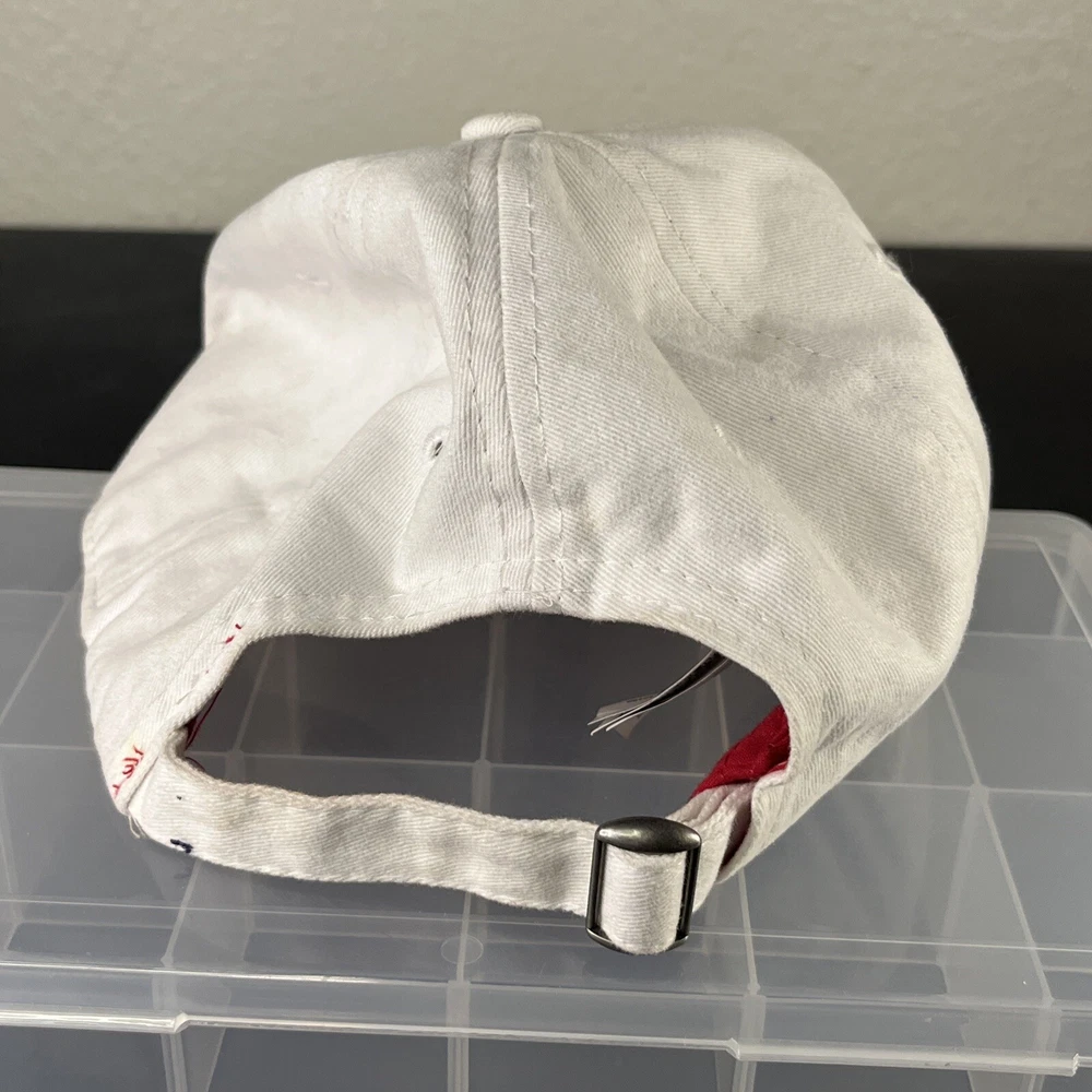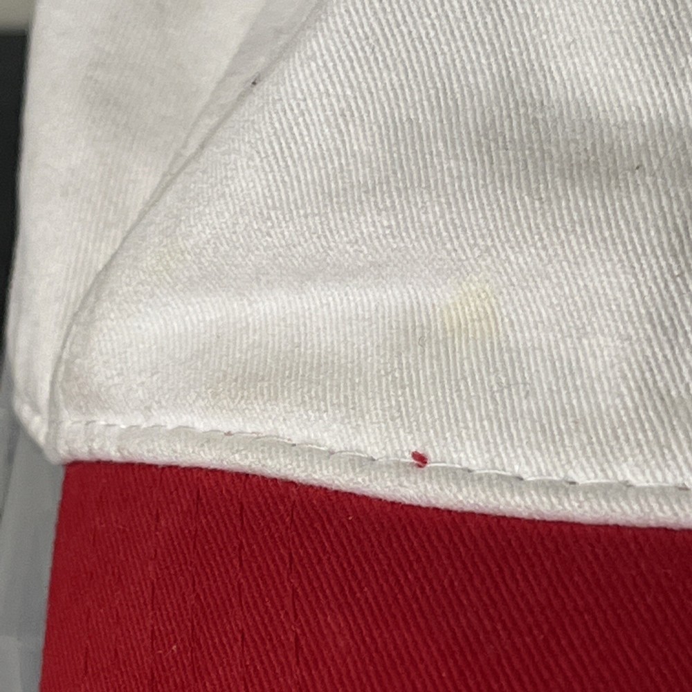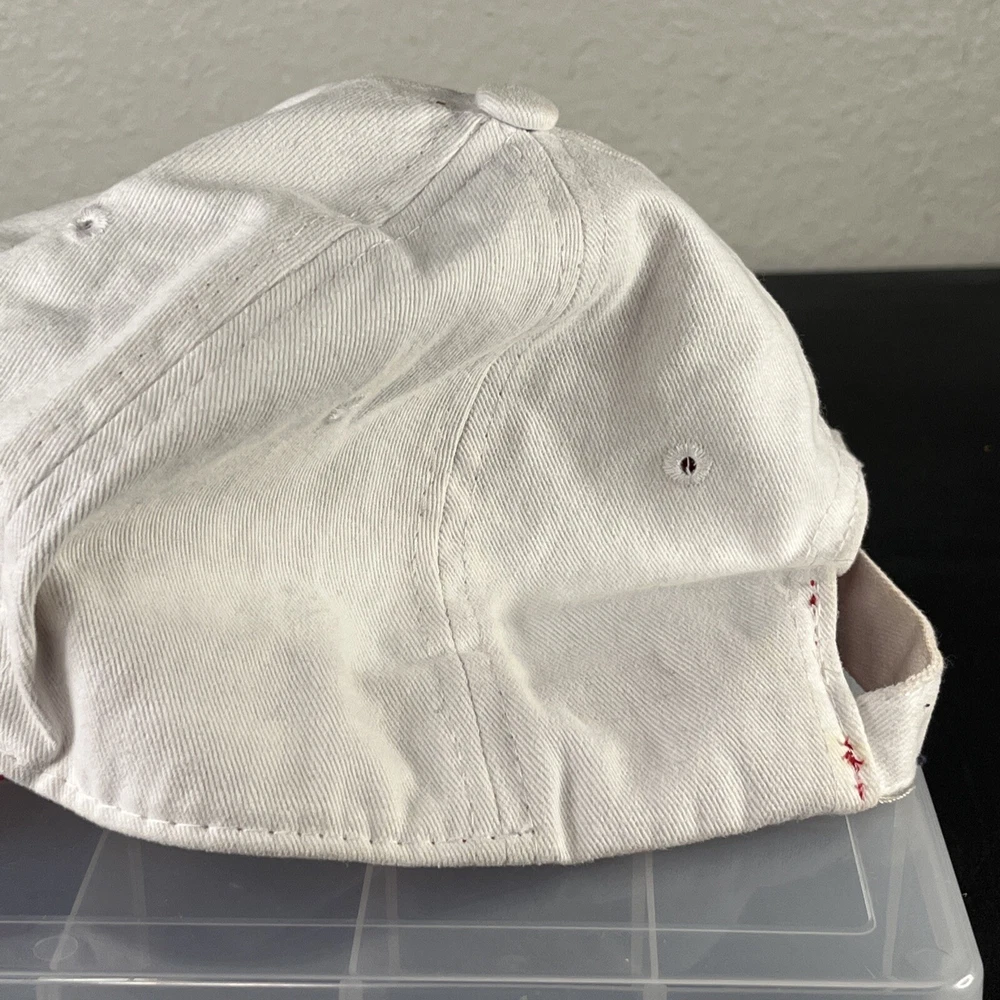 Mickey Mouse Hat Adjustable Adult Embroidered Unisex White/Red Disney Disneyland. Loose threads and minor wear on hat see photos minor discoloration!