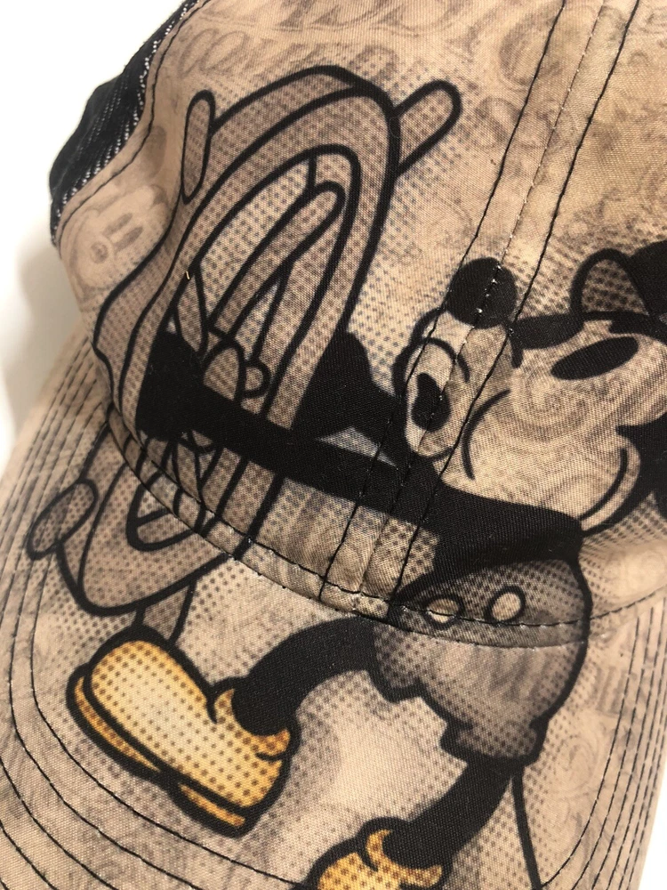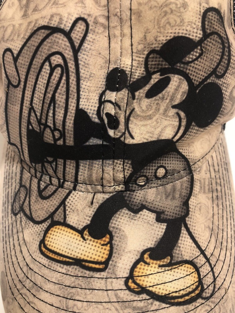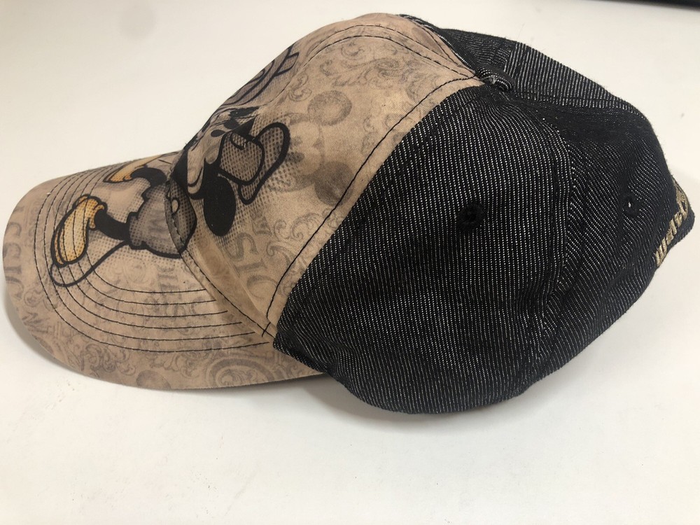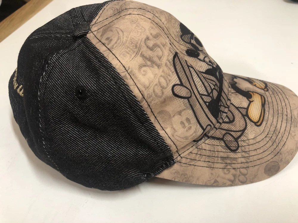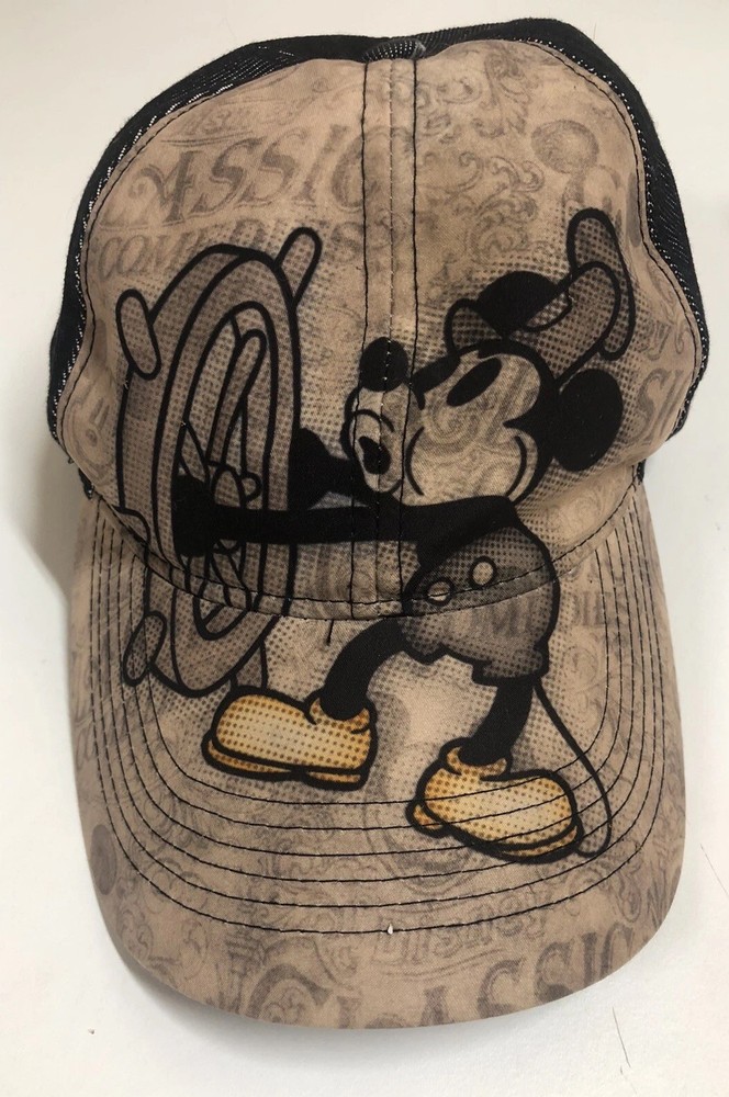 This is a vintage Walt Disney World theme park hat featuring Mickey Mouse. The hat is beige in color and has a sailing boat design. It is a size small and is suitable for unisex children. The hat was made in the United States and is part of the Disney franchise.