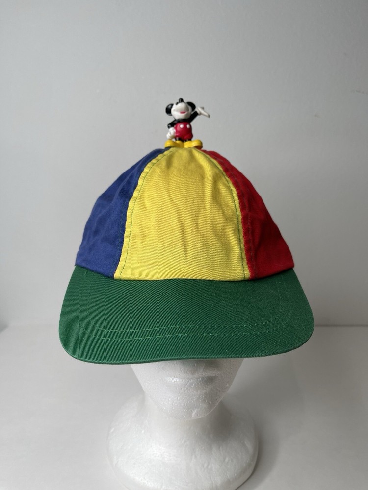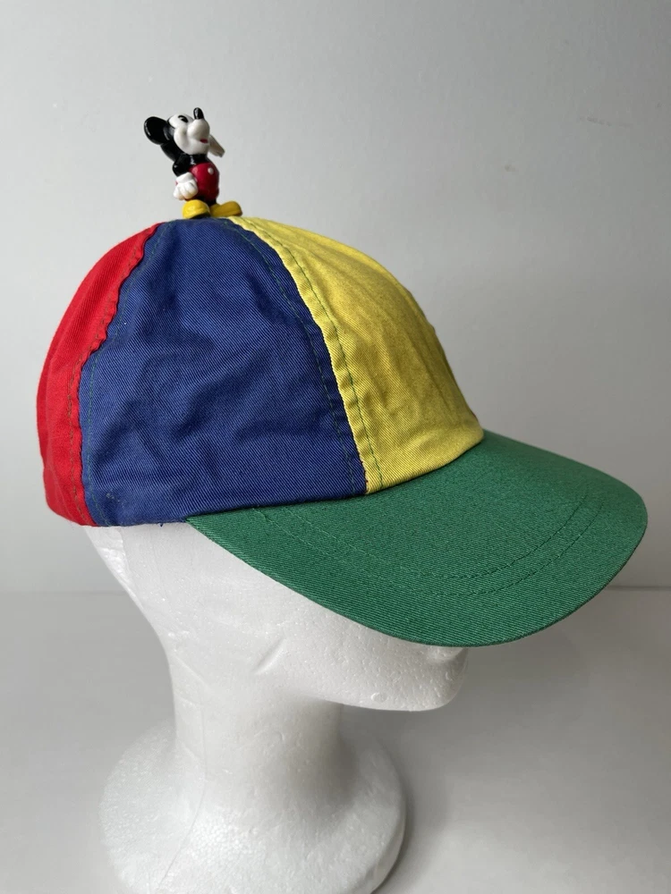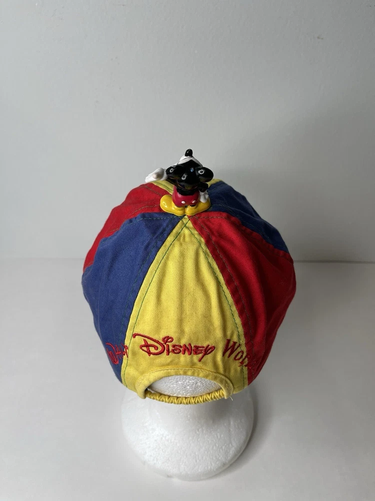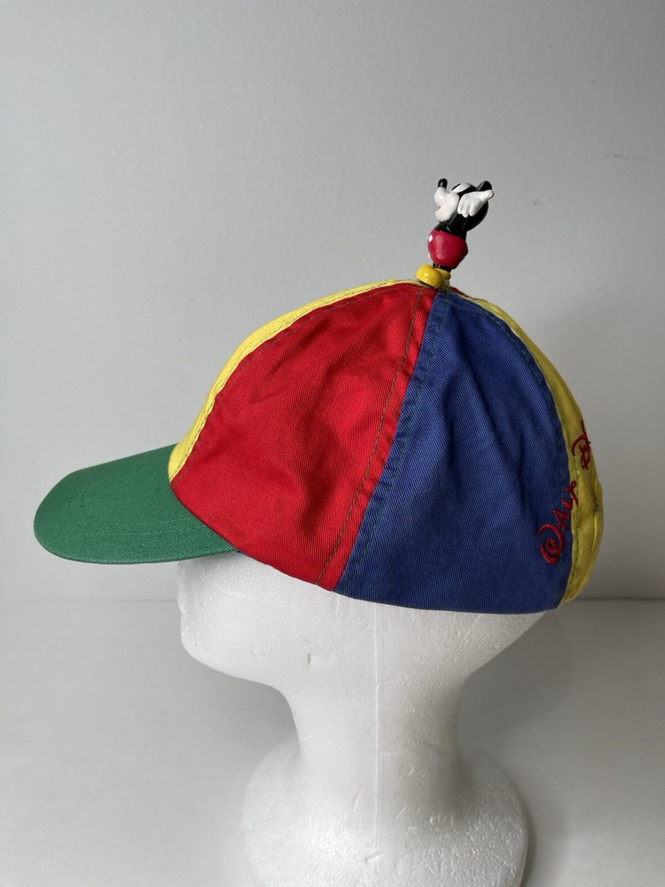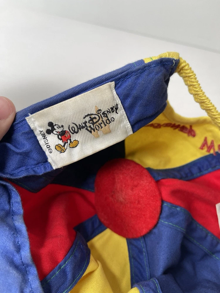 Show off your love for all things Disney with this Mickey Mouse pinwheel hat. Made from 100% cotton, this adjustable hat is perfect for any Disney fan, regardless of age. The blue and yellow colors perfectly match the iconic Mickey Mouse logo, making this hat a must-have for any collector. This hat is suitable for both men and women, and features the Disney Ear Hat design. With its classic Disneyana style, this hat is perfect for any occasion. Don't miss out on the chance to add this vintage piece to your collection. Selling as is.