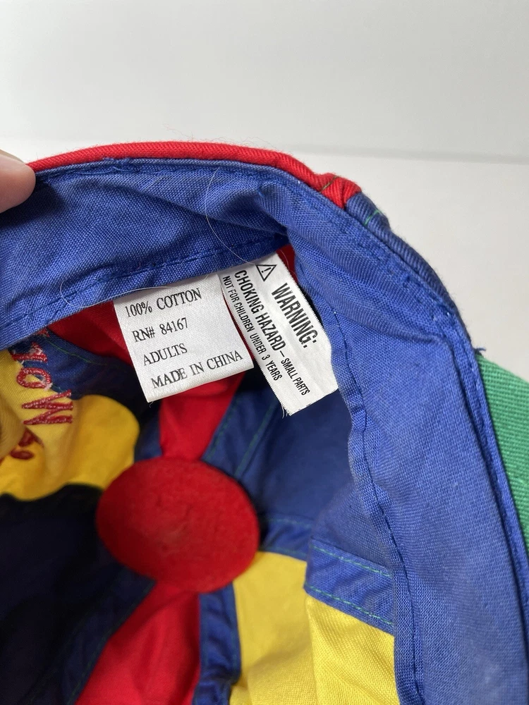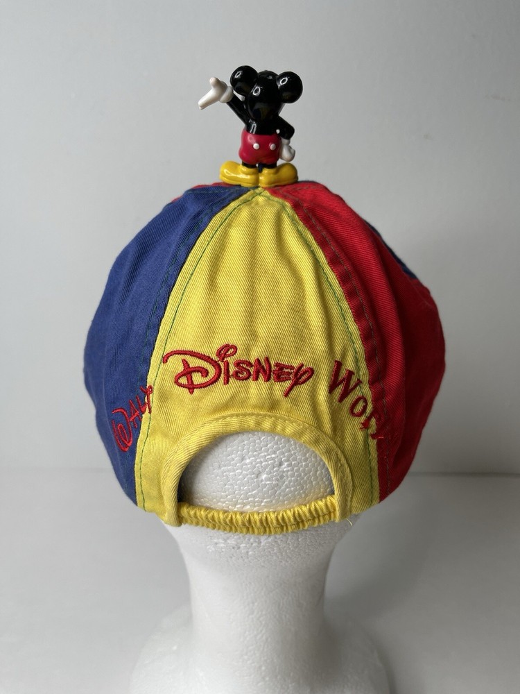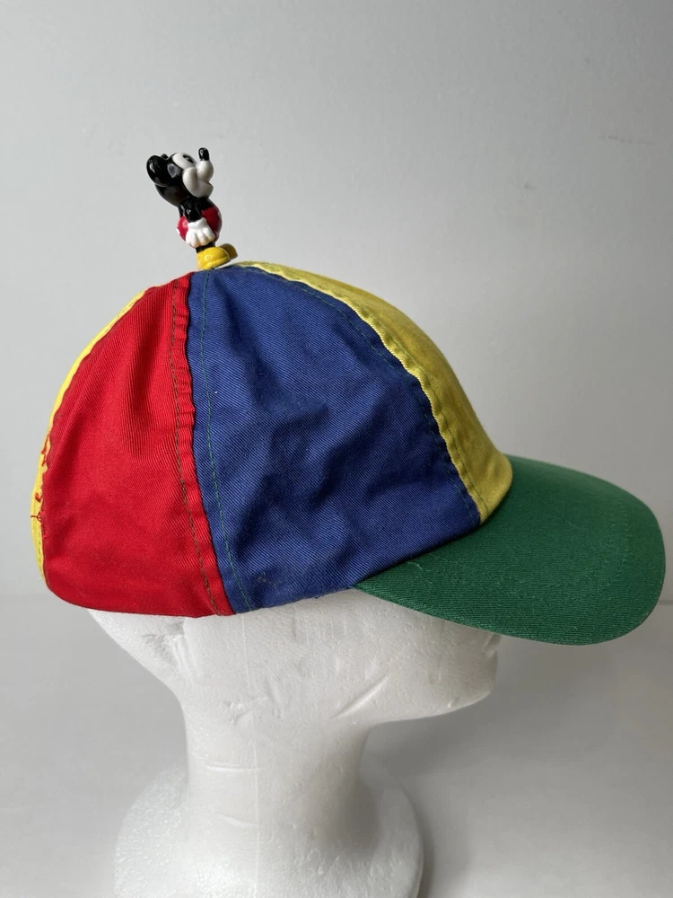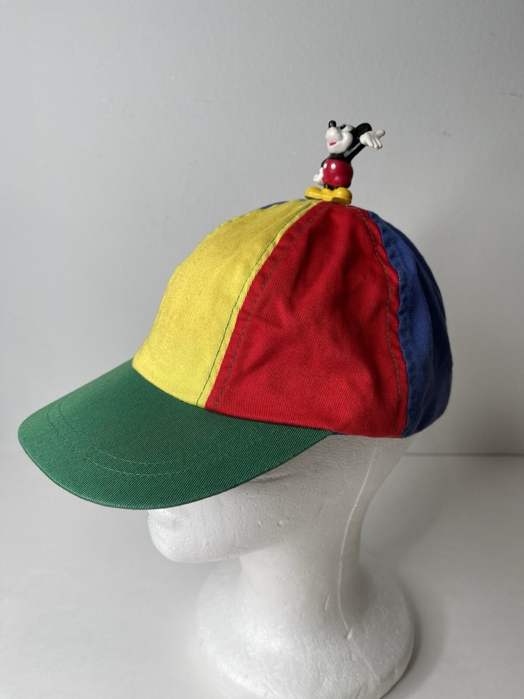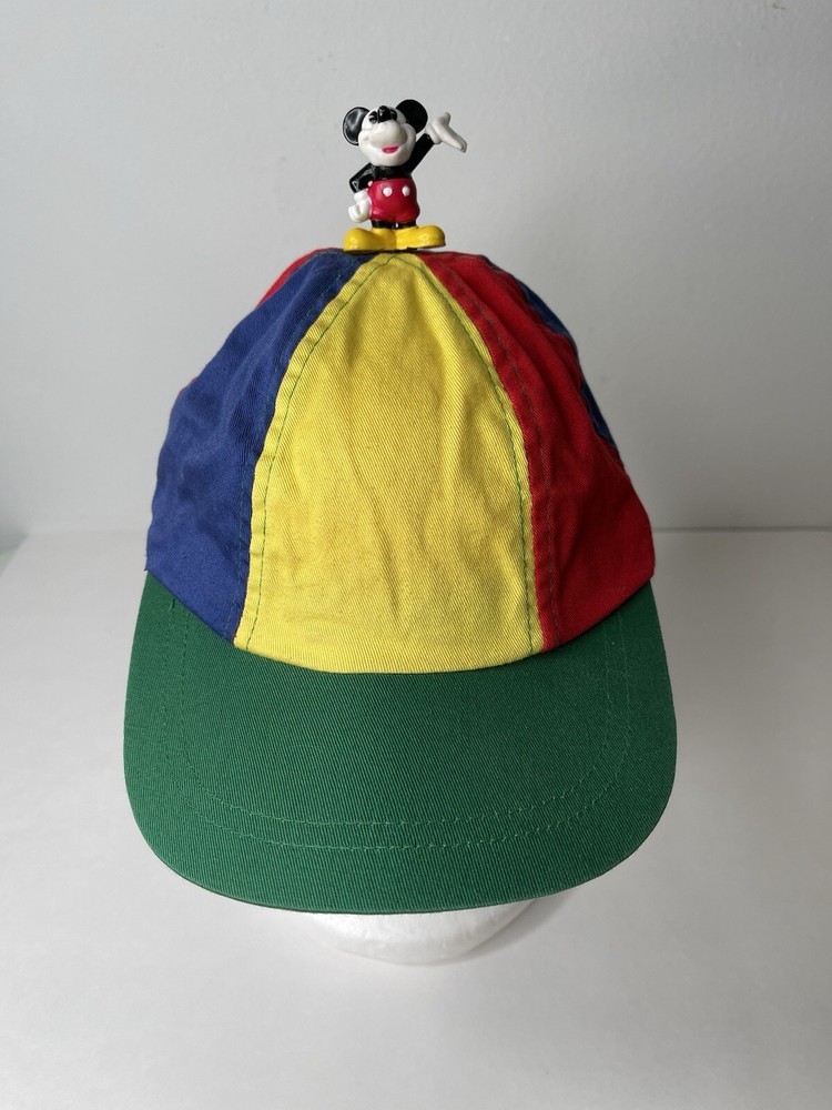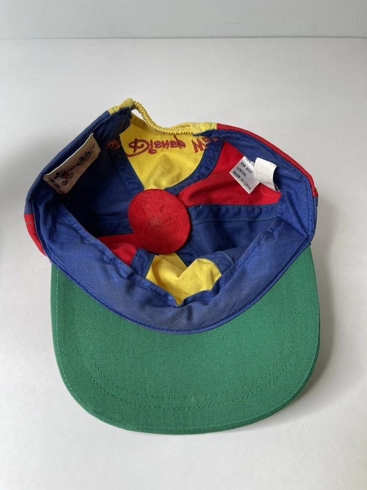 Show off your love for all things Disney with this Mickey Mouse pinwheel hat. Made from 100% cotton, this adjustable hat is perfect for any Disney fan, regardless of age. The blue and yellow colors perfectly match the iconic Mickey Mouse logo, making this hat a must-have for any collector. This hat is suitable for both men and women, and features the Disney Ear Hat design. With its classic Disneyana style, this hat is perfect for any occasion. Don't miss out on the chance to add this vintage piece to your collection. Selling as is.