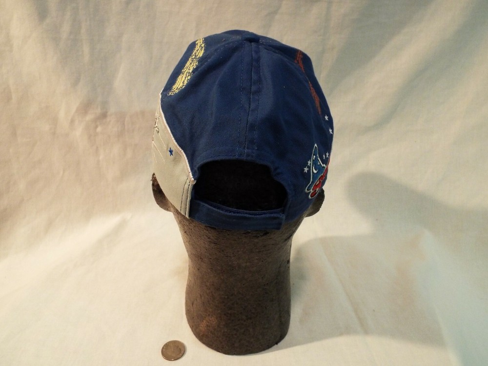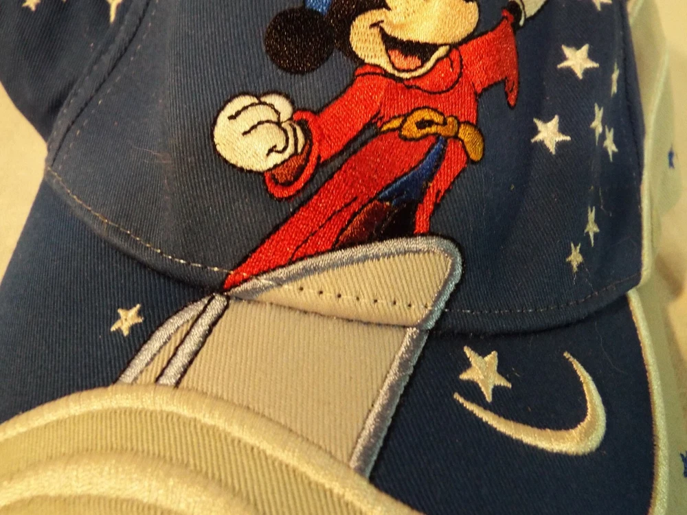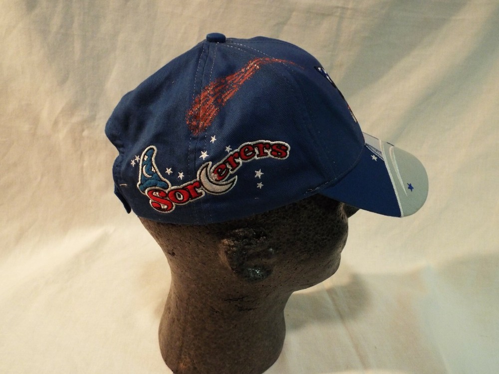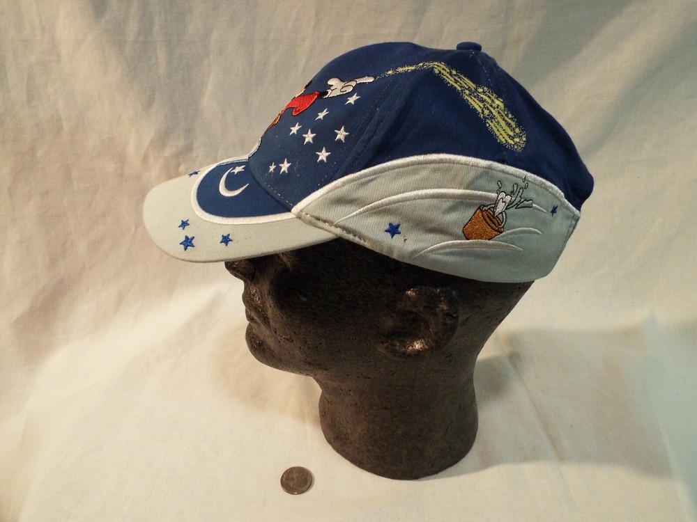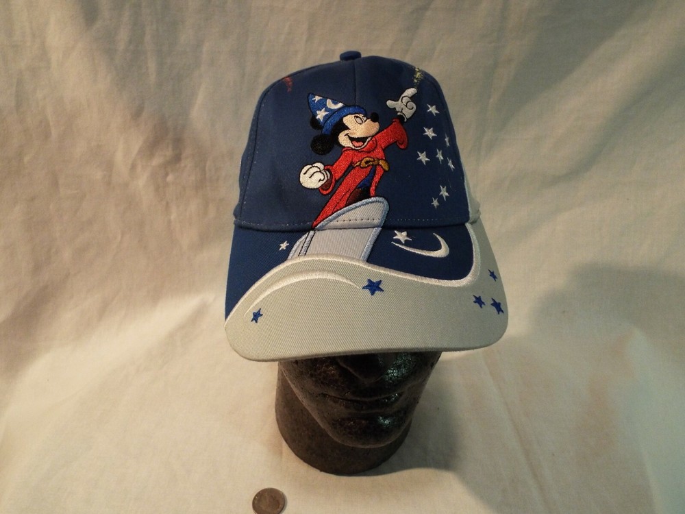 Mickey Mouse as the Sorcerer's Apprentice Walt Disney World Youth ball cap. New Unworn condition. DISCLAIMER: I purchase the bulk of my hats at Estate Sales & Garage sales and except for rare occasions I try to buy only the hats I deem to be i n new unworn condition. In short I will be listing all my hats as preowned or used and will state in the description the condition I feel they are in. Many times the hats have been collected over several years and may have been sitting in a closet, basement, or attic and may have collected some dust, but dust doesn't mean a hat has been worn. Usually the wear shows in the sweat band and the bill of the hat. Most of the Graphics on this hat are nicely embroidered.