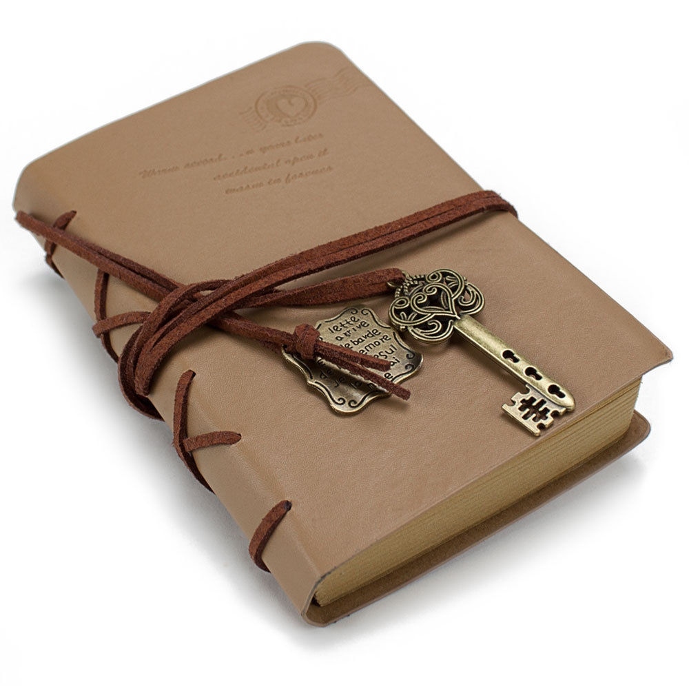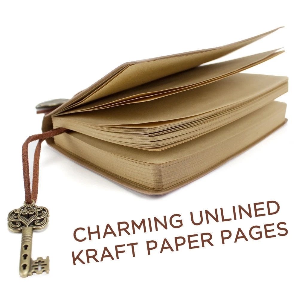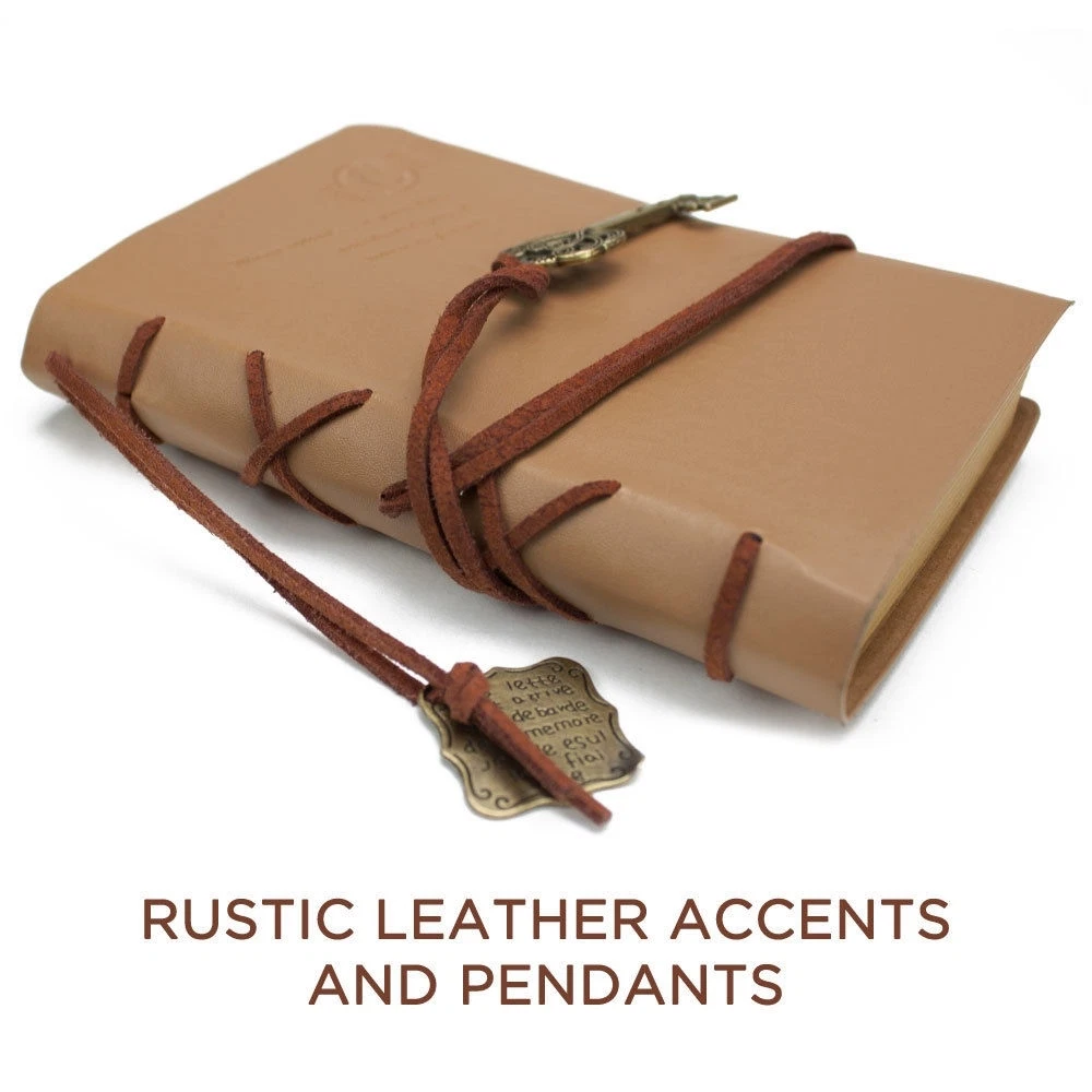Jot down your all your thoughts with this vintage leatherbound junior journal. Measuring 3.5" by 5.5", it's the perfect size to keep on your bedside table or in your car, and will fit nicely in your pocket or even a small bag, so you'll always be ready to write down your lists, secrets, poems, dreams or sketches. Made from tan PU leather, this journal can withstand wear and tear without scratching, cracking, peeling, fading or staining. It includes 150 blank, unlined kraft paper pages that can absorb heavier ink with less bleed than traditional notebook paper. So you're free to write and decorate each page with your own handmade art, calligraphy and scripting, or insert photos and article clippings. Securing your journal is easy with the attached string and key medallion. An additional string medallion is included that makes for a convenient page marker, making it a beautiful gift for a friend, significant other, child or parent for a birthday, wedding, shower, graduation, holiday, or just to show you care.