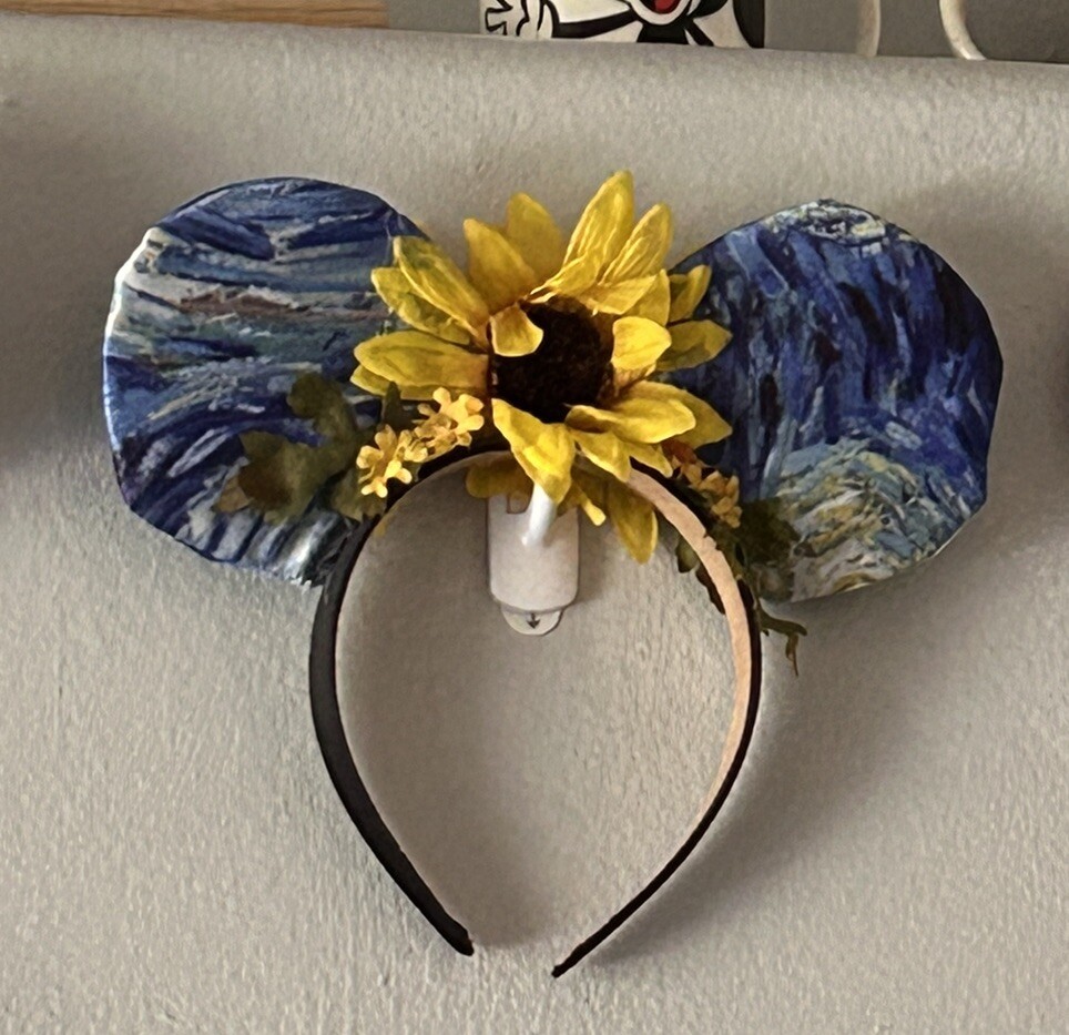 Add a touch of Disney magic to your wardrobe with this handmade Minnie Mickey Mouse Ears headband. Perfect for your next Walt Disney World trip or any Disney-themed event, this headband features a stunning Van Gogh Starry Night design. The ears are made from high-quality materials and are a comfortable fit for adult unisex wearers. This collectible item is part of the Disney franchise and is manufactured in the United States. Show off your love for Disney with this unique piece and feel like a true Disney fan.