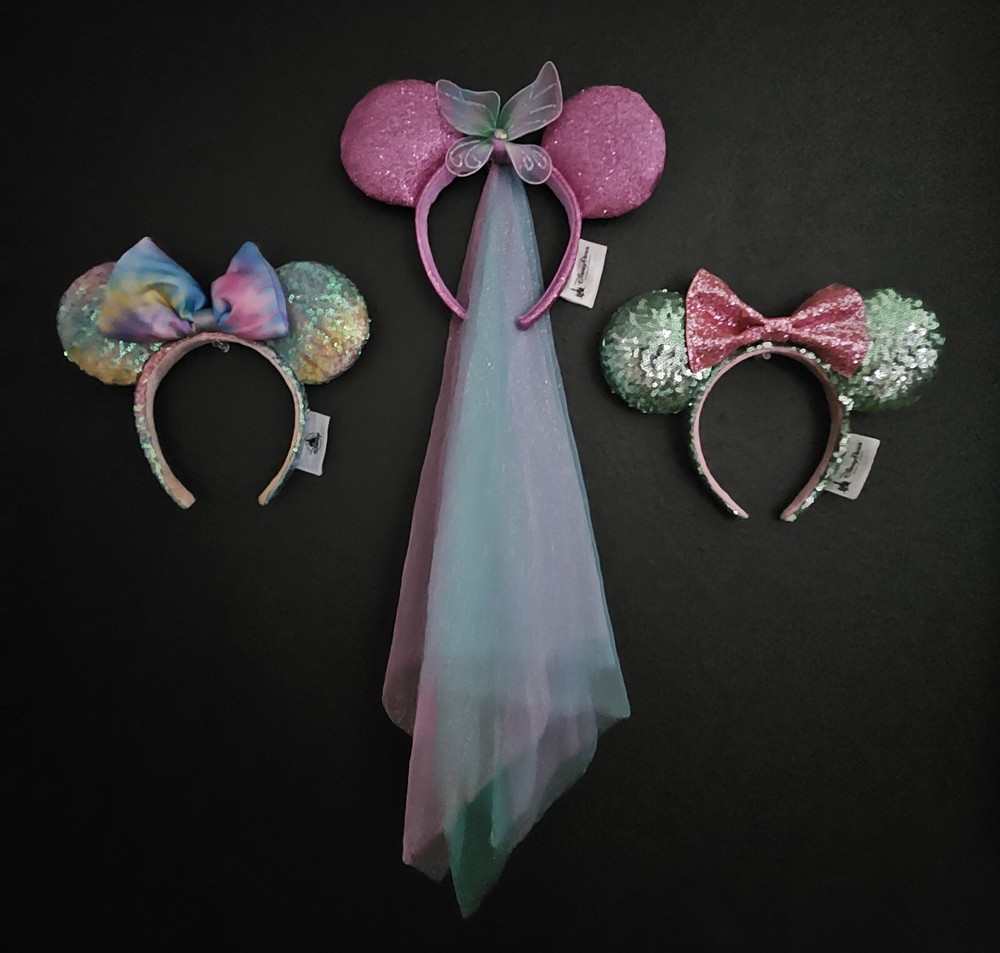 Get ready for the ultimate Disney experience with this Minnie Mouse Ears set of 3 from Disney Parks & Shop Disney. These ears are perfect for Disney lovers who want to add some extra magic to their outfit. The ears are designed with the iconic Minnie Mouse theme and come in a set of 3 for ultimate variety. Set includes: 1. Pink ears fairy edition with long veil 2 Mint Green ears with soft pink bow 3. Multicolor pastel ears with matching bow Made in China, these Minnie Mouse Ears are suitable for adults and fit all sizes. These have never been worn & have been used as decoration. They are perfect for collectors of Disney merchandise and are a must-have for anyone visiting Walt Disney World or Disneyland. The multicolor design adds a touch of whimsy to any outfit and makes for a great addition to any Disney collection. Get yours now and bring home the magic of Disney!