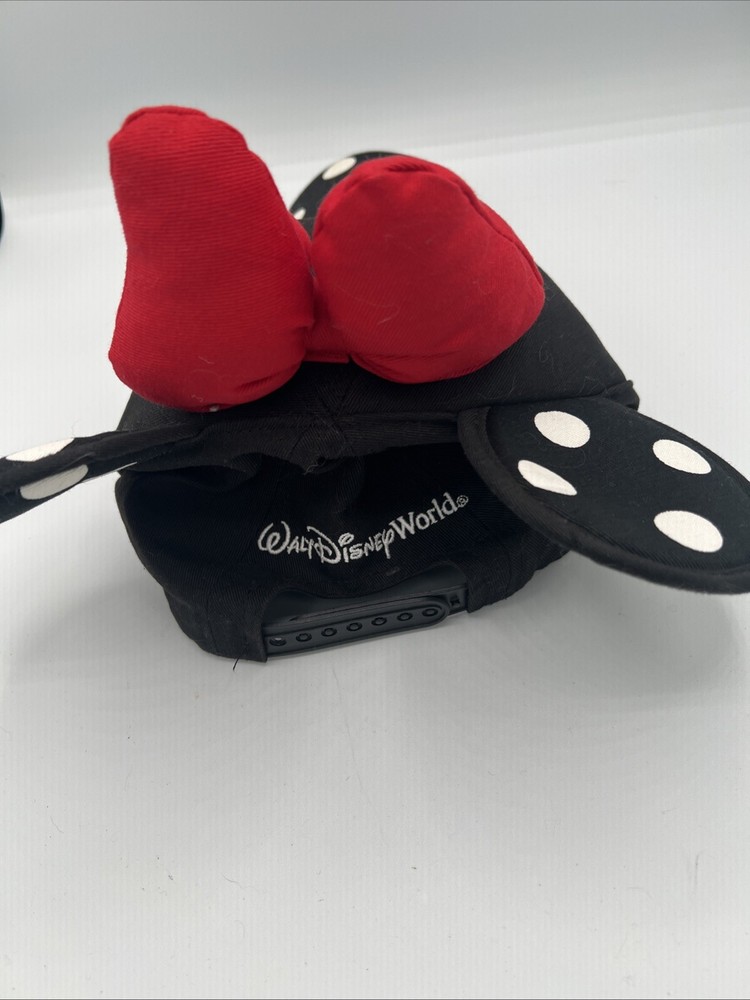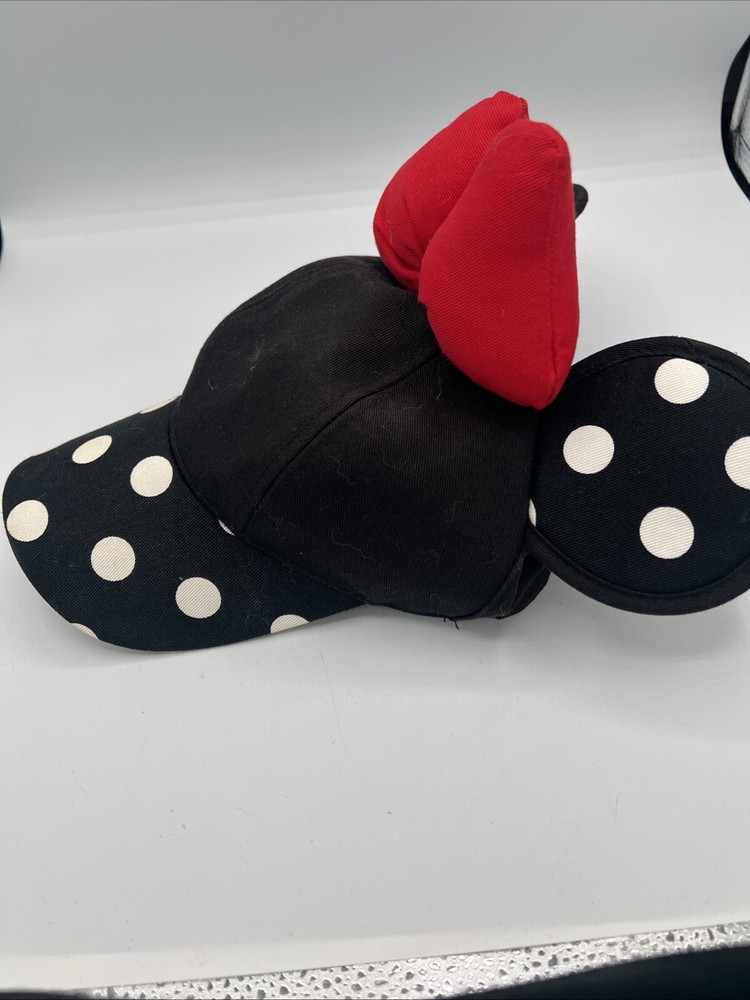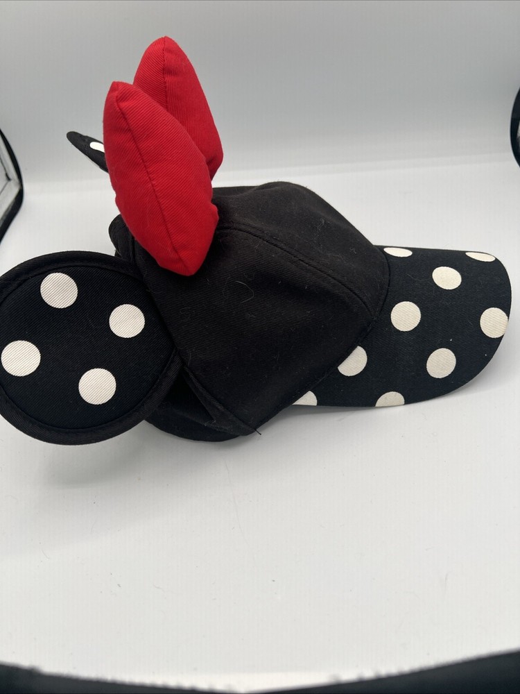 This Minnie Mouse Ears adult baseball cap is a black hat featuring the iconic Disney character. It is from the D23 Expo in 2020 and is suitable for women. The cap has a snap back for adjustable sizing and is part of the Disney franchise. Made in China, it is a collectible contemporary apparel accessory from Walt Disney World.