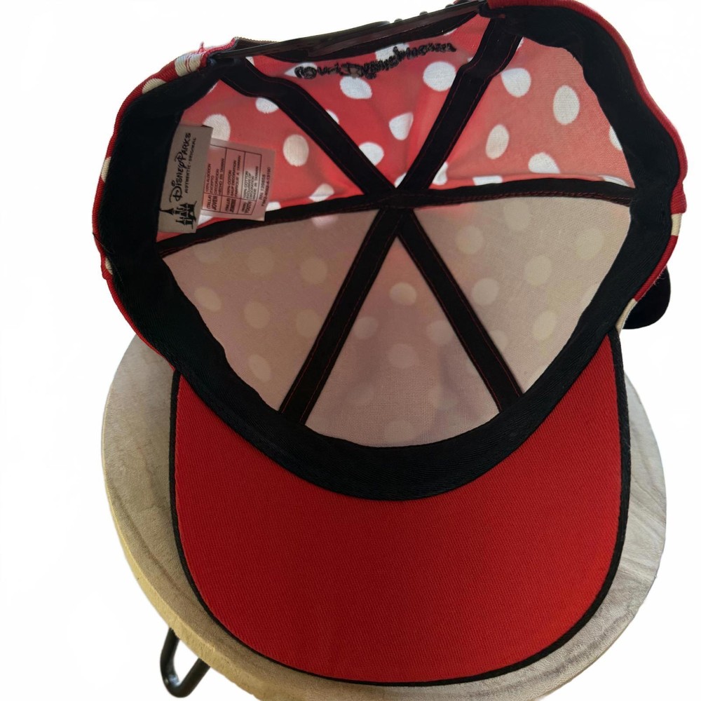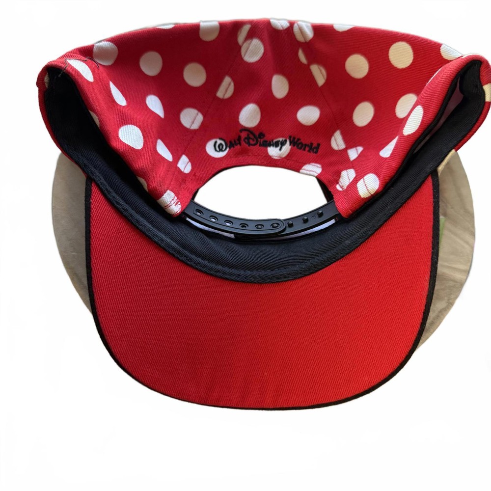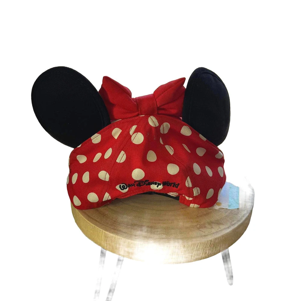 Minnie Mouse Hat Walt Disney World Polka Dot Baseball Cap Ears Bow Snap Back Worn once at Disney Smoke and pet free Baseball cap with Mouse ears and bow Embroidered Minnie Mouse ''signature'' on bill Embroidered classic Walt Disney World logo on back Polka dot print canvas body Adjustable snap backstrap for snug fit 100% cotton, exclusive of decoration /plastic Smoke and pet free Fast shipping