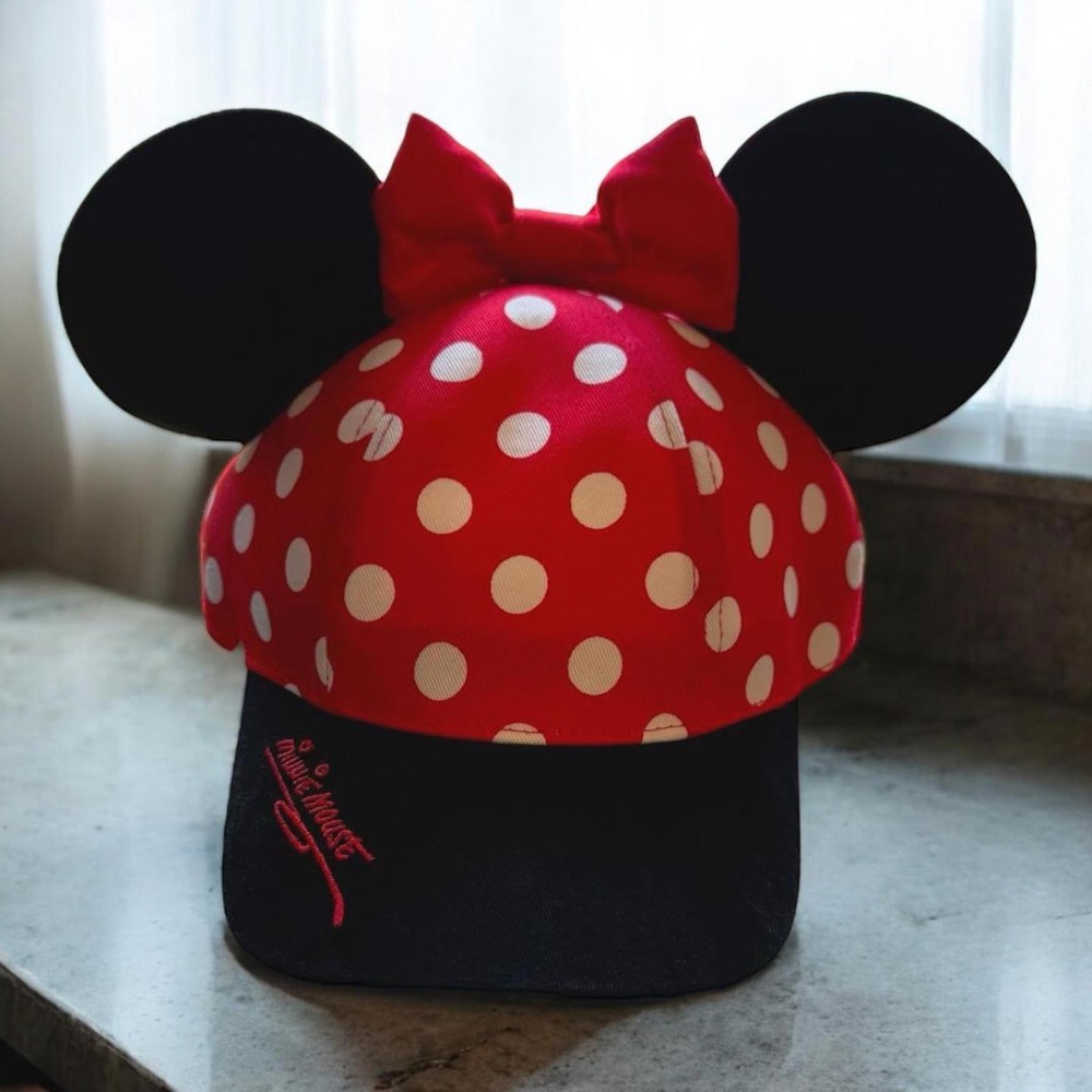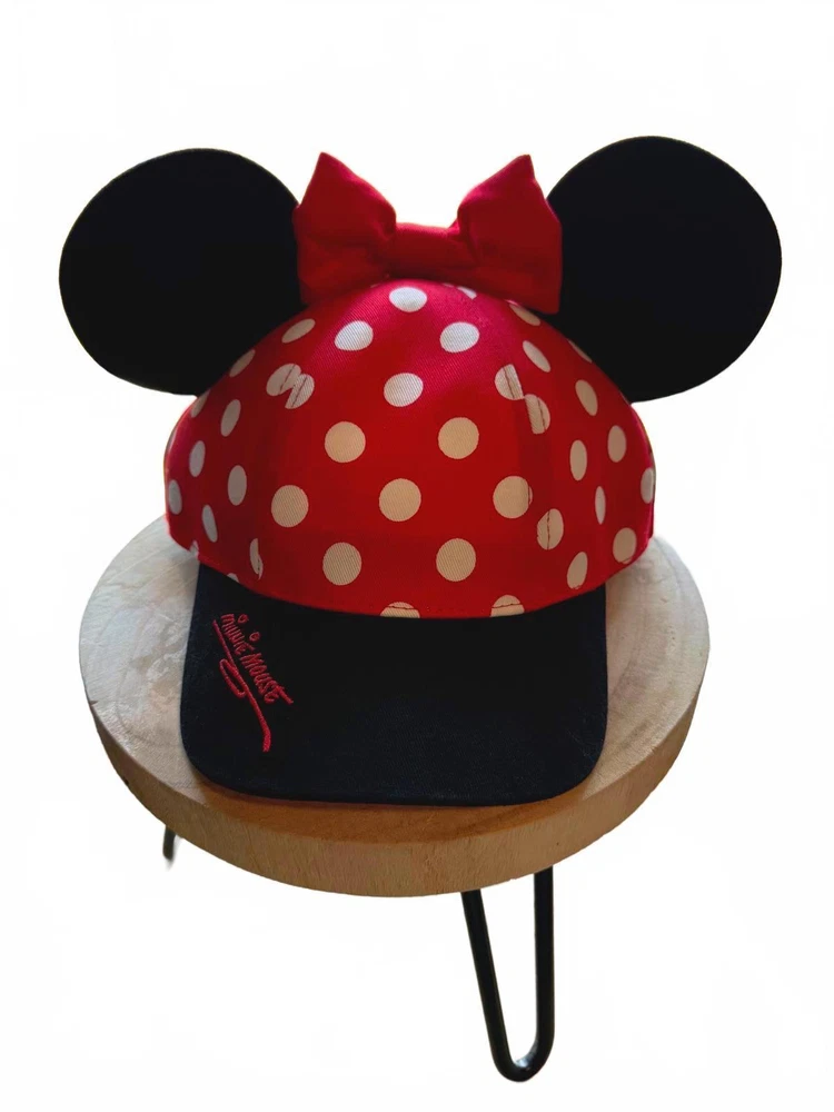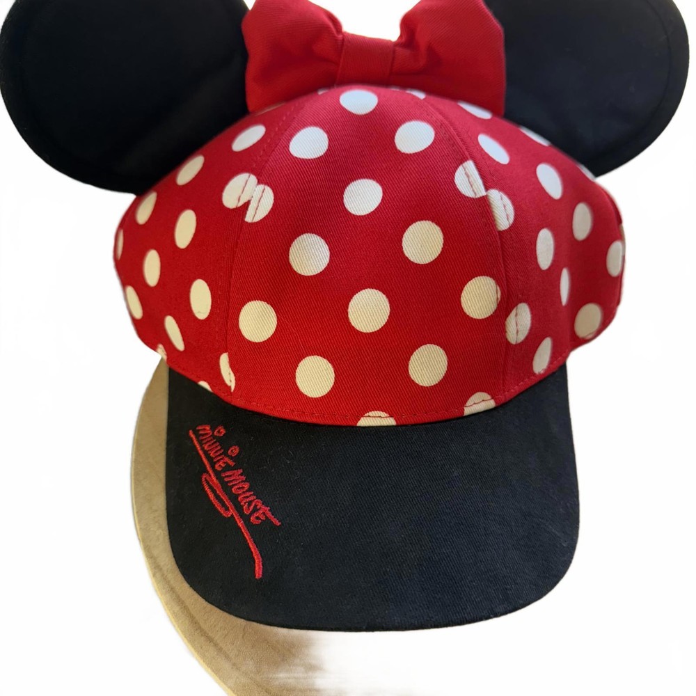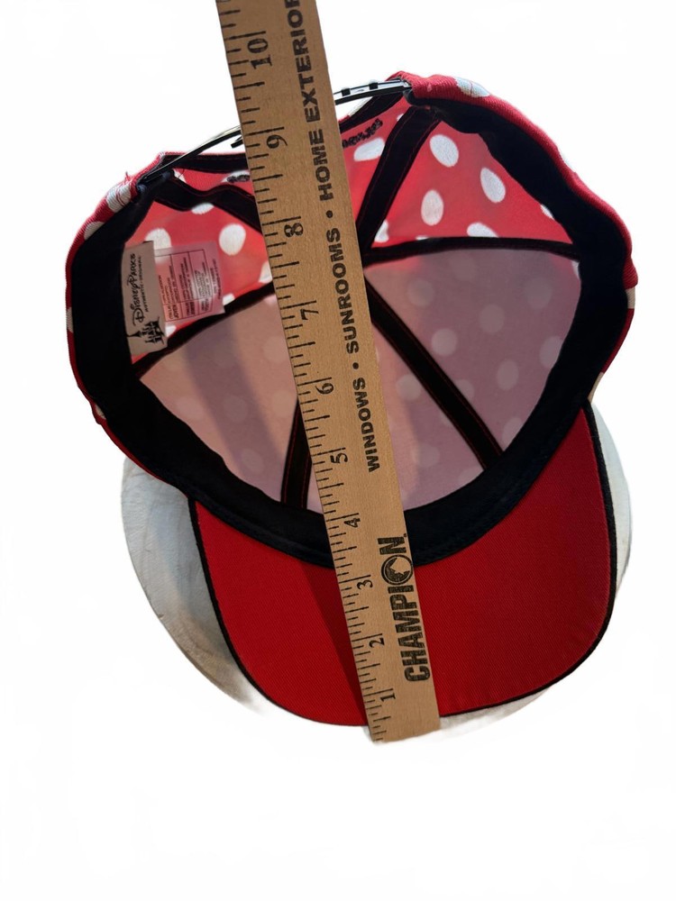 Minnie Mouse Hat Walt Disney World Polka Dot Baseball Cap Ears Bow Snap Back Worn once at Disney Smoke and pet free Baseball cap with Mouse ears and bow Embroidered Minnie Mouse ''signature'' on bill Embroidered classic Walt Disney World logo on back Polka dot print canvas body Adjustable snap backstrap for snug fit 100% cotton, exclusive of decoration /plastic Smoke and pet free Fast shipping