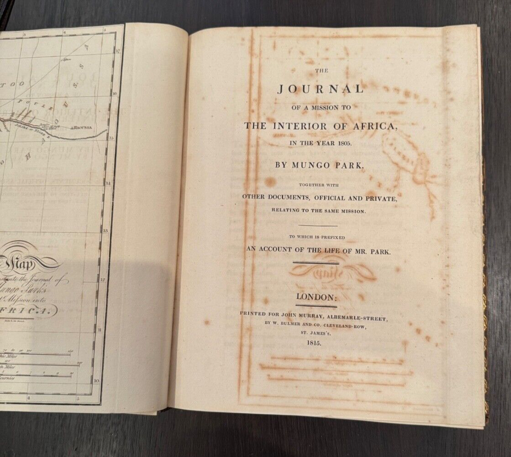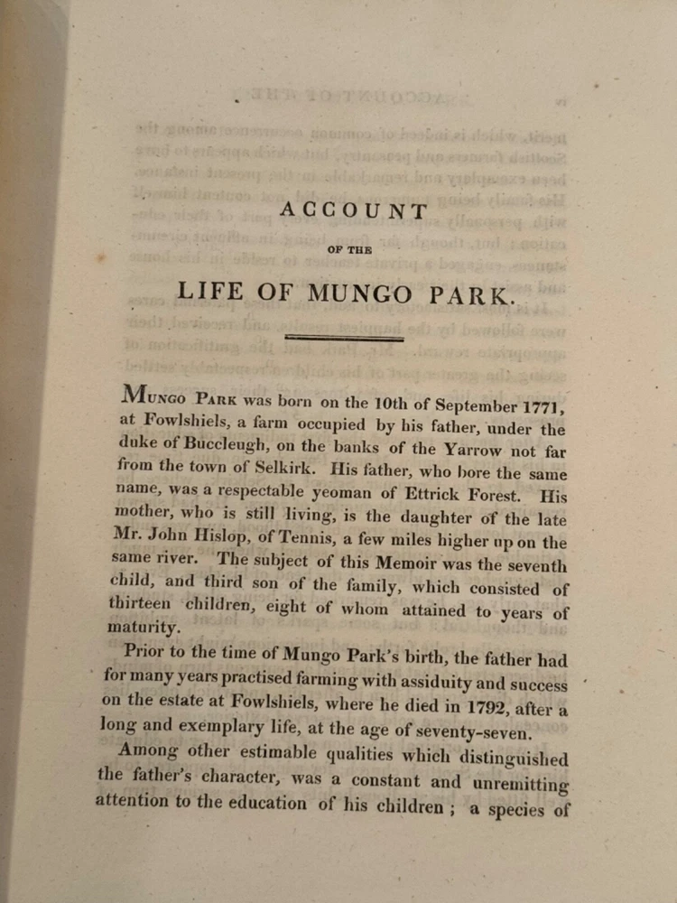 Mungo Park (1771-1806) was the first Westerner to explore the region of the Upper Niger River in West Africa before being killed on his second expedition He was the first Westerner to record his travels and his account, published first in 1799, introduced readers to lands they were totally unfamiliar with and would later colonize. See seller's other Mungo Park vols. The 1799 edition is a companion to this one with the same binding. Shipping can be combined if both vol. are purchased.