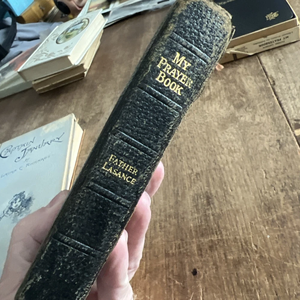 You are bidding on a My Prayer-Book "Happiness in Goodness" - Father Lasance - 1950, Leather Bound. It has a lot of wear from age and use. The cover is attached but loose. the pages are in good shape. See pictures for best details. The item you are buying is the picture listed unless stated otherwise. Please contact me if you have questions. I want to keep my great positive rating. I will gladly work with you if there is a problem. I will always combine shipping for more than one purchase, so wait for an invoice for more than 1 purchase. Please check out my other items in my store. I mail out items 2 -3 times per week. Please pay within three days. Go to my store for other vintage collectibles Vtg Christmas | eBay Stores eBay is a hobby of mine. I enjoy searching for that unexpected item. Most of the things I purchase, I get from estate sales.