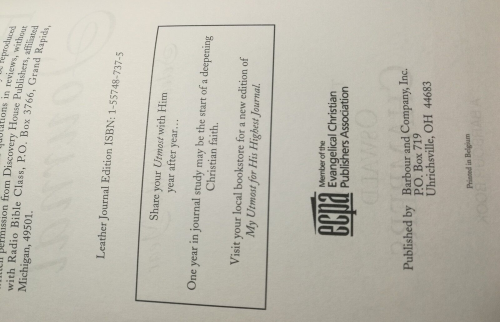 My Utmost For His Highest Journal Selections For The Year Barbour Bonded Leather Condition: Very Much Like New, Please see pictures for detail. As with most preowned items, some minor wear and signs of age should be expected. All major flaws and damage will be noted as we see them. Please check pictures carefully and message us with any questions . See Pictures for more info. Our pictures are of the actual item listed. Accessories: Not every item comes with accessories. See Pictures to see if there is any accessory included with this sale. If a accessory does not show in the pictures then assume it does not come with this item. If you are not sure send us a message and we will gladly answer any question you may have. Feedback: We want you to feel happy about your purchase, and your experience with us is unlimited. We love leaving positive 5 star feedback when acceptable to all our customers and we greatly appreciate your positive 5 star feedback in return if your are happy with our services. If for some reason you feel that you can't leave positive feedback, please contact us so we would do our best to find a solution to fit your need. Shipping: We ONLY Ship within the 48 U.S states! We can USUALLY ship to Alaska, Hawaii, and Puerto Rico (ONLY) items less than 20 pounds and/or under 12x12x12in. Other US locations like Guam, Virgin Islands, etc... We DO NOT currently ship to.Packages are sent through USPS or UPS always include tracking and delivery confirmation. Please allow up to 1 business day for shipping, however most items are shipped out the same day the order is received if the order completed before 2:00pm. With that said,once the item leaves our hands we have NO control of delivery's. If an item is late or damaged in transit contact your carrier to inquire about the status or open a damage claim with the carrier. Also send us a message. We will try to help in any way we can. All packages are automatically insured if it is shipped with USPS Priority shipping. A tracking number will be provided for all items purchased from our eBay store. If you have any other shipping questions please let us know. Payment: It is your best protection as a buyer. Item offered as a Buy-It-Now with immediate payment required. All payments are processed through PayPal. Sales tax may be applicable by state and is usually collected and remitted through eBay, PayPal where required by law. RETURNS : We strive to accurately photograph and list our items. New Items: Returns are generally accepted within 30 days on most NEW items. If you are not satisfied with your purchase,please contact us within two days after receiving the item so we can offer a fair resolution. Buyer is responsible for return shipping charges except for issues due to OUR error. If returned make sure item is in the same condition as sent with the same packaging and contents. We reserve the right to charge a restocking fee and or partial refund to any item returned due to issues with fit, color, opened, or condition seen as pictures are provided in each listing. Used Items: Returns are generally NOT accepted on most USED/Open-Box/Refurbished items. If we made a error please contact us within two days after receiving the item so we can offer a fair resolution. Buyer is responsible for return shipping charges except for issues due to OUR error. If a returned is accepted make sure item is in the same condition as sent with the same packaging and contents. We reserve the right to charge a restocking fee and or partial refund to any item returned due to issues with fit, color, opened, or condition seen as pictures are provided in each listing.