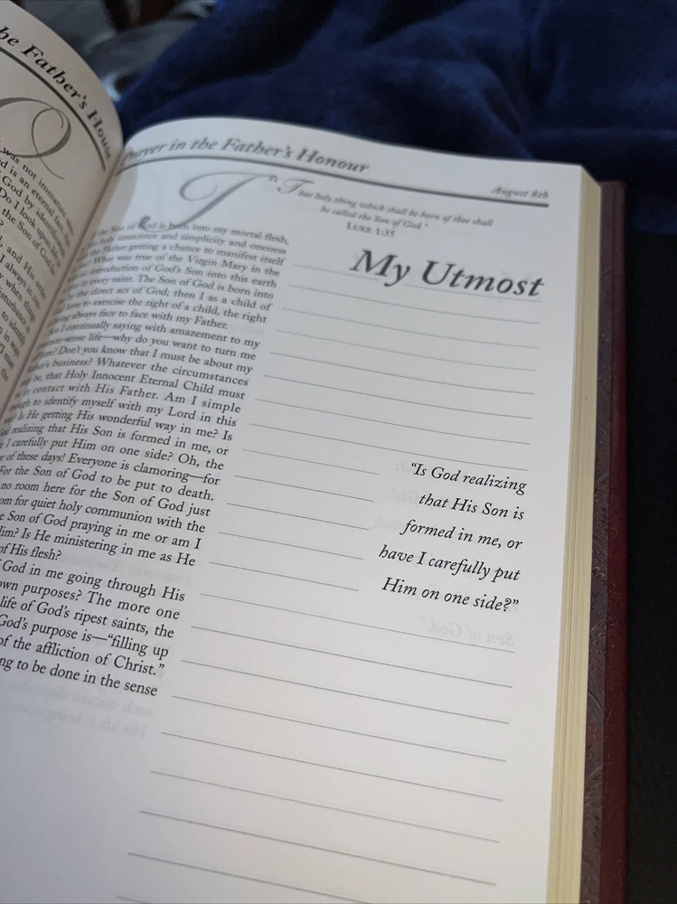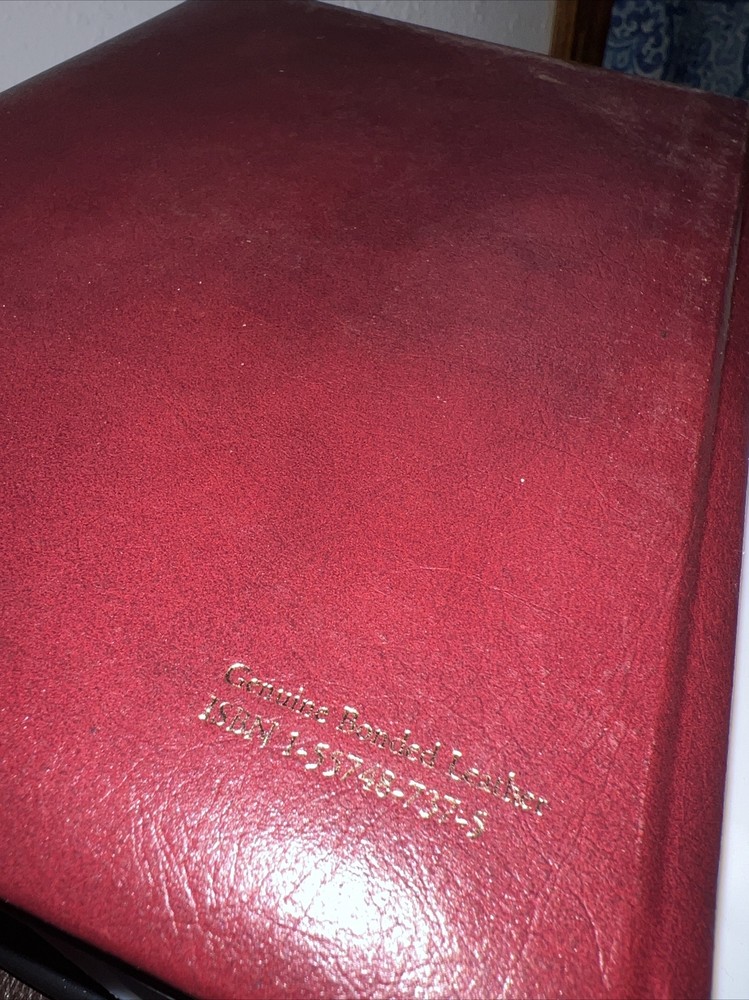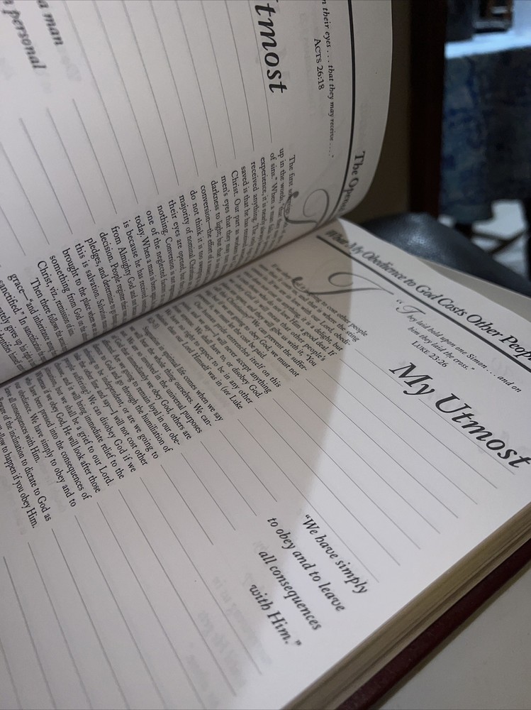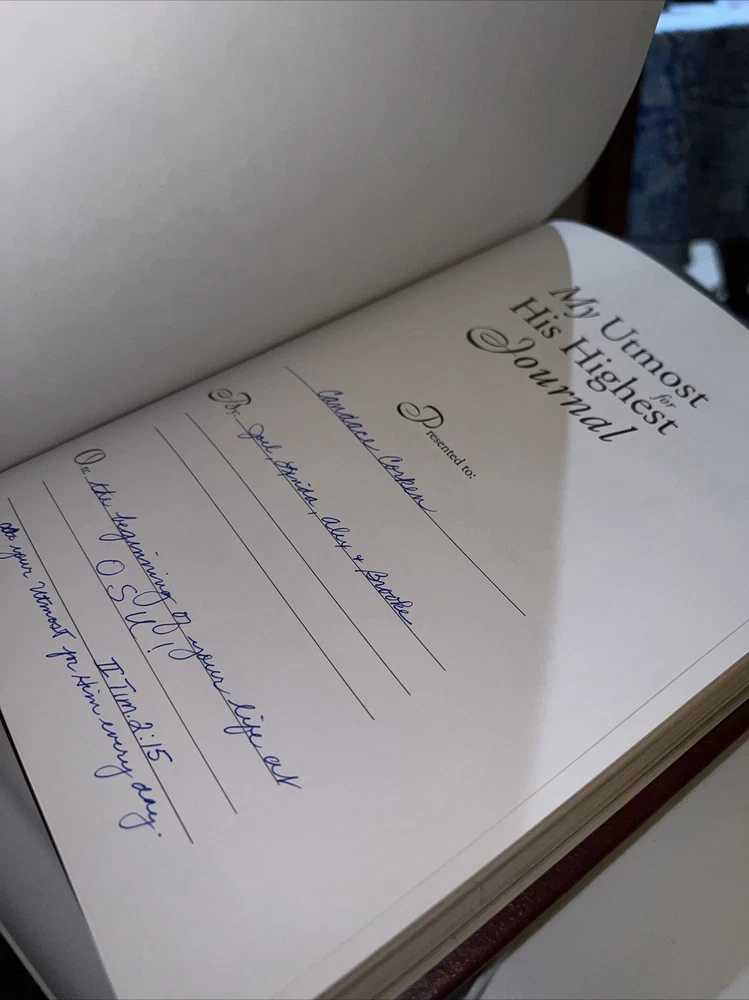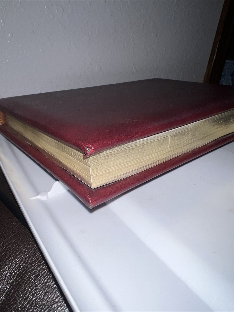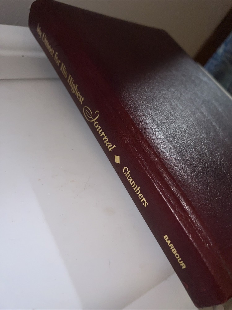 Genuine bonded leather presentation page has been filled out. Two days have writing and underlining. The rest are unused beautiful gold gilding on pages edge This daily devotional journal, titled "My Utmost for His Highest," by Oswald Chambers, is a must-have for adults looking for a daily dose of spiritual inspiration. Published by Barbour Publishing, Incorporated in 1995, this hardcover journal has a leather-bound cover and contains 400 pages of nonfiction narrative. The journal measures 9 inches in length, 7 inches in width, and 1.8 inches in height, with a weight of 63.1 ounces, making it a substantial and sturdy item. The journal is a standard edition with no personalization or ex libris markings. It features a variety of aspects, including original language (English), intended audience (adults), and genre (religion). The journal also includes features such as a ribbon bookmark and page-a-day format, making it perfect for daily use. Whether you're a long-time fan of Oswald Chambers or looking to deepen your spiritual practice, this devotional journal is a valuable addition to any collection.