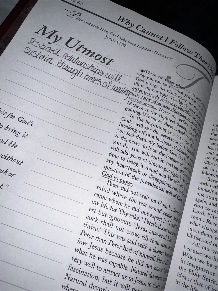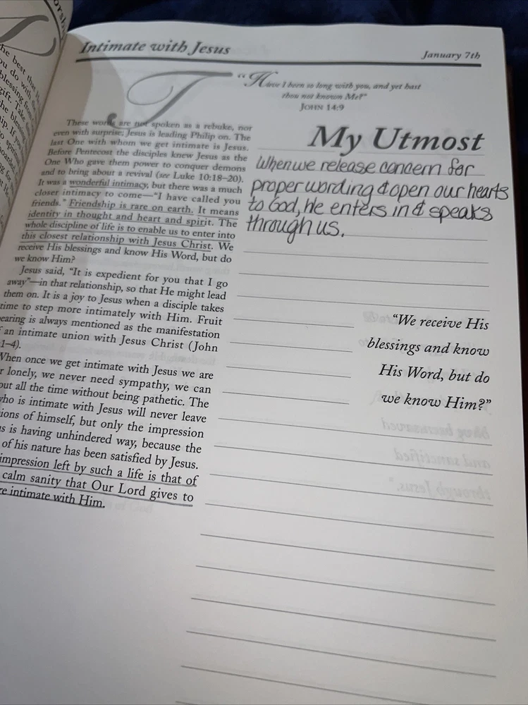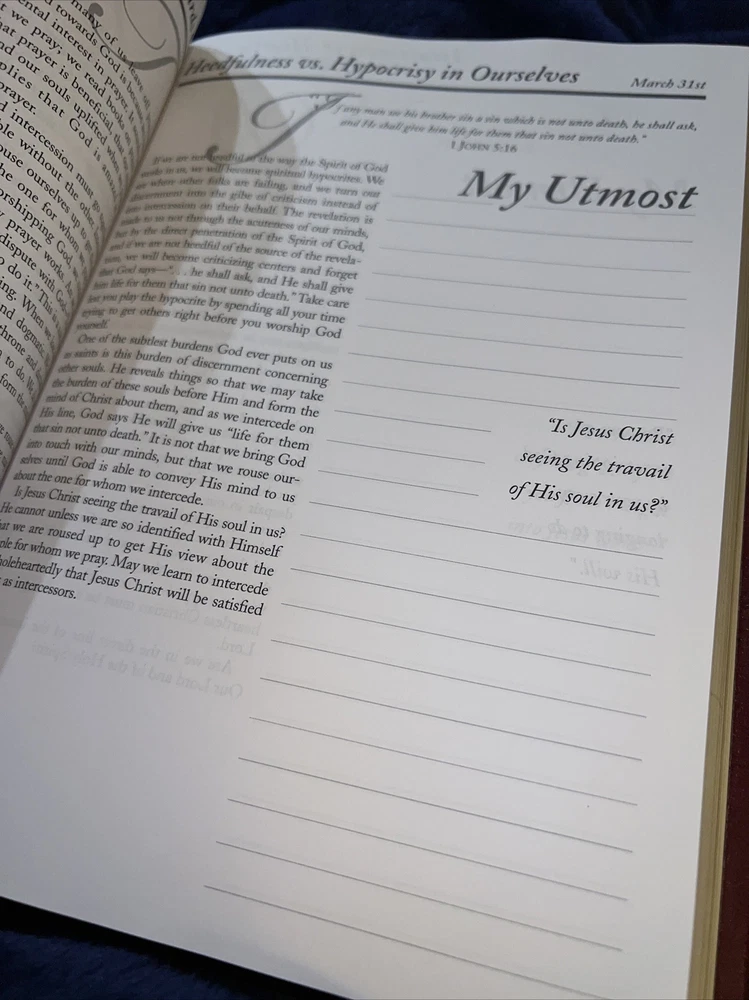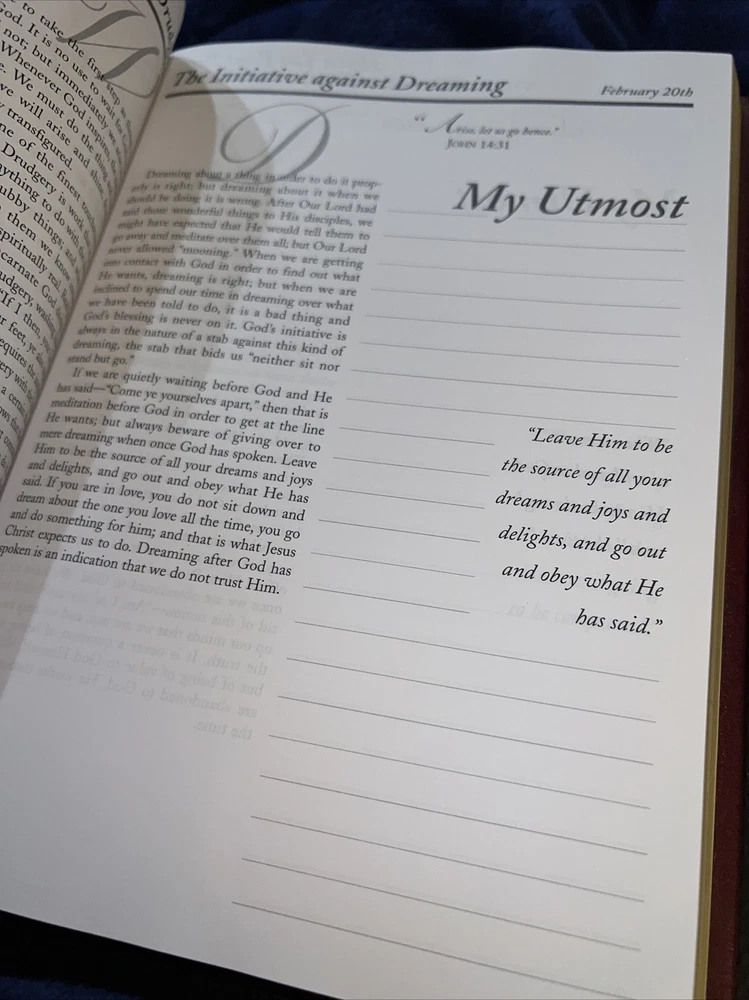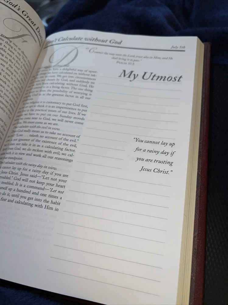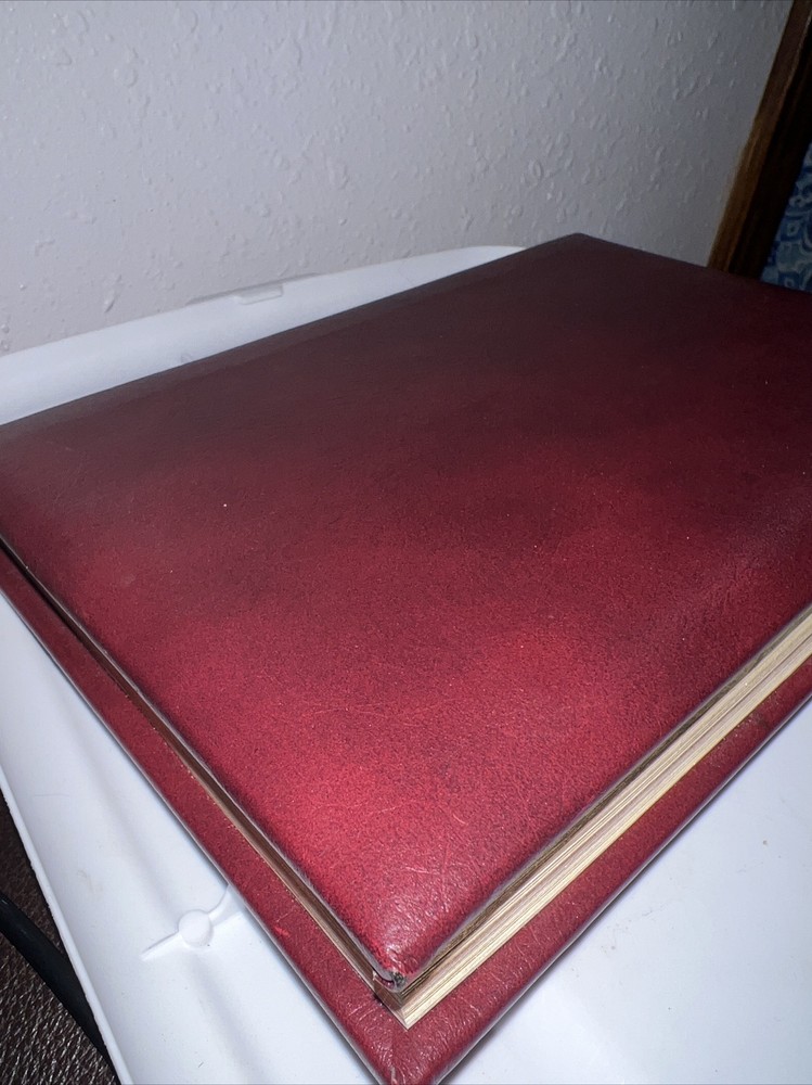 Genuine bonded leather presentation page has been filled out. Two days have writing and underlining. The rest are unused beautiful gold gilding on pages edge This daily devotional journal, titled "My Utmost for His Highest," by Oswald Chambers, is a must-have for adults looking for a daily dose of spiritual inspiration. Published by Barbour Publishing, Incorporated in 1995, this hardcover journal has a leather-bound cover and contains 400 pages of nonfiction narrative. The journal measures 9 inches in length, 7 inches in width, and 1.8 inches in height, with a weight of 63.1 ounces, making it a substantial and sturdy item. The journal is a standard edition with no personalization or ex libris markings. It features a variety of aspects, including original language (English), intended audience (adults), and genre (religion). The journal also includes features such as a ribbon bookmark and page-a-day format, making it perfect for daily use. Whether you're a long-time fan of Oswald Chambers or looking to deepen your spiritual practice, this devotional journal is a valuable addition to any collection.