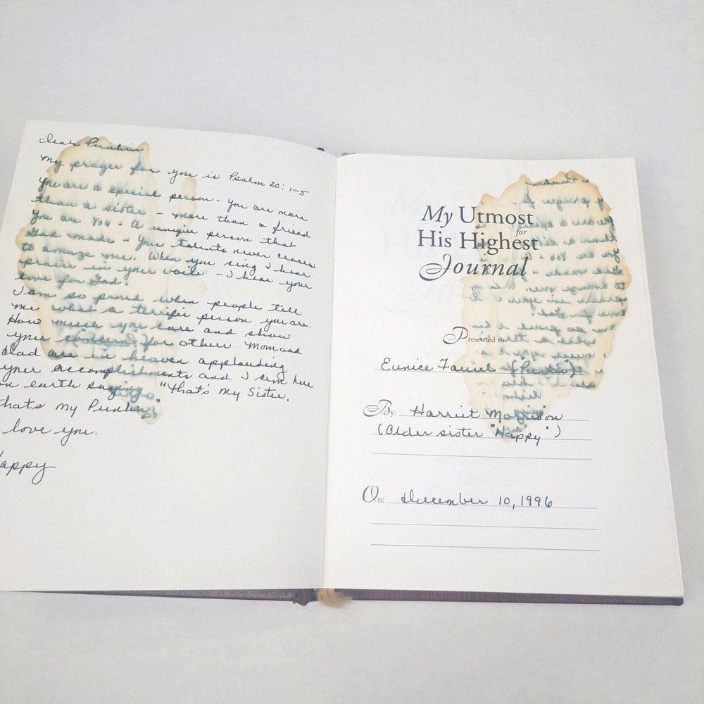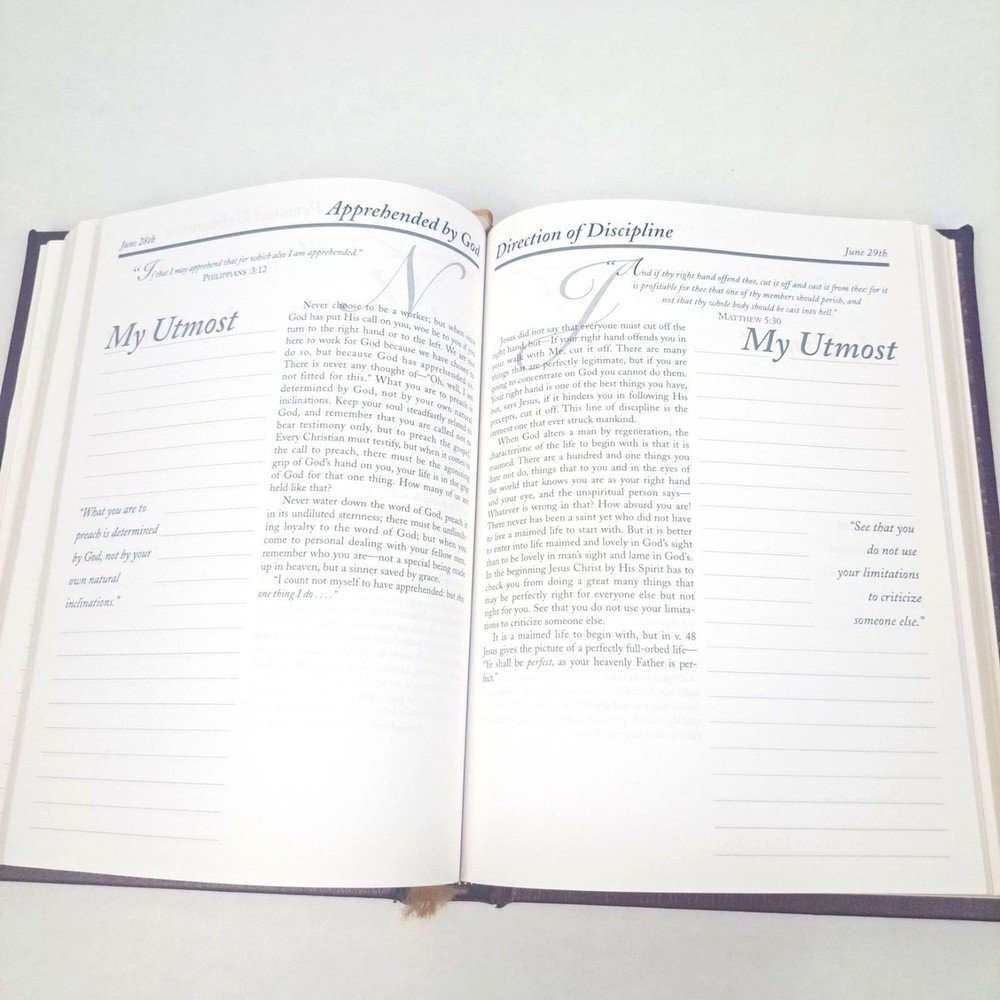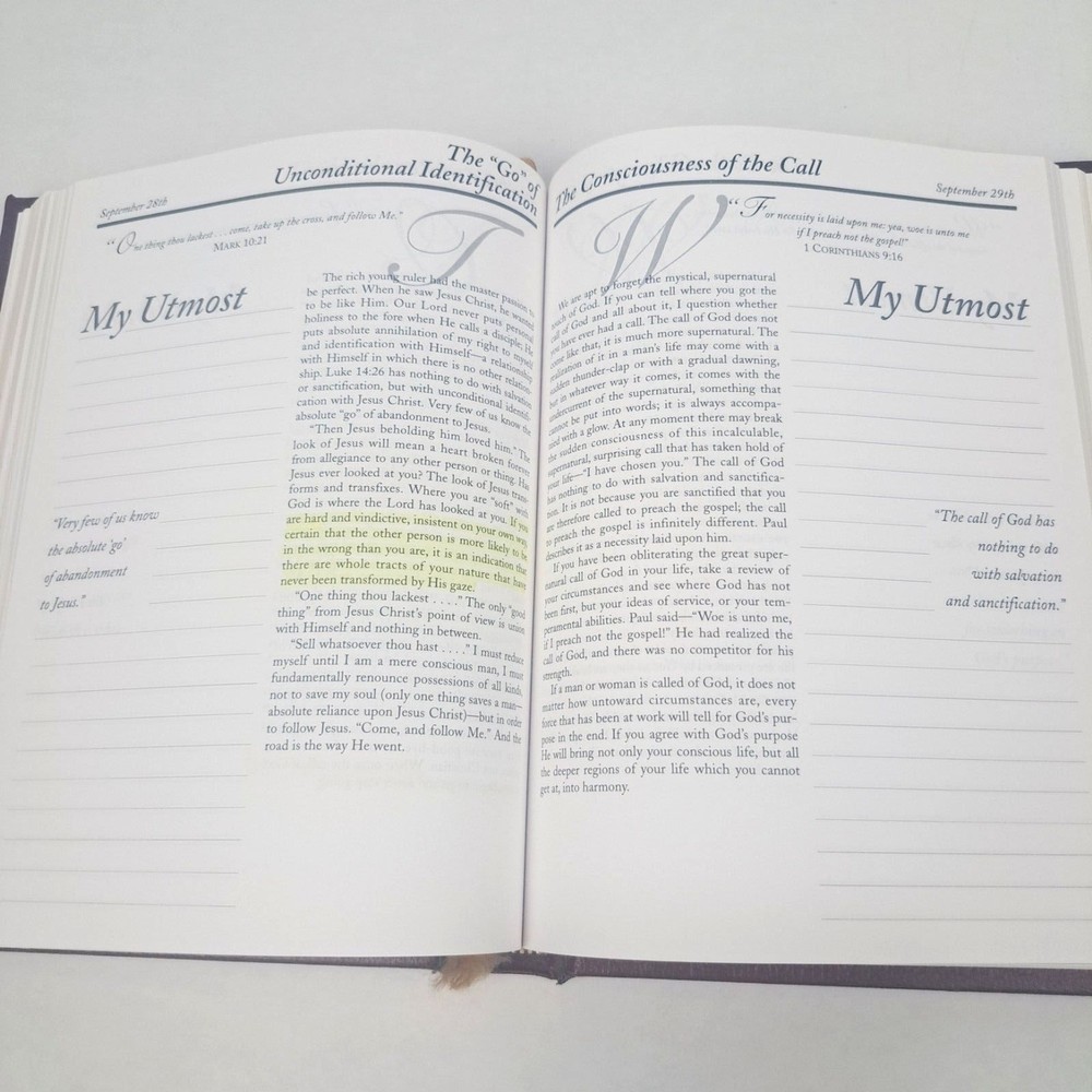 My Utmost for His Highest Journal Genuine Bonded Leather Oswald Chambers 1963 Some stains and inscriptions are in the beginning of the first few pages. The book also has highlighting and some writing throughout the book in the journal area. a.jj Shelf