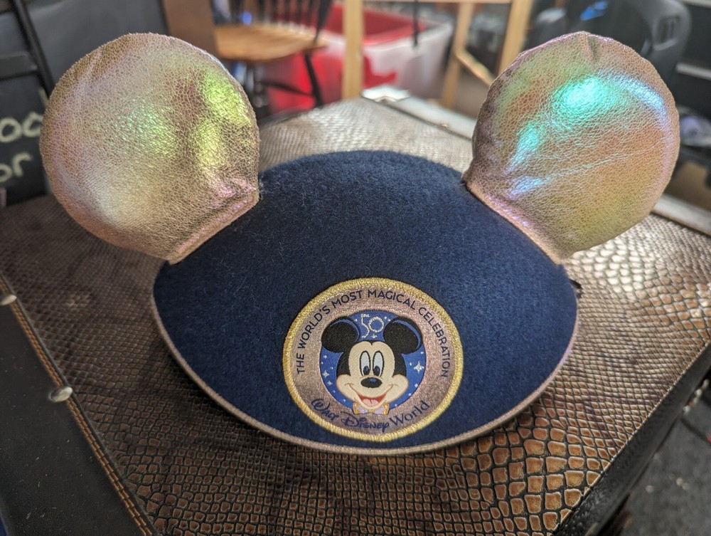 Celebrate the 50th anniversary of Walt Disney World with this NWT Disney Adult Mickey Ear Hat. The hat features the iconic Mickey Mouse ears in blue and gold color and is suitable for both men and women. This collectible item is a must-have for any Disney or Mickey Mouse fan and is perfect for wearing or displaying in your collection. The hat is brand new and never been worn, making it a great addition to your Disneyana collection. Get yours now and join in the celebration of this magical milestone! Purchase with confidence from a seller with a high positive rating and a fast shipping time. Please check out my other listings for other fine collectibles.