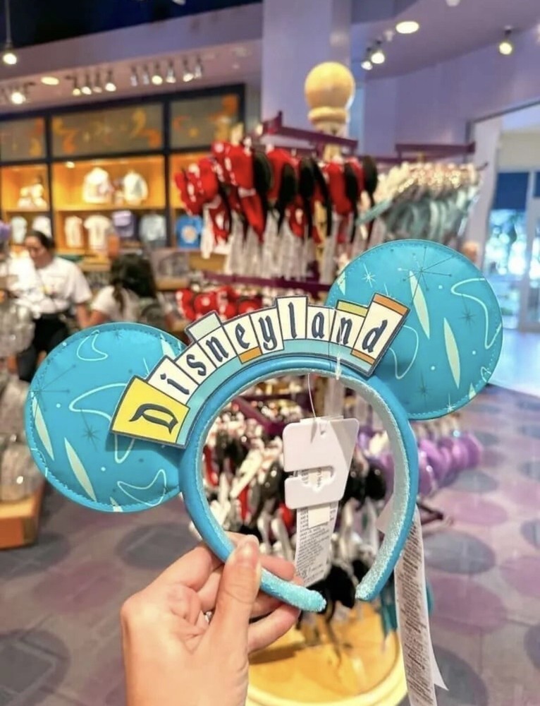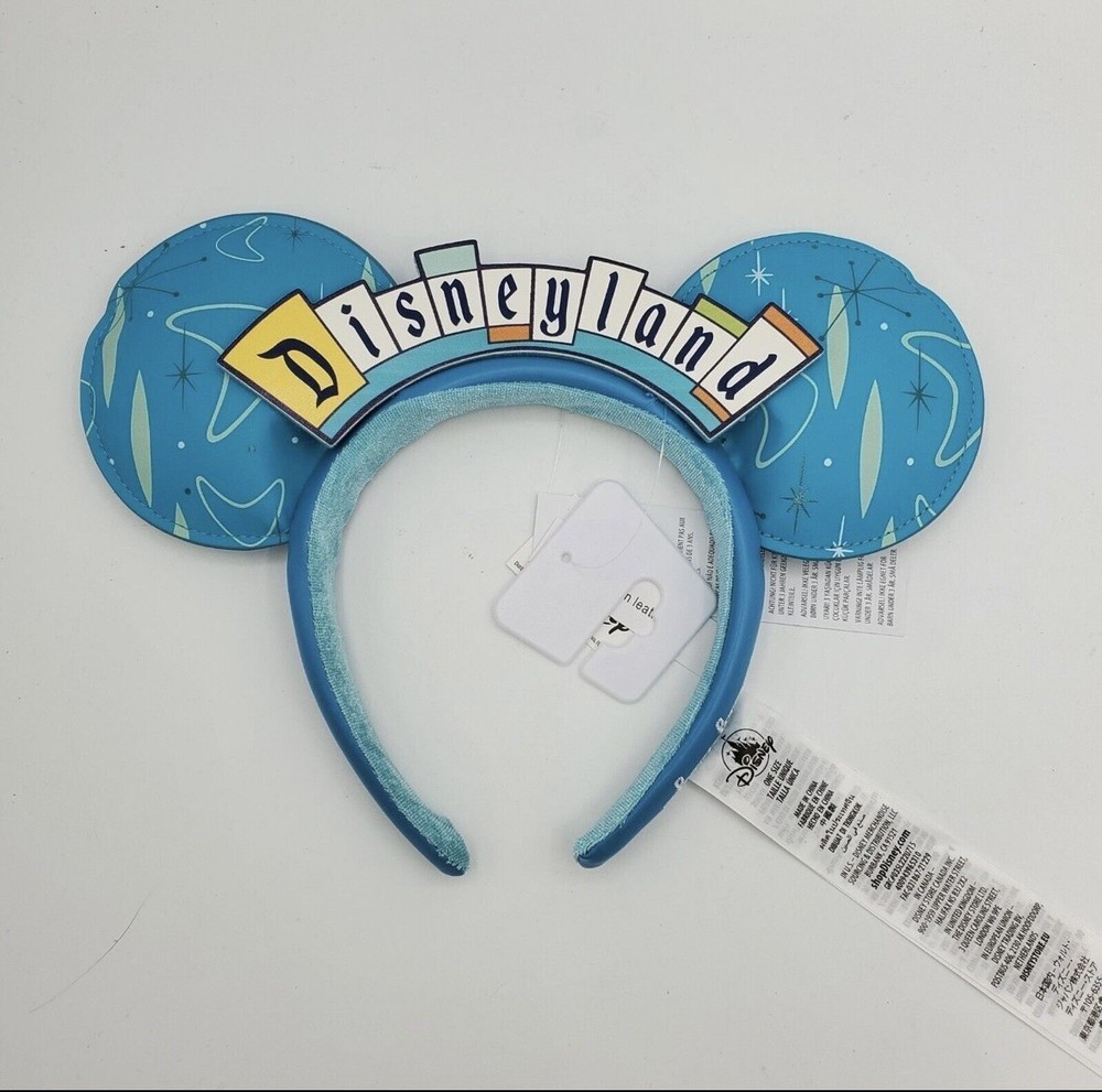 NEW Disney Parks D23 Expo Disneyland Retro Marquee Sign Minnie Ears Headband 2022 The vintage Disneyland logo in place of a bow, along with a throwback ear pattern that reminds us of Tomorrowland. Both the logo and the ears are made with faux leather material.