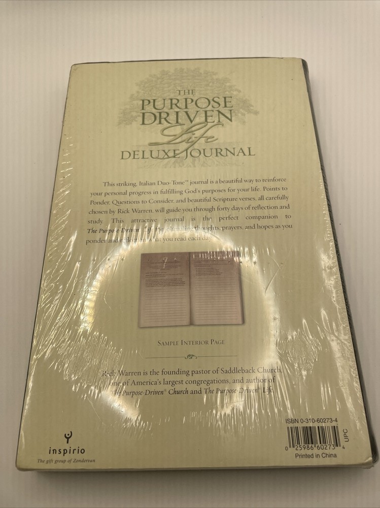 NEW Hardcover (Duo-Tone, may be Leather or a Faux Leather)... The Purpose Driven Life Deluxe Journal by Rick Warren. This striking, Italian Duo-Tone journal is a beautiful way to reinforce your personal progress in fulfilling God's purposes for your life. Points to Ponder. Questions to Consider, and beautiful Scripture verses, all carefully chosen by Rick Warren, will guide you through 40 days of reflection and study. This attractive journal is the perfect companion to The Purpose Driven Life for journaling thoughts, prayers, and hopes as you ponder and reflect on what you read each day. Ships Media Mail on Next Business Day.