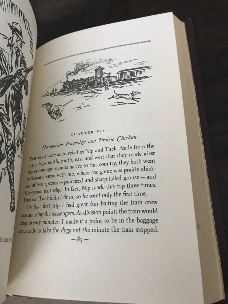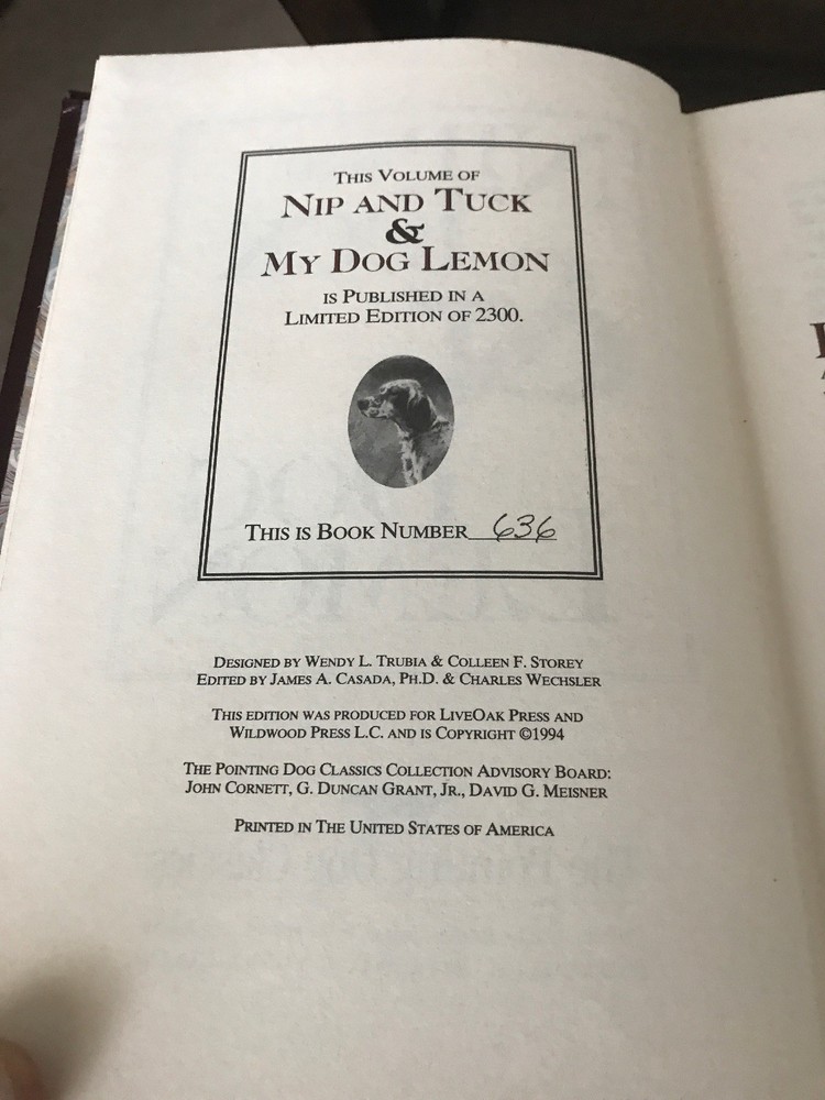 The "POINTING DOG CLASSICS" were published by the LIVEOAK PRESS in collaboration with John Cornett (publisher of Sporting Classics) and Dave Meisner (publisher of THE POINTING DOG JOURNAL). The series of books was short lived and as a result are now very hard to come by. These LIMITED EDITION titles were bound in genuine LEATHER, with hubbed spines accented with precious 22kt gold, printed archival acid neutral pages that are thread-sewn, not just glued. Page ends gilded on all three exposed sides to protect against dust, deep tolled ornamentation into the leather, satin ribbon markers and moire end papers. NIP & TUCK is a collection of hunting tales of grouse, woodcock, pheasant and other upland game with his two beloved pointing dogs (Nip & Tuck,) along the Mississippi Flyway. MY DOG LEMON is the story of a beautiful pointing dog which lacked scenting ability, to which a doctor found a solution to the problem. ************************************ Illustrated throughout with numerous black and white drawing by Art Fuller (NIP & TUCK,) and Weslet Dennis (MY DOG LEMON,) along with black and white photographs by the Holland boys (Bob, Ray Jr., and Dan.) *************************** Beautiful BROWN leather binding ************************** THE BOOK IS IN VERY FINE CONDITION. ************************* LIMITED EDITION OF #636/2300 COPIES. ************************** -6 1/4"by 9 1/4" -edited by Jim Casada -274 pages. ************************************** Raymond Prunty Holland was a "pointing dog man", who hunted all along the Mississippi Flyway. He was the editor-in-chief of Field and Stream, were he created a stable of writers that included Havilah Babcock, Archibald Rutledge, and John Taintor Foote. Along with Nash Buckingham he played a major role in promoting waterfowl hunting regulations and stressing the importance of conserving waterfowl for future generations. At heart Holland was a simple man, one who always enjoyed being afield with his dogs, sons and friends. That simple nature shines through in NIP & TUCK, named for two of his favorite gun dogs. It captures that special bond between man and his dogs. We follow Nip and Tuck from the time thet were whelped along the rollicking road of puppyhood to their bird-flinging days as adults. Holland's love for dogs runs as a common thread through all thirteen stories, though each stand on its own. MY DOG LEMON is collection of four stories of a dog which lacked scenting ability and the manner in which a Connecticut doctor found a solution to the dogs problem. One of the most popular of all fictional works about dogs, this enduring tale ranks along side Corey Ford's THE ROAD TO TINKHAMTOWN and John Taintor Ford's immortal cannine classics. Ray Holland writes in a relaxed fashion which is the hallmark of great storytellers. His stories have a timeless quality, and readers of the modern generation who have not made Holland's acquaintance have a treat in store. His prose wears well, like a comfortable old slipper. These are the sort of tales one likes to have close at hand, by the bedside or easy chair. They are bound to give any fan of bird dogs, any lover of stalwart points and scintillating retrievers, an ample measure of pleasure, enjoy. ************************* THIS SERIES WAS SHORT LIVED AND THE TITLES ARE VERY DIFFICULT TO FIND!