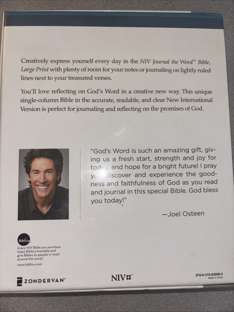 The NIV Journal The Word Bible Large Print is a special edition Bible with large print text, making it easier to read and study. Featuring messages from Joel Osteen Ministries, this Bible is designed to provide inspiration and guidance through the words of the author. With a focus on positivity and motivation, this Bible is a valuable resource for those seeking encouragement and insight in their spiritual journey. New open box flaws pictured