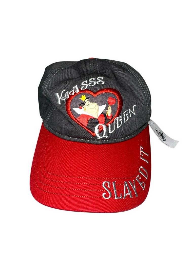Embrace the whimsy of Disneyland with this striking Queen of Hearts “SLAYED IT” cap, inspired by the beloved Alice in Wonderland story. Crafted by Disney Parks, this hat is a colorful nod to one of Disney's most iconic villains, featuring a bold red and black color scheme that's sure to stand out in any crowd.