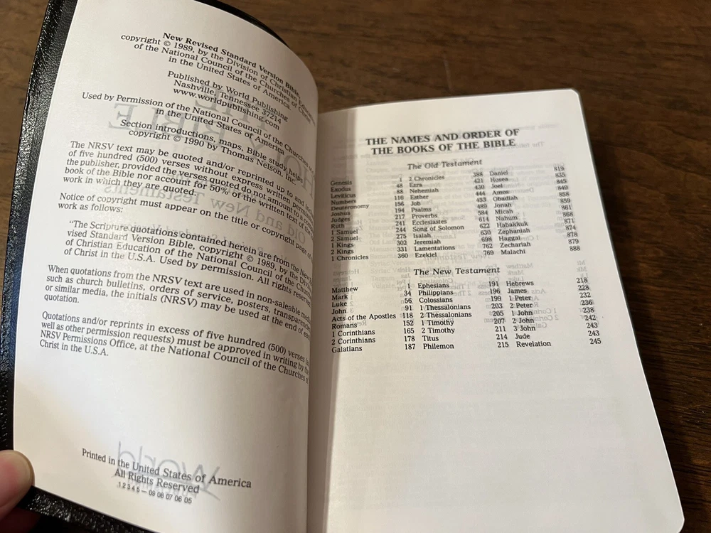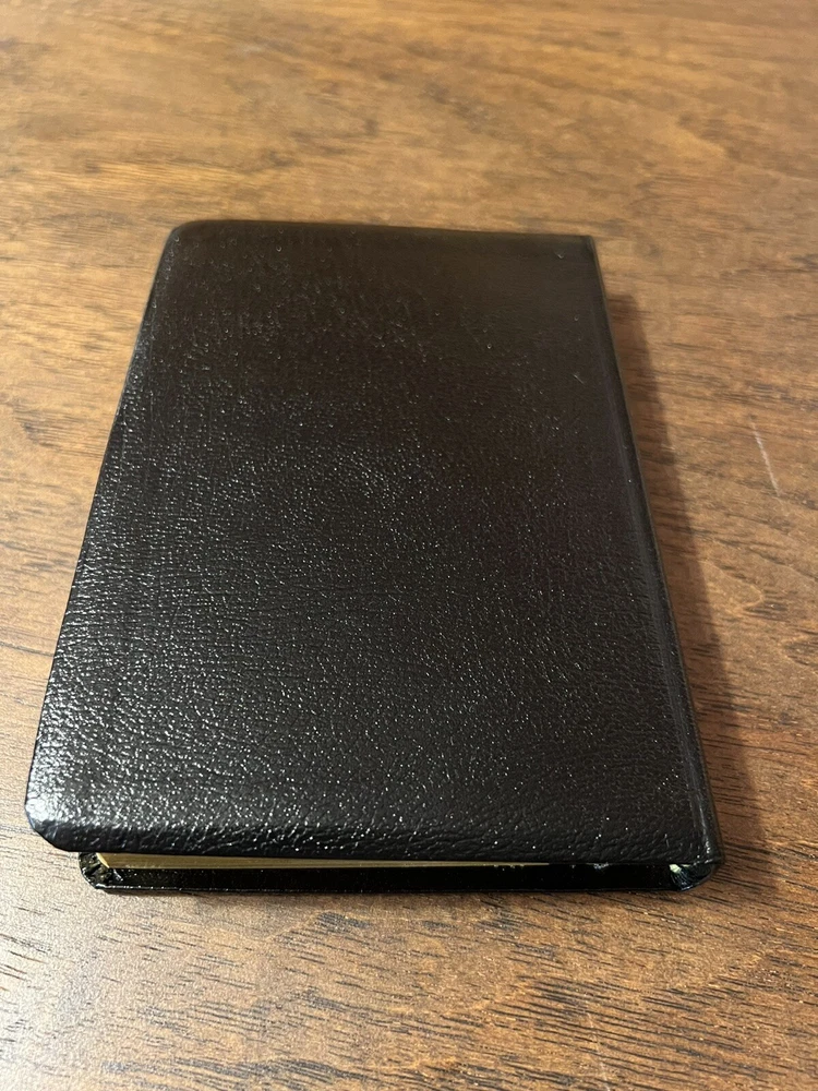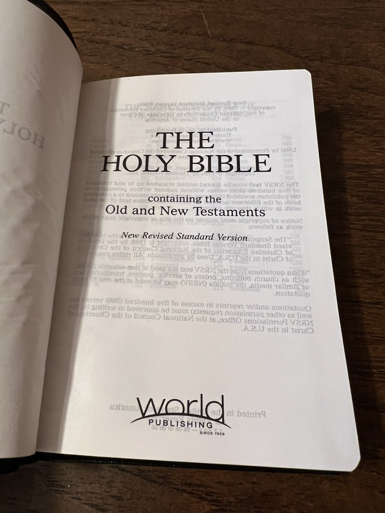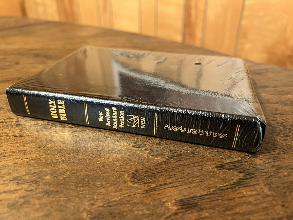 Nelson Augsburg Fortress Press New Revised Standard Version NRSV Bible Leather A lovely, black, gilded, unread Nelson text block, published by World and Augsburg Publishers. This is a rare compact NRSV amongst the relatively few compact editions available. This text block is unique in that it uses pronouncing text. The leather is flexible and the text block is mint and unread as I opened it just for the purpose of taking pictures. Almost every page still sticks. The paper quality is fantastic! Black letter Double column 6.9 x 4.75 x .75 inches Dime used for comparison Note: I do not accept returns unless the item was not as I described because of a mistake I made. If the item is smaller than you thought it would be (because you didn’t read the description with dimensions), that’s on you. I do not cancel orders for any reason, even if you accidentally ordered it. It takes about 3 steps to purchase an item, so if you paid for it, it’s yours. I make these annoying rules because so many customers have recently treated the purchase of items flippantly and I have to draw a line somewhere. Well, here it is. I always list any writing, stains, tears, or imperfection of any kind. And I always list the condition conservatively, so you should expect the item to be in better condition than listed. Unlike the vast majority of sellers out there, I refuse to hide imperfections through cleverly taken pictures or obscure descriptions. I try to include as many pictures as necessary to highlight the imperfections rather than the beauty of the items, which is part of why I have an elevated Seller Status and perfect feedback in which many consistently report back “just as described” or “better than described.” If I miss something by accident, please contact me so I can make it right. My flawless feedback should speak for itself, but you won’t be disappointed! Thank you for your business and God bless!
