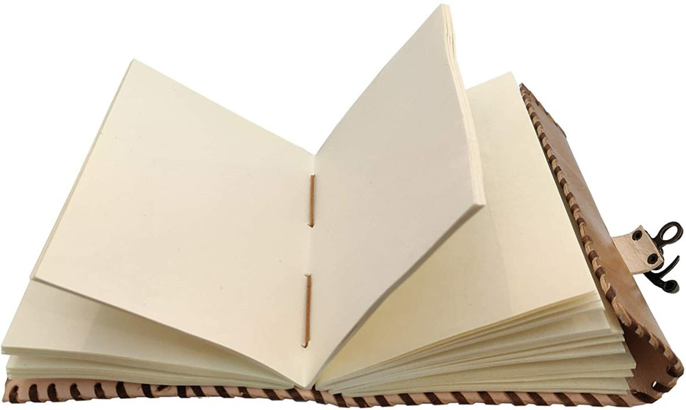 Dimensions: 7" x 5" inches Approximately 150 pages of plain, handmade Indian recycled cotton paper Handmade in India utilizing traditional craftsmanship and techniques which have been passed from generation to generation. Each journal is carefully hand bound with acid-free Plain Cream recycled cotton pages suitable for use with any type of pen for all everyday writing tasks. Handmade from genuine leather with a smooth skin texture, a smart design with a cool leather wrap.