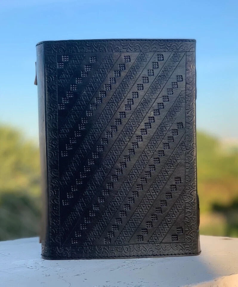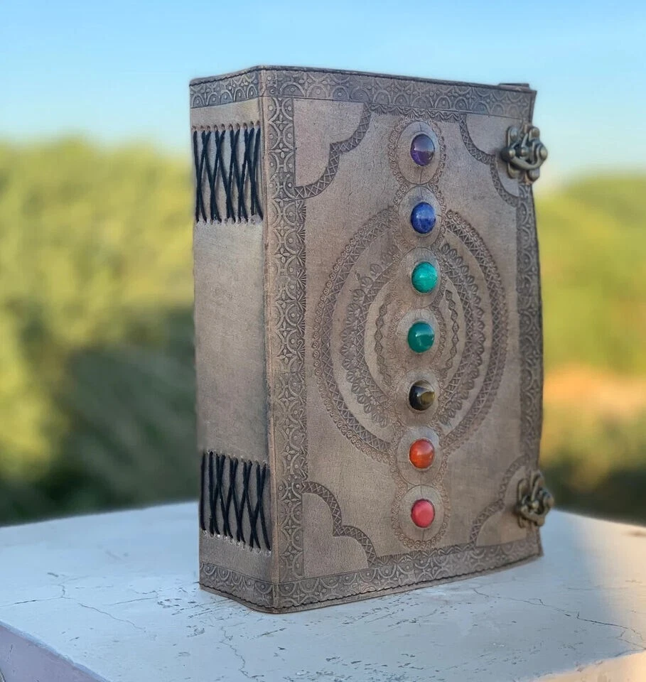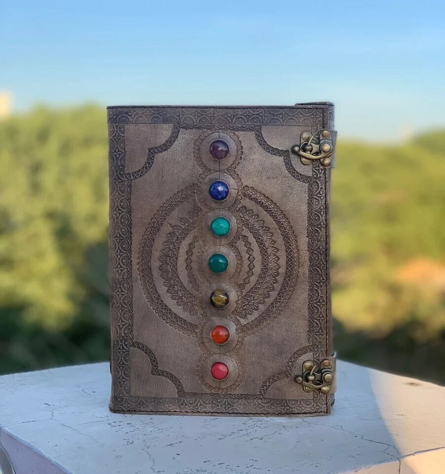 Extra Large Leather Journal Seven Stone Embossed Notebook With Blank Papers Personal Journal For Writing Mother's Day Gift For Her Gift For Mothers Handmade leather journal with seven different stone ( Semi Precious ) embedded and aligned in the center of the book. Size 10X7X3 Brown color extra large journal provided with 2 brass lock for enclose at corner edge for enhancing the distressed look of journal. Hand embossed notebook chakra design around all the 7 different stone which give a detailed fine handmade look to journal. Amazing embossed done on the front and the back side. Provided with 610 Sheets of paper ( pages counting on the both side ) Perfect for Gifts - Suitable for men or women this blank paper personal journal is a perfect gift for mother, writers, your loved once , family members, relatives, occasions, etc. This amazing journal with lock can be used as a handmade journal, refillable journal, embossed journal, personal journal, stone journal, spell book, journal with stones, book of shadows, etc. We guarantee high quality products and unique design. All made especially for you.