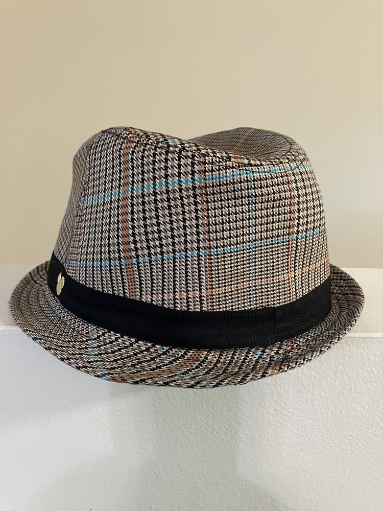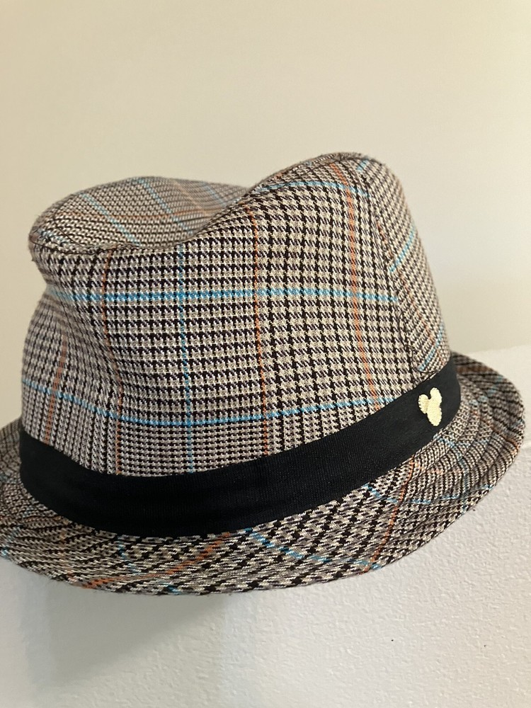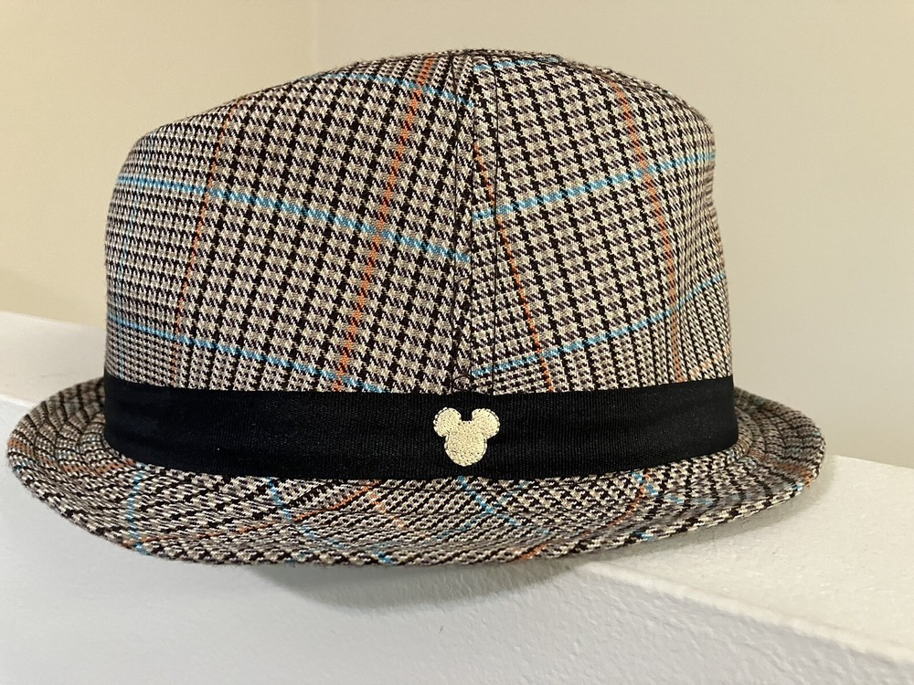 Add a touch of Disney magic to your wardrobe with this brand new tweed plaid fedora hat featuring the iconic Mickey Mouse logo. The hat is suitable for both men and women, with a size of 23.5 inches around, 3.5 inches deep, and a 1.5-inch brim. The hat comes in a beautiful combination of brown, beige, orange, and turquoise colors that make it stand out in any crowd. This authentic Disney item is part of the contemporary Disneyana collectibles and is made in China. Ideal for fans of all ages, this Mickey Mouse fedora hat is a must-have for your hat collection.